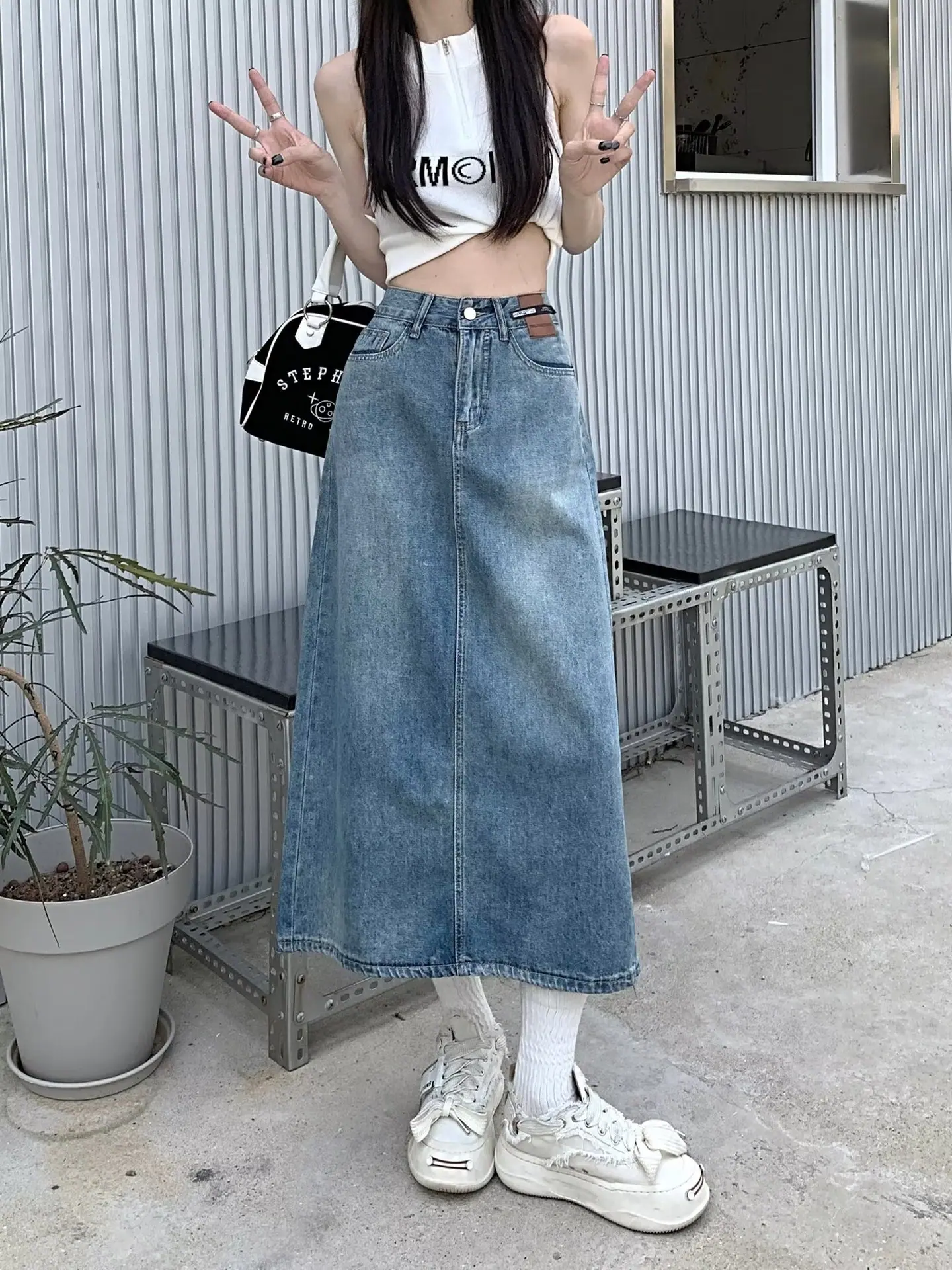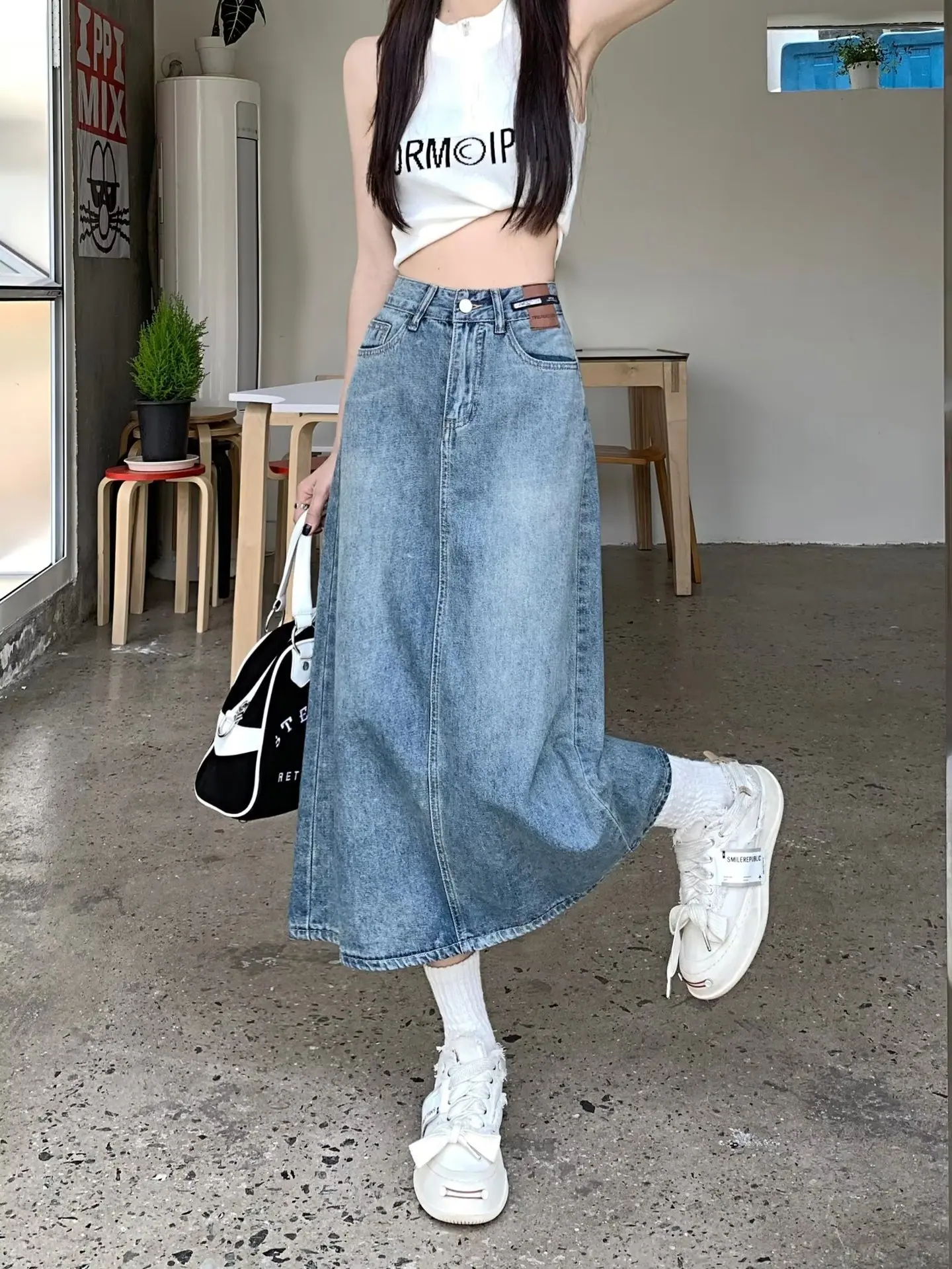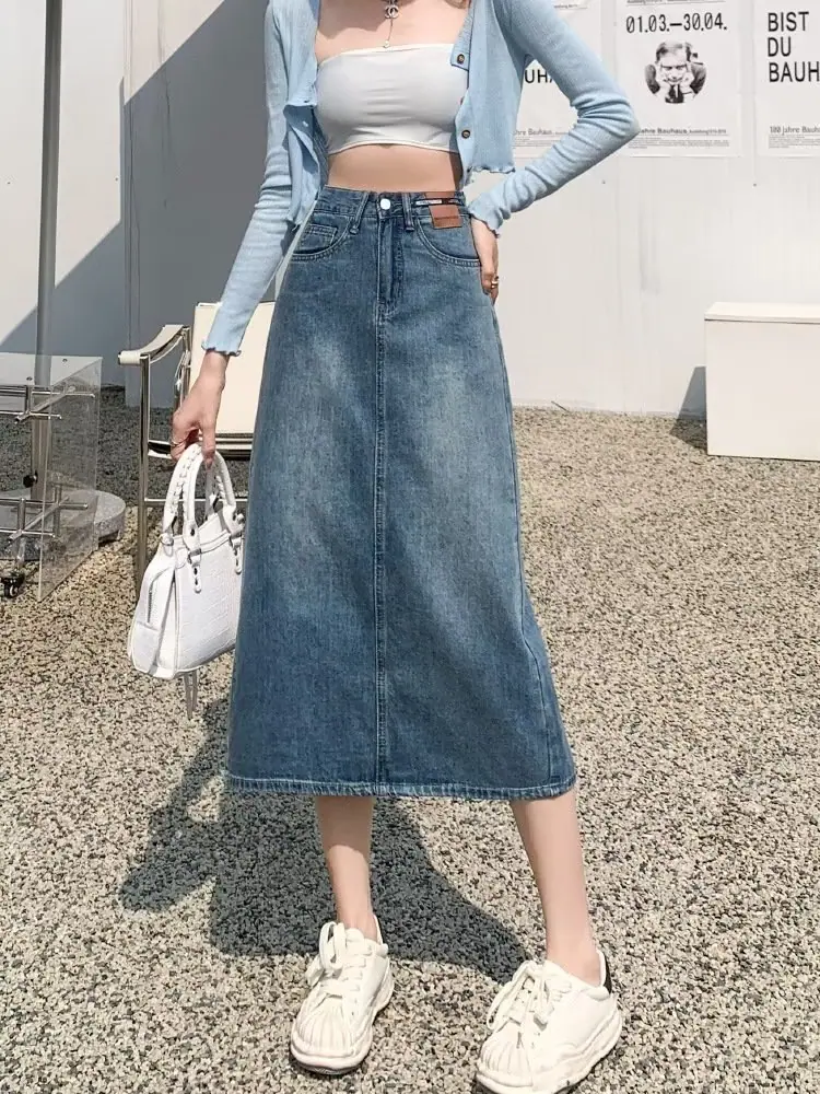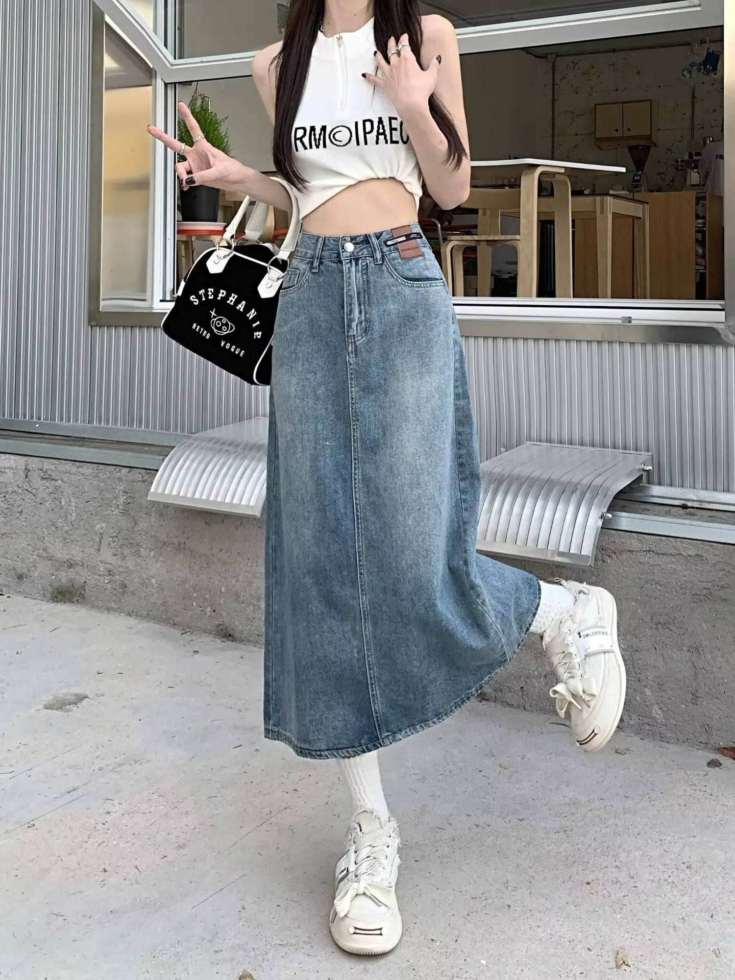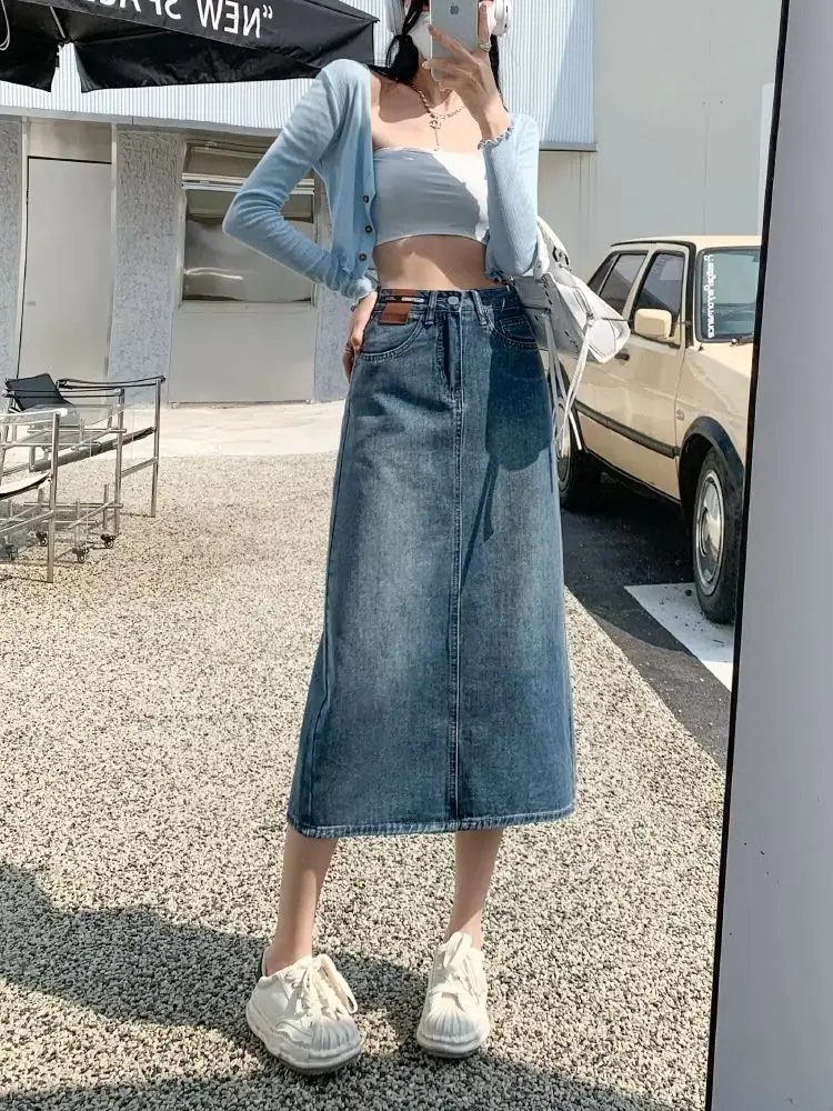Falda Vaquera Retro con Abertura para Mujer Corte A 2023 Primavera Nueva Cintura Alta Slim Media Longitud Falda Larga Verano