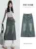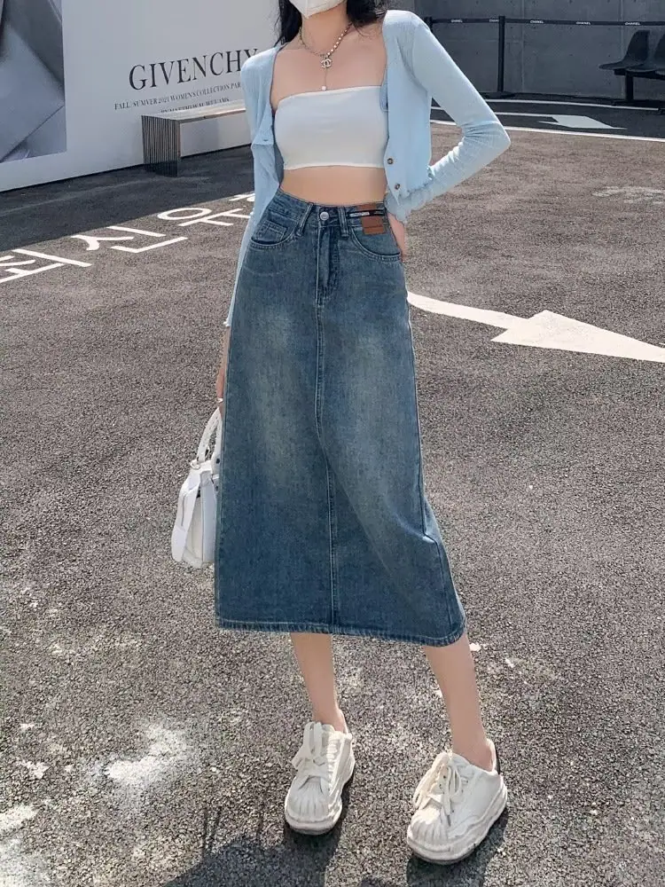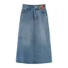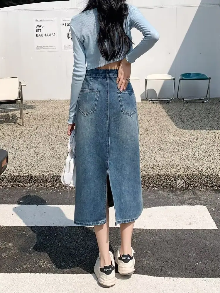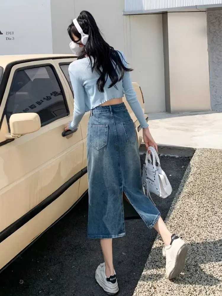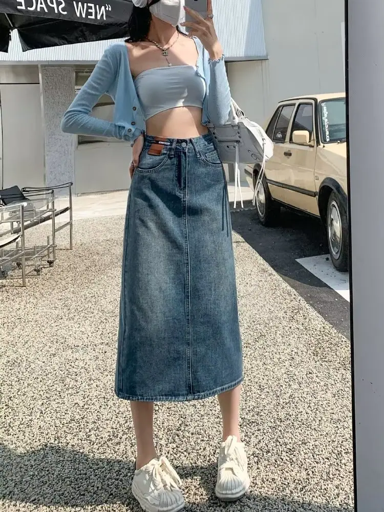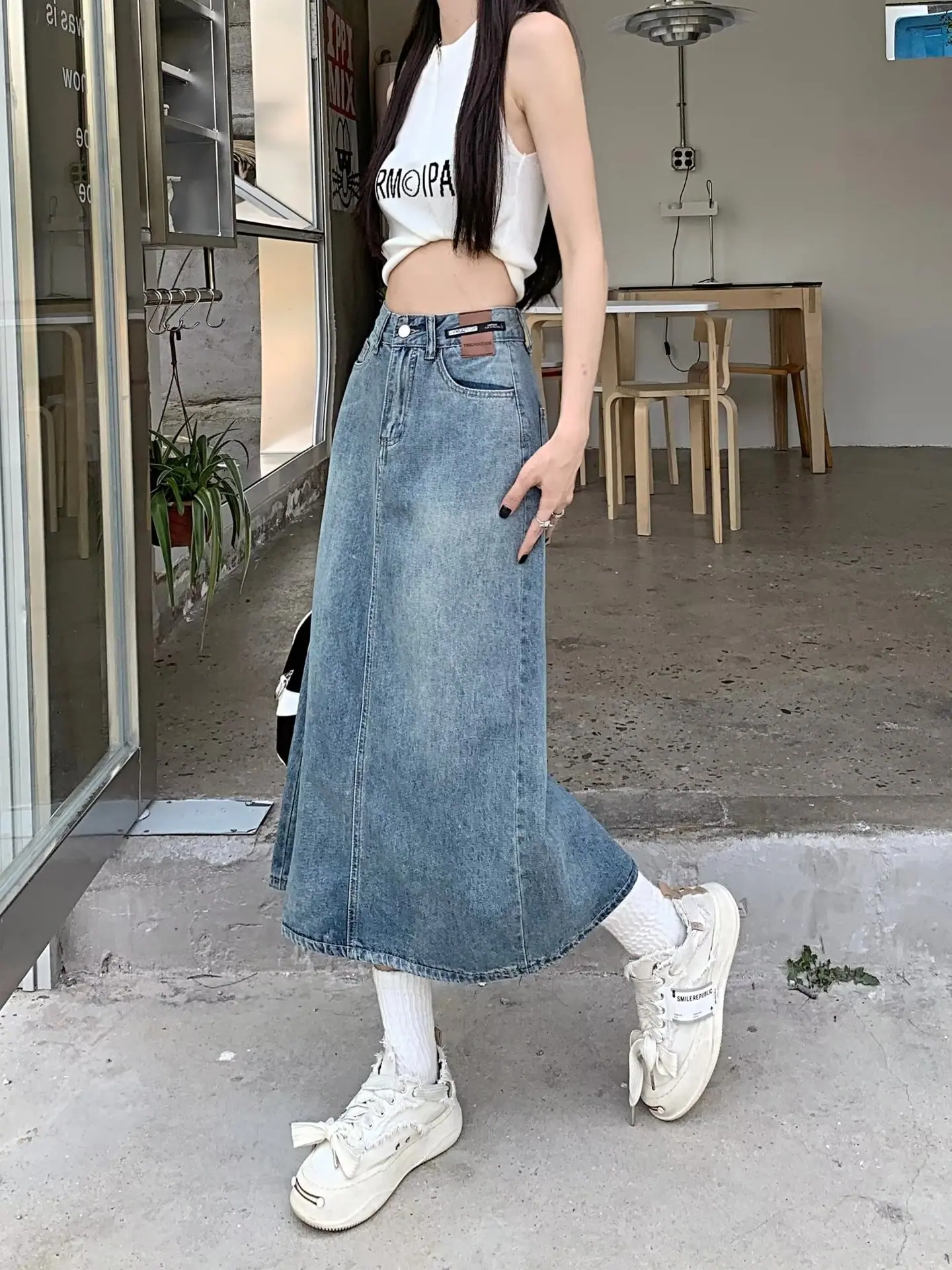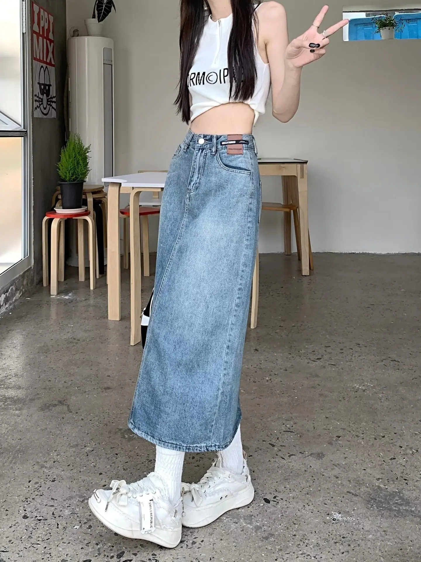 Falda Vaquera Retro con Abertura para Mujer Corte A 2023 Primavera Nueva Cintura Alta Slim Media Longitud Falda Larga Verano
