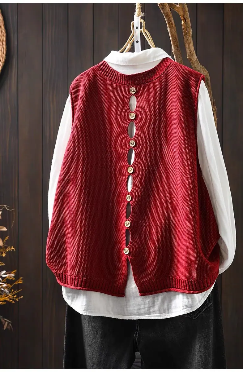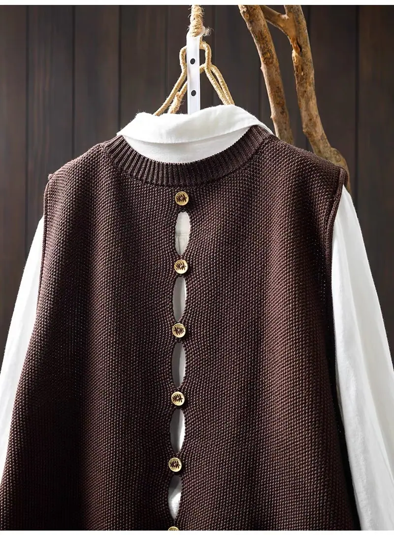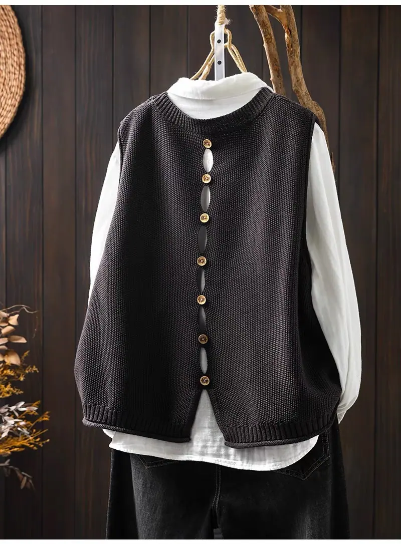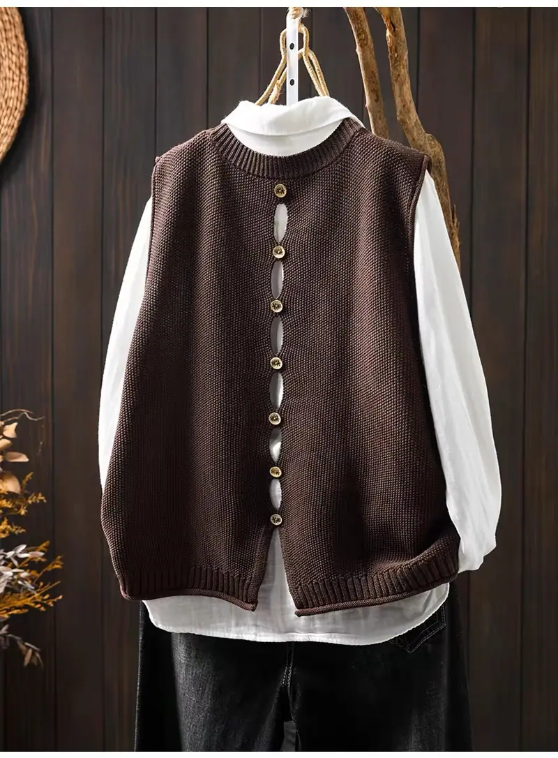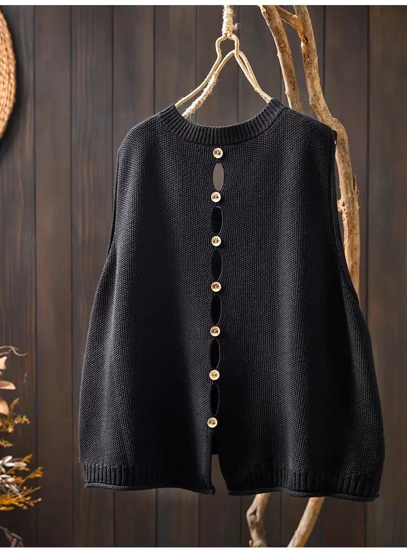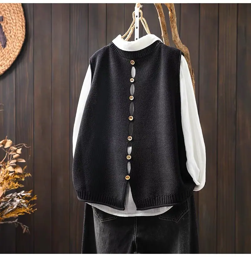 Primavera y Otoño 2024 Nuevo Chaleco de Punto de Algodón con Botones en la Espalda sin Mangas para Mujer Holgado Versátil para Capas Cárdigan sin Mangas