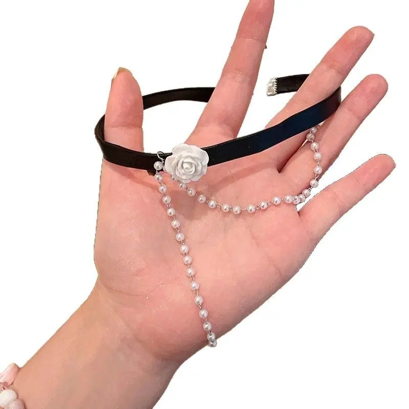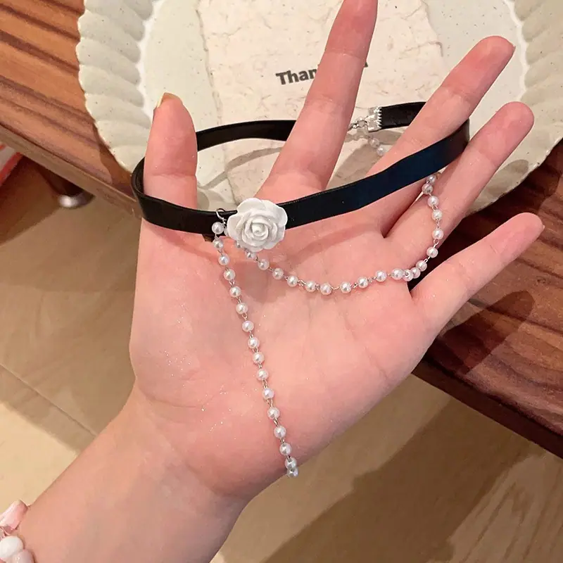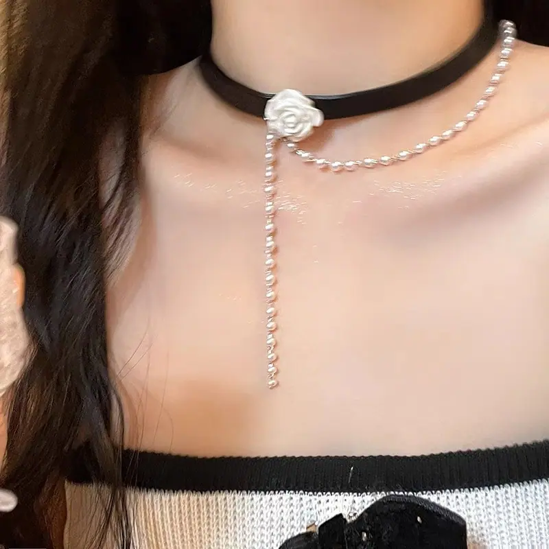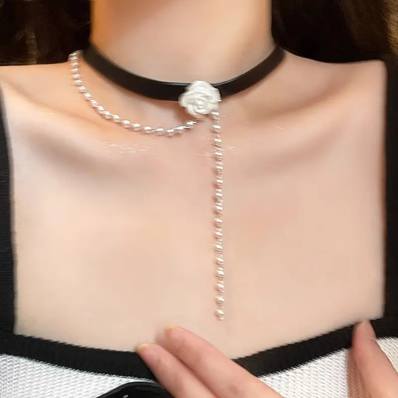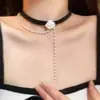 Gargantilla de perlas rosas de lujo ligero de alta gama collar negro cadena clavícula nicho personalidad atuendo collar
