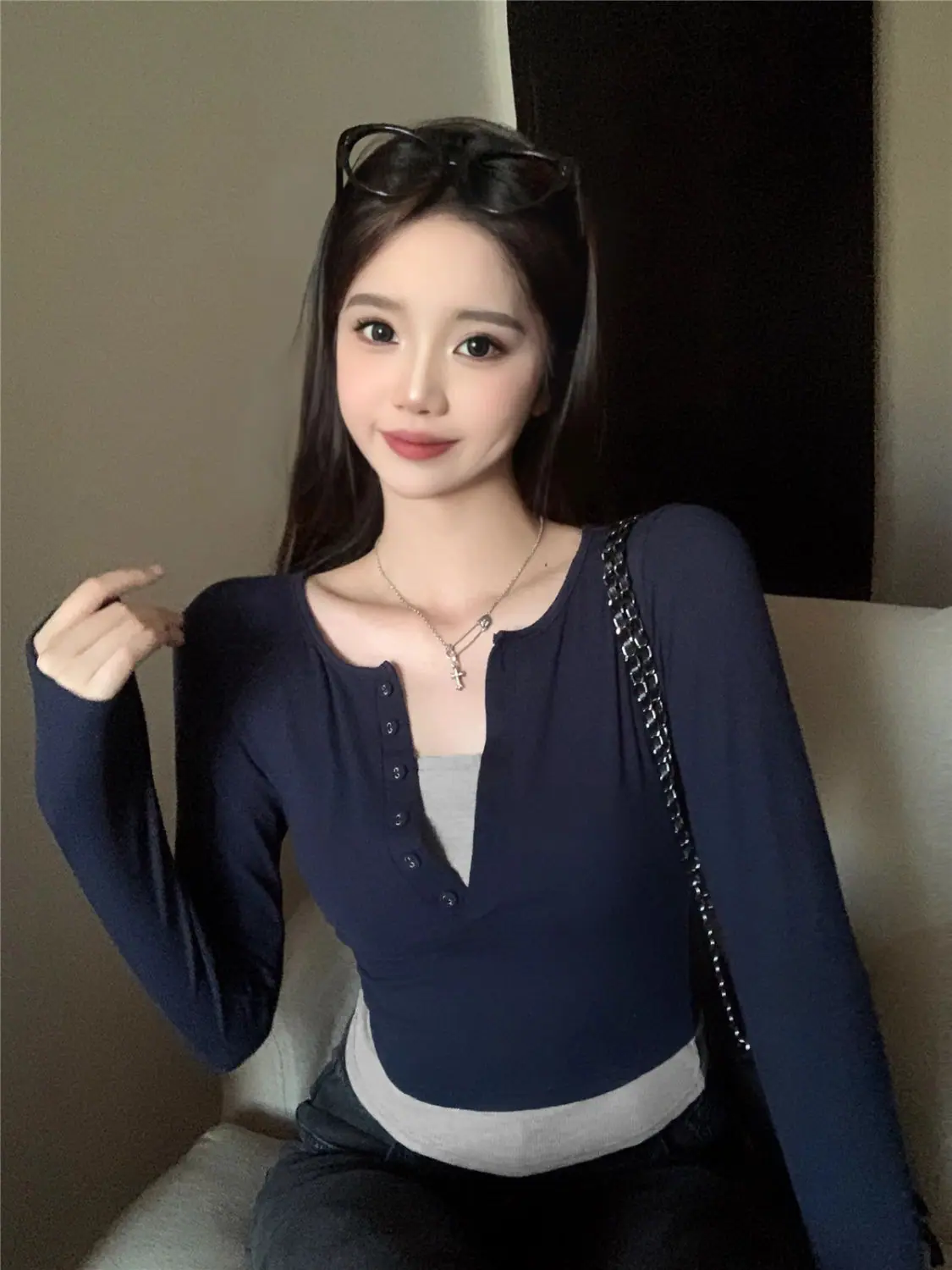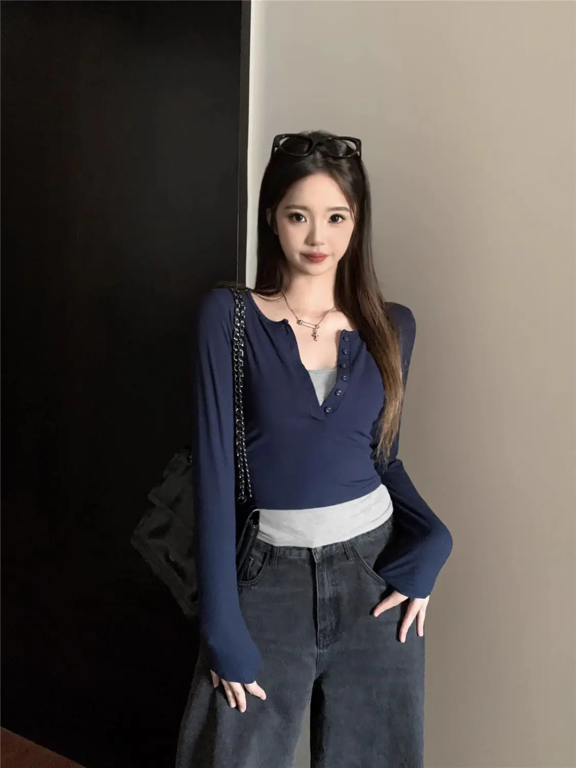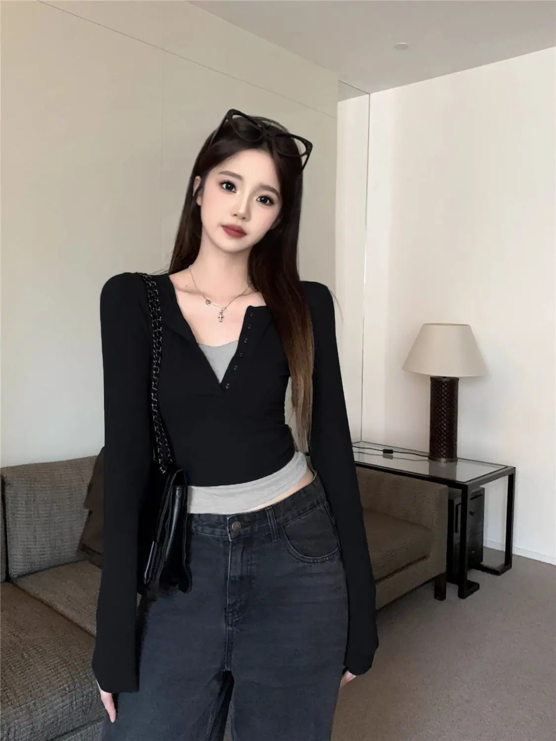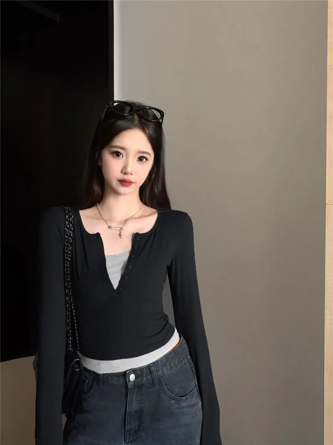 Camiseta de manga larga corta ajustada de dos piezas falsas con sentido del diseño, otoño nicho chica hot casual patchwork top ins mujeres