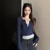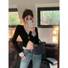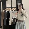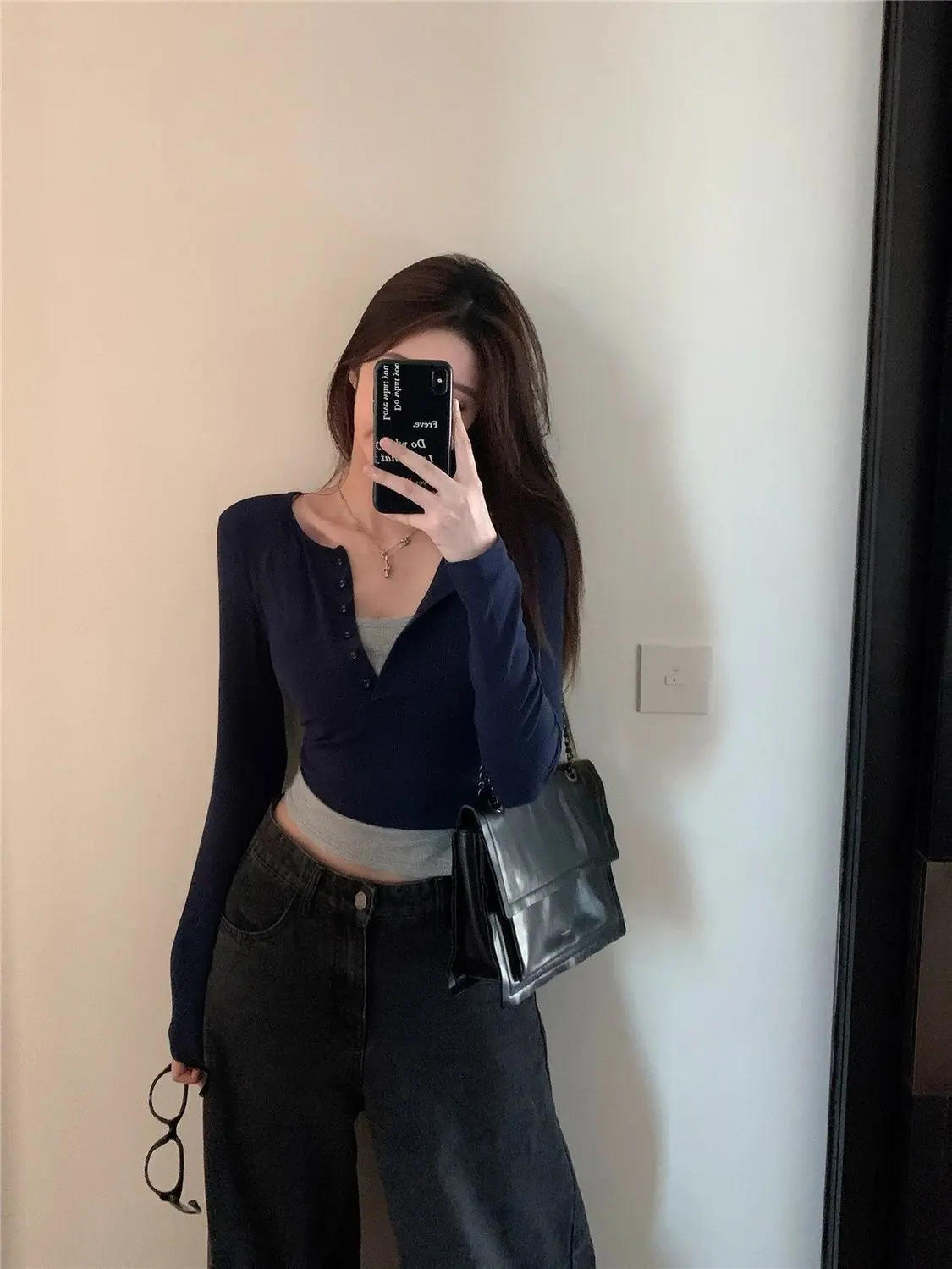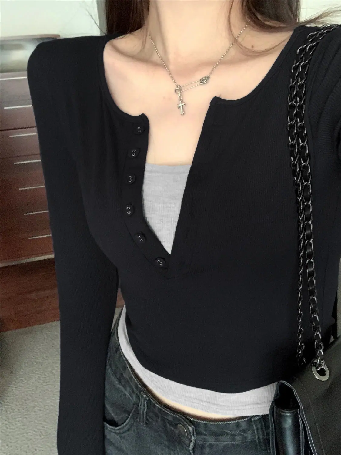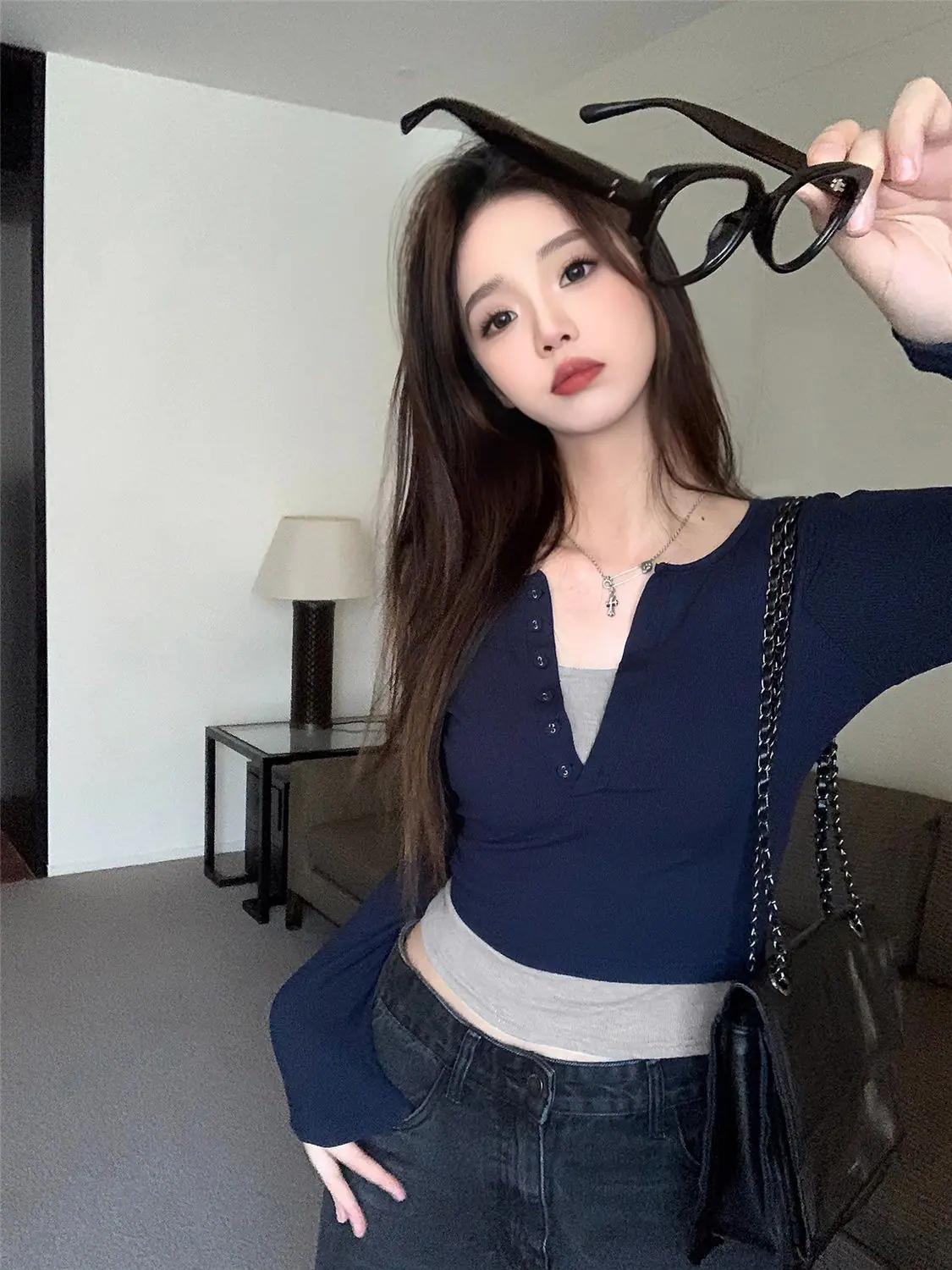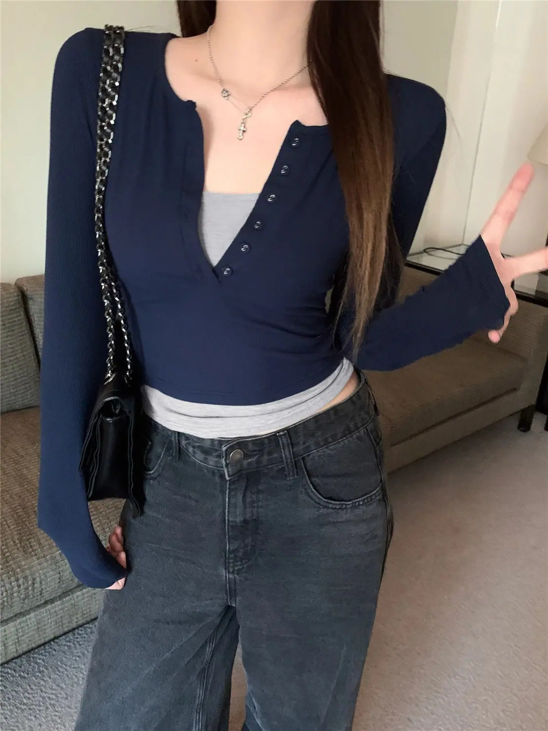Camiseta de manga larga corta ajustada de dos piezas falsas con sentido del diseño, otoño nicho chica hot casual patchwork top ins mujeres
