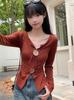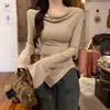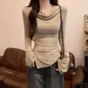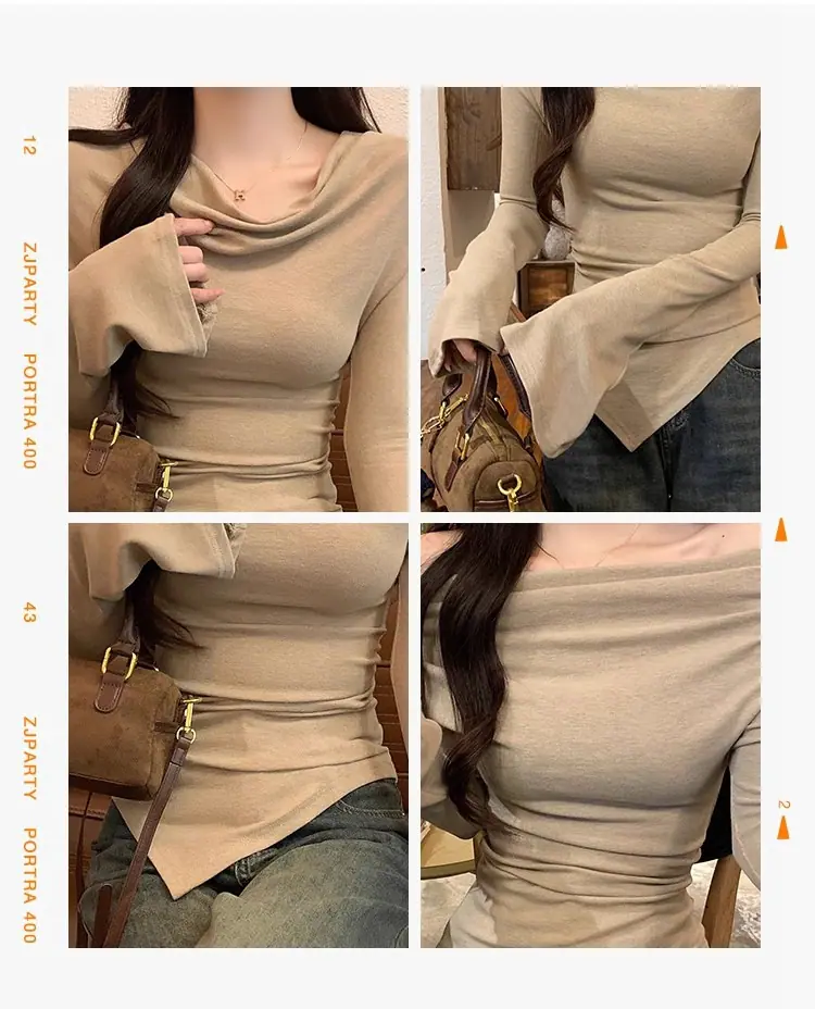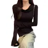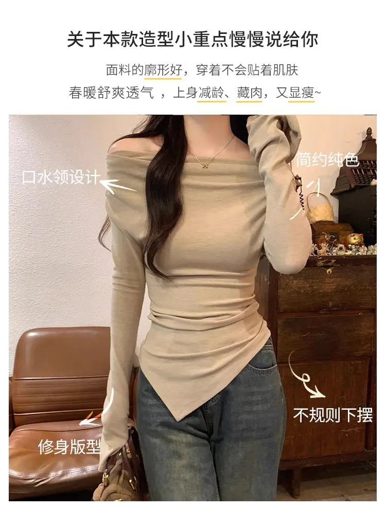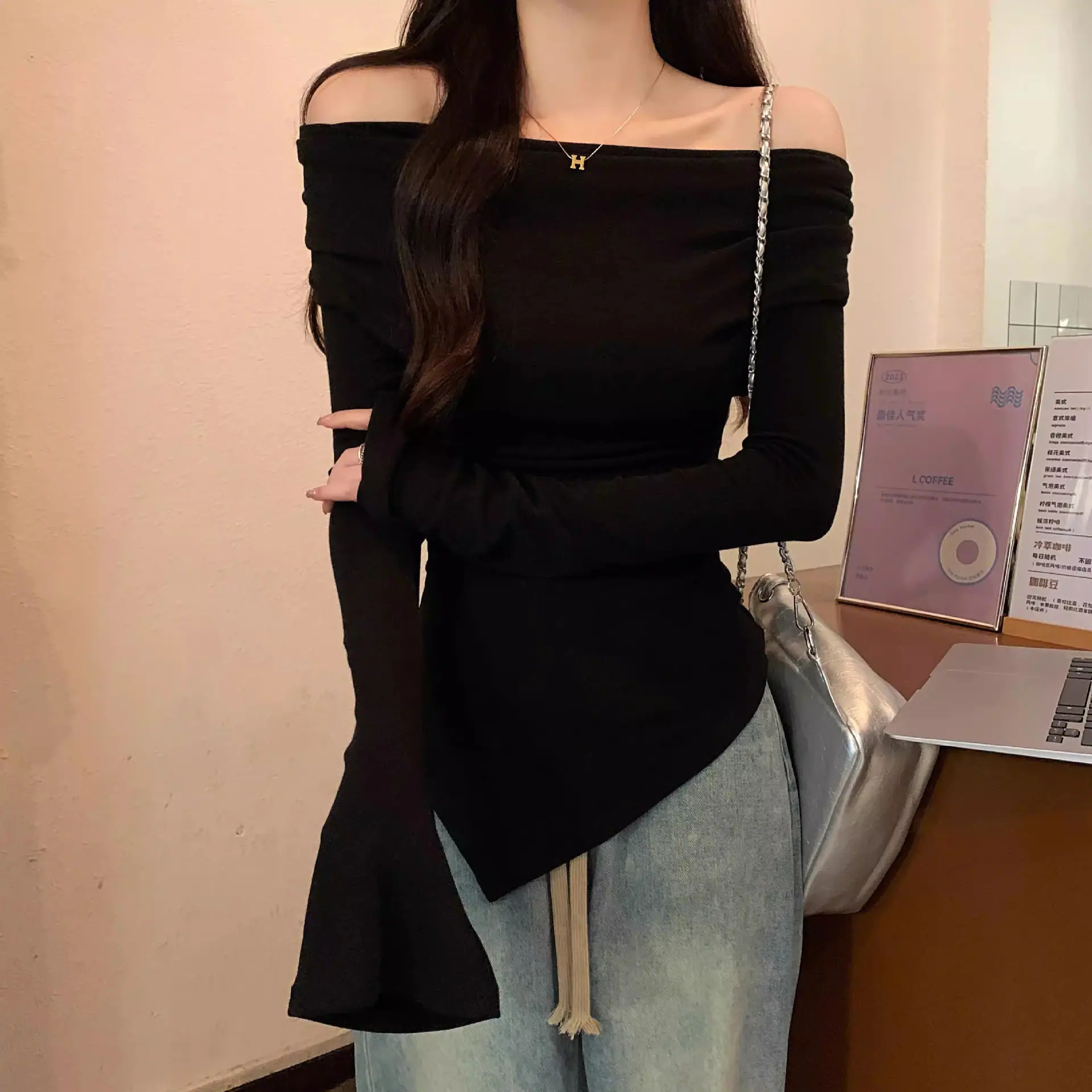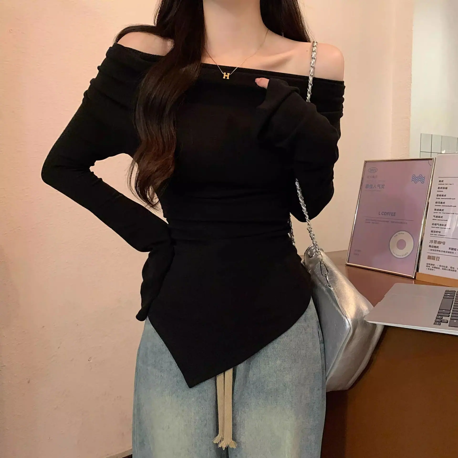 Camiseta de Manga Larga con Hombro Descubierto para Mujer Primavera Otoño Chica Picante Primavera Ajustada Clavícula Diseño Irregular Nicho Top Corto