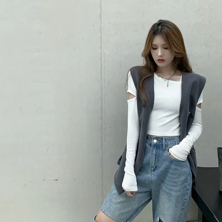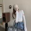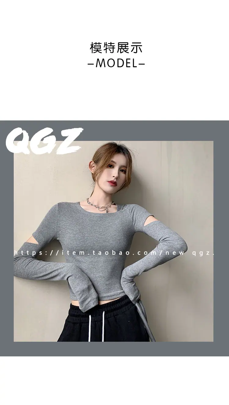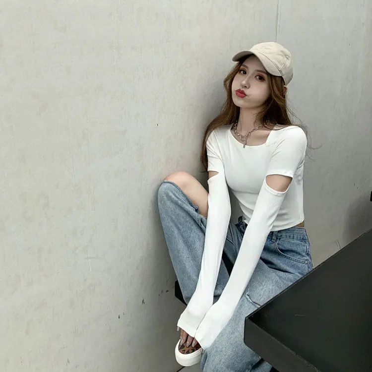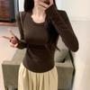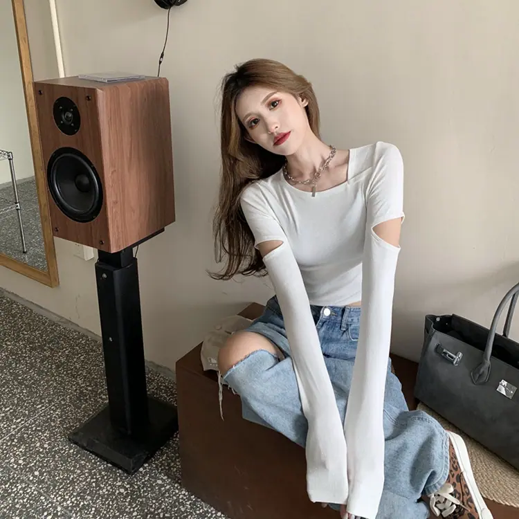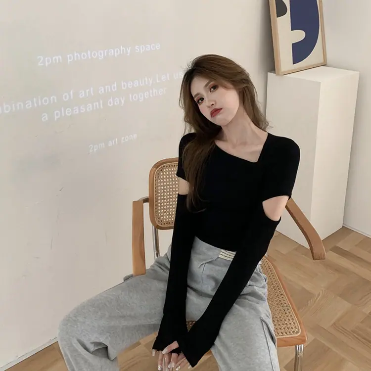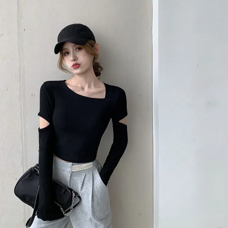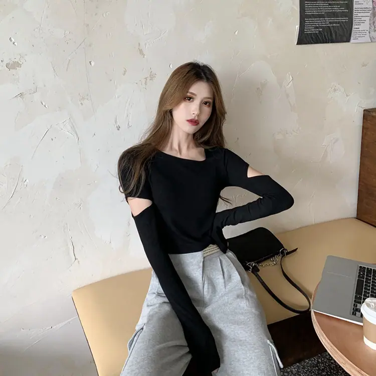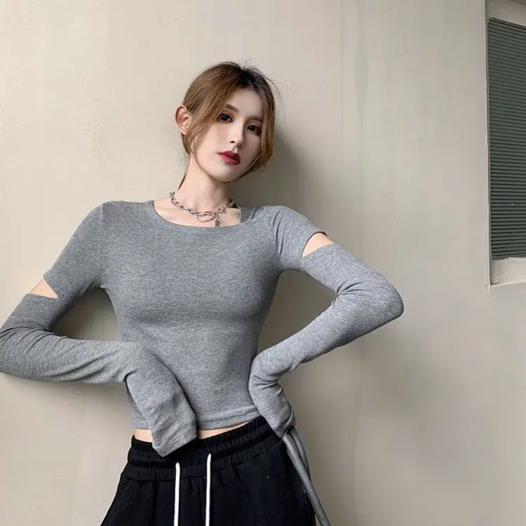 Nuevo Top Delgado Versátil Casual de Manga Larga Fino de Color Sólido para Primavera y Otoño para Mujer con Cuello Redondo Roto Camiseta Base al Mayoreo