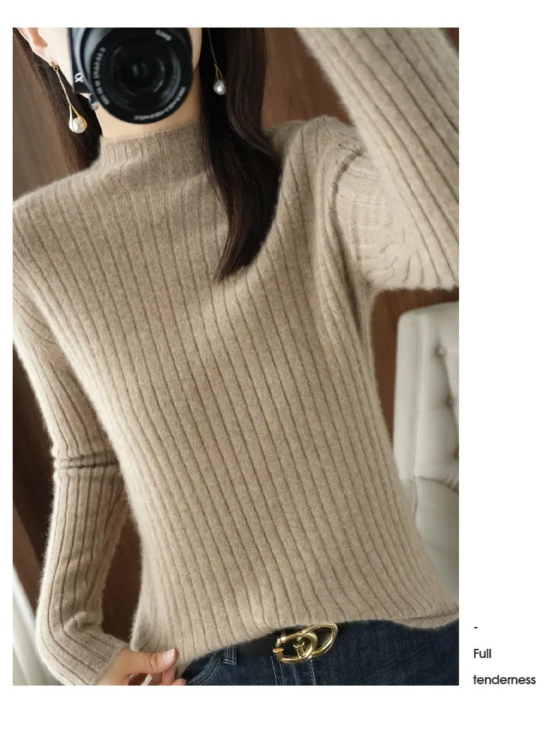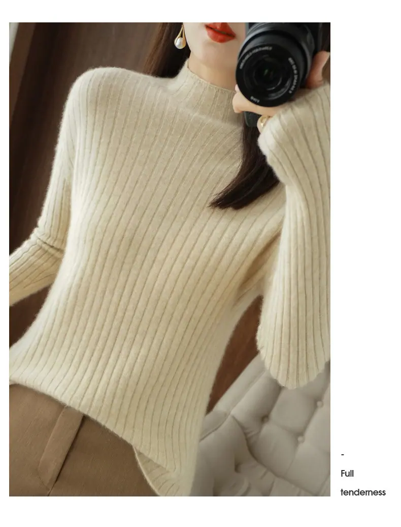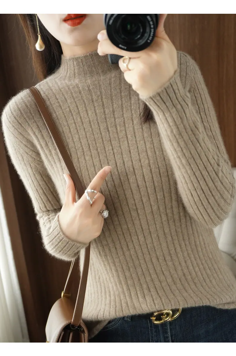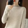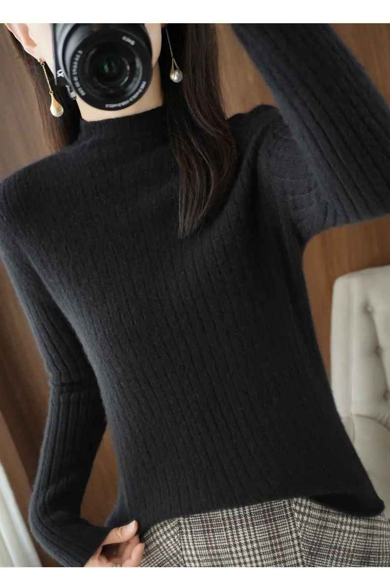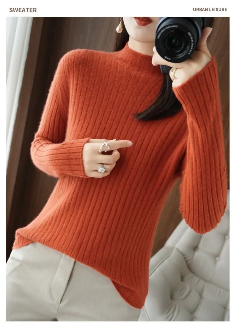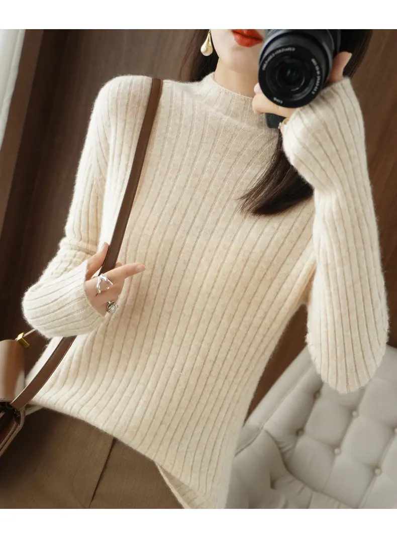 Transfronterizo 2025 otoño e invierno nuevo cuello semi-alto acanalado camisa básica suéter básico para mujer ajuste ceñido tejido de hilo core-spun invierno