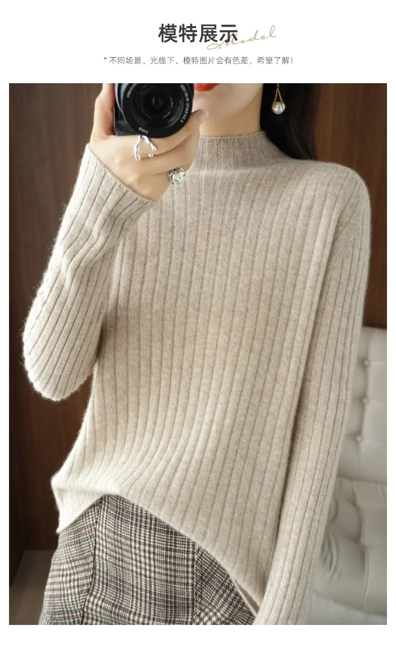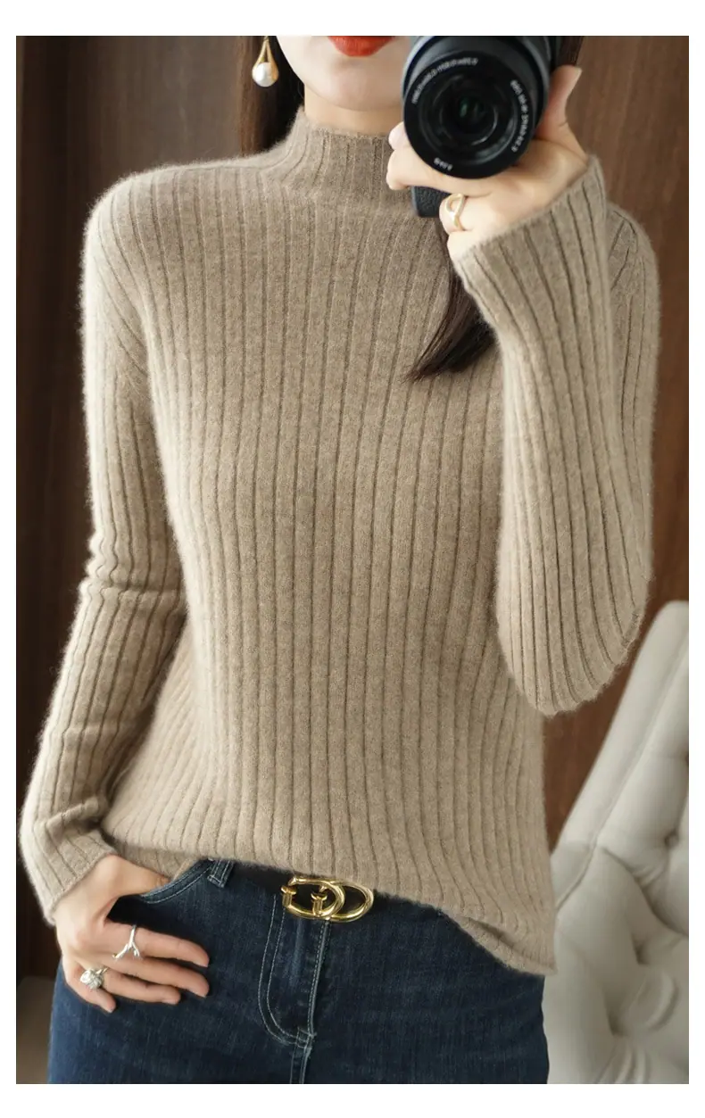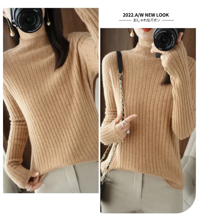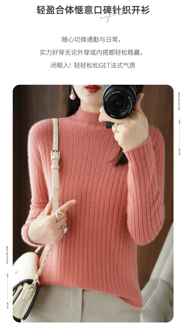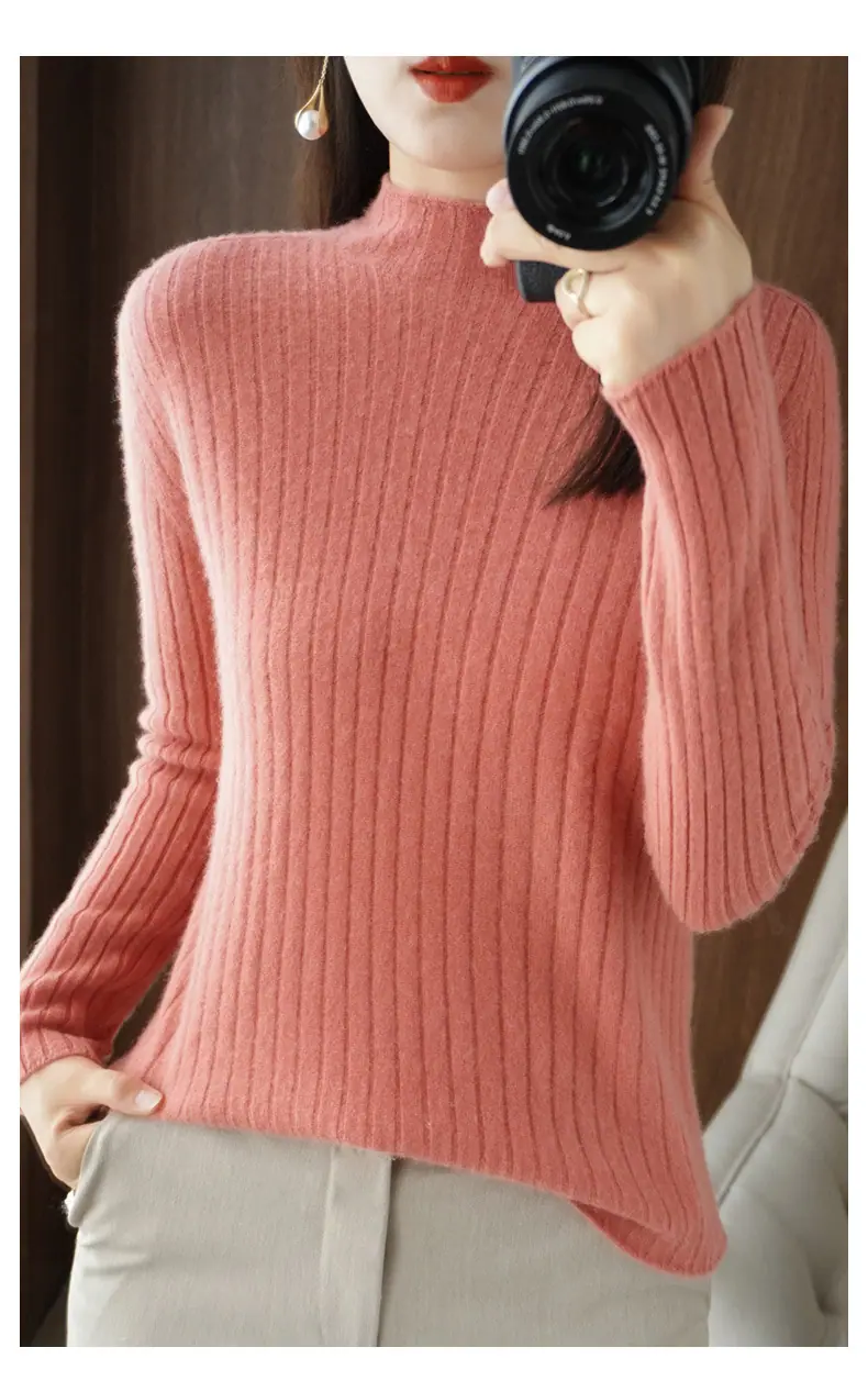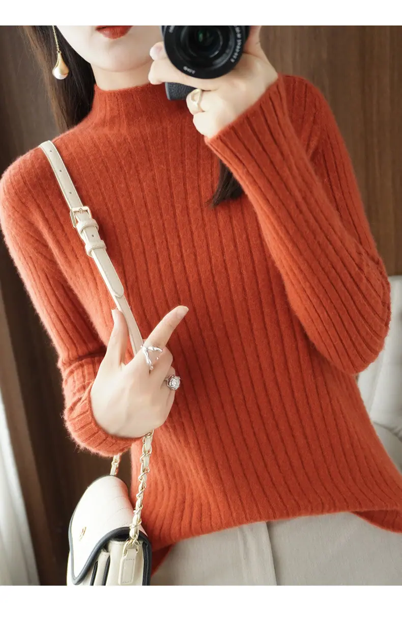Transfronterizo 2025 otoño e invierno nuevo cuello semi-alto acanalado camisa básica suéter básico para mujer ajuste ceñido tejido de hilo core-spun invierno