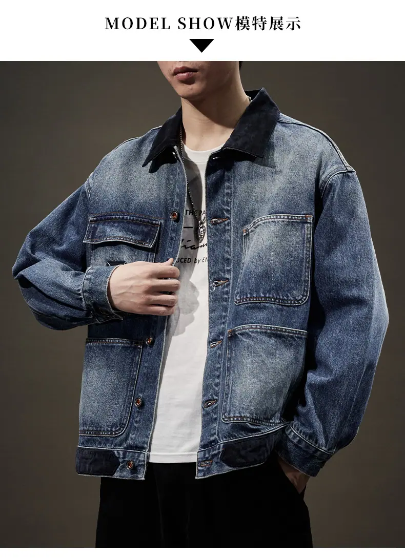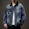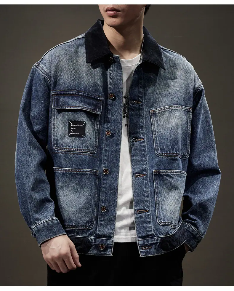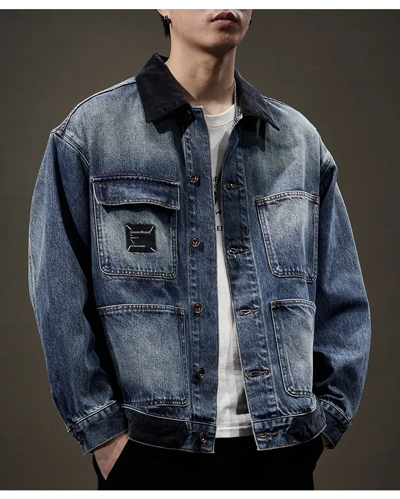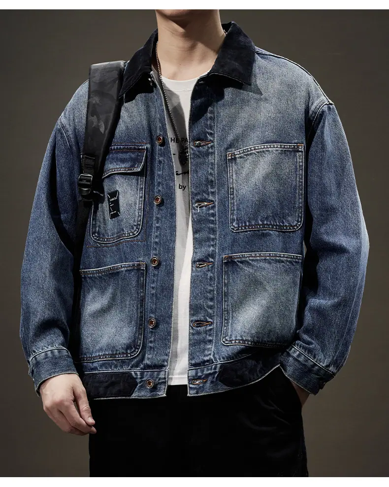 Chaqueta de mezclilla de primavera y otoño para hombre, holgada, moderna, de marca, chaqueta de trabajo, talla grande, moderna, versátil, degradada, con múltiples bolsillos, cuello vuelto, mezclilla