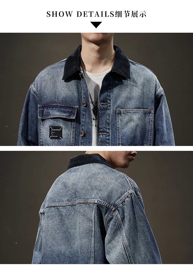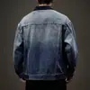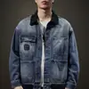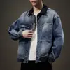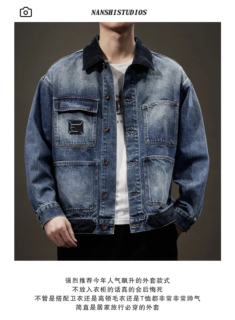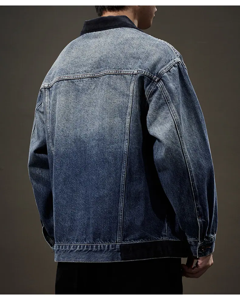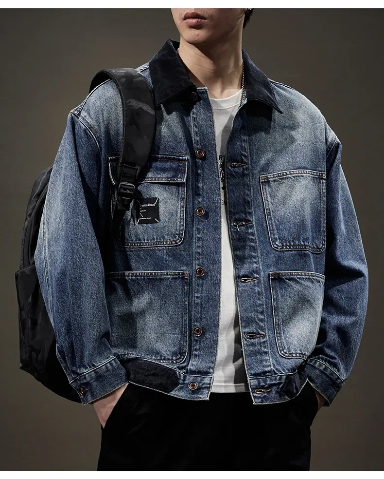 Chaqueta de mezclilla de primavera y otoño para hombre, holgada, moderna, de marca, chaqueta de trabajo, talla grande, moderna, versátil, degradada, con múltiples bolsillos, cuello vuelto, mezclilla