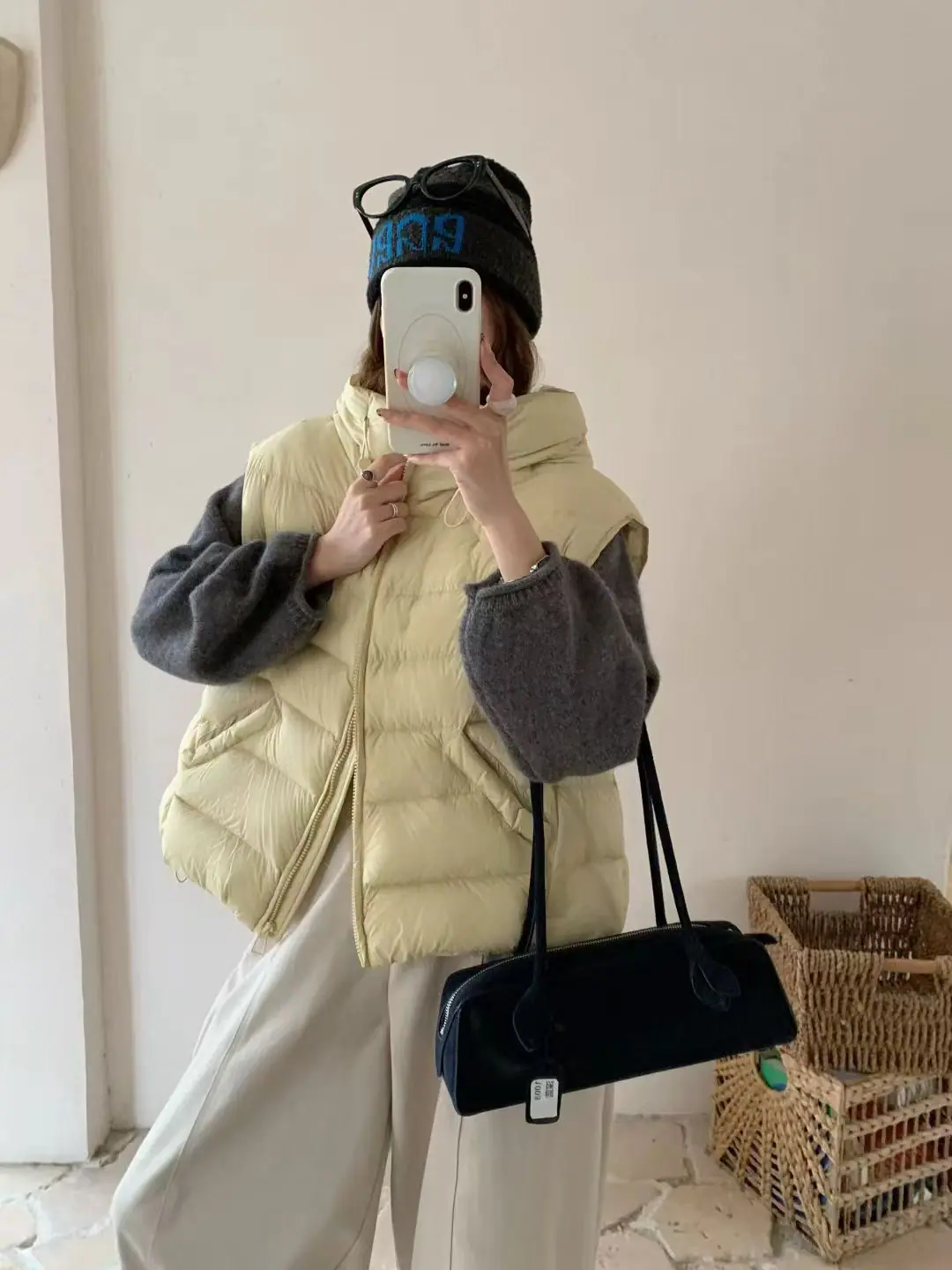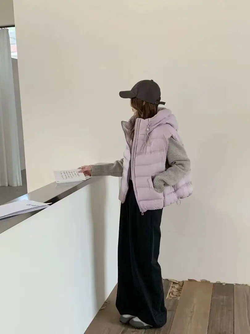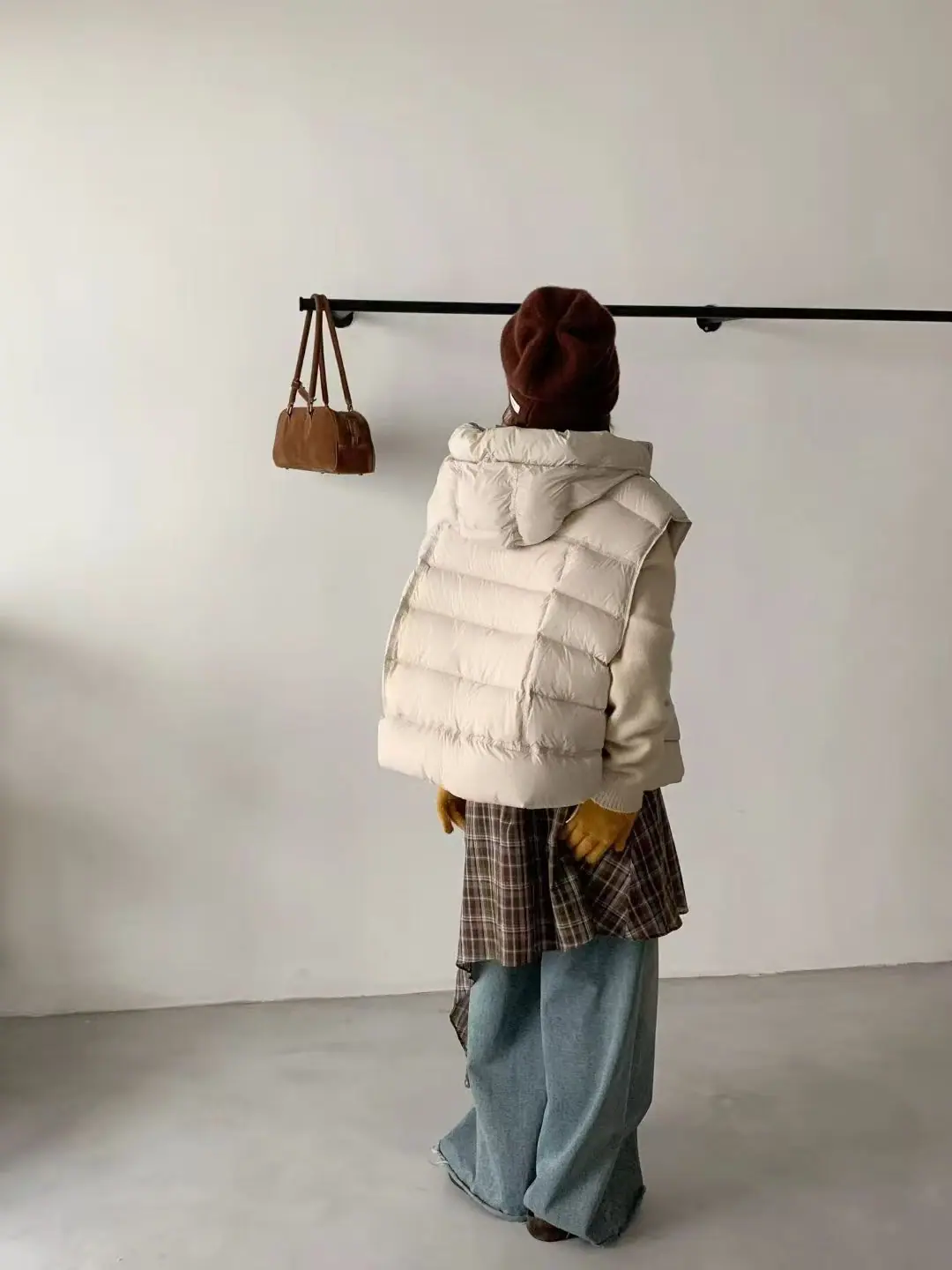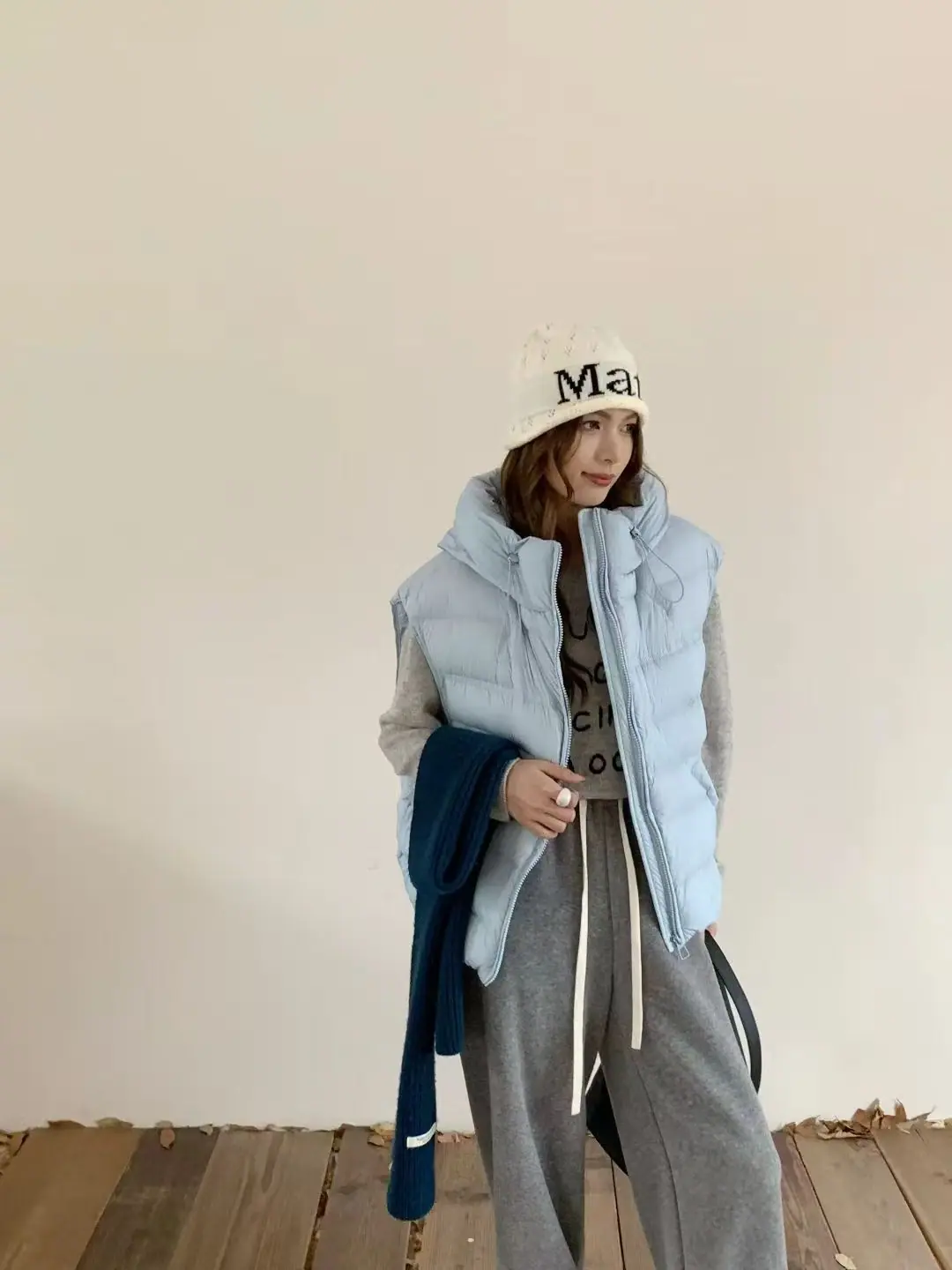 2025 Otoño/Invierno Nueva Moda Suelto Adelgazante Corto Cuello Alto Acanalado Chaleco de Plumón 90 Plumón de Pato Blanco Ropa Exterior sin Mangas