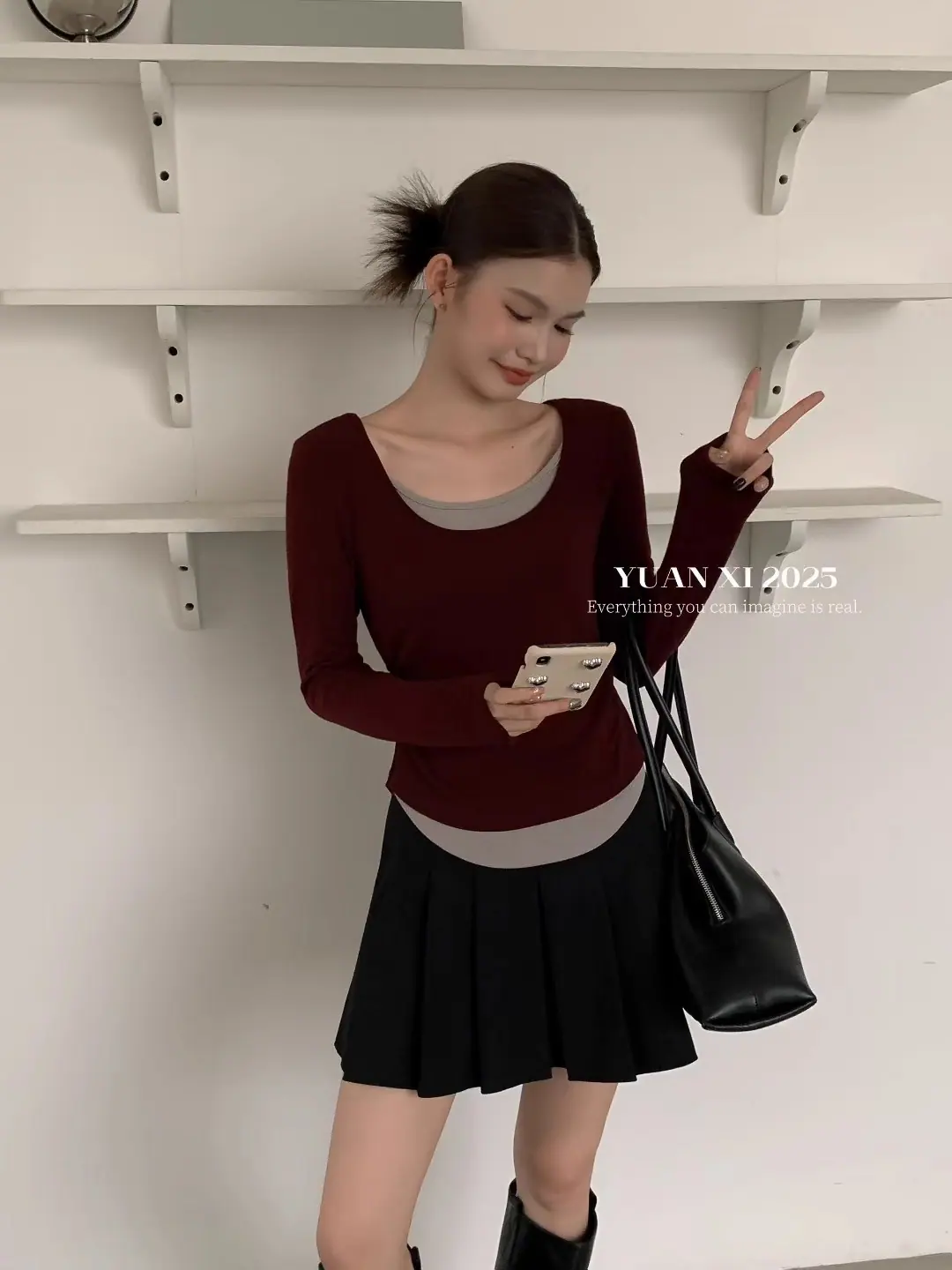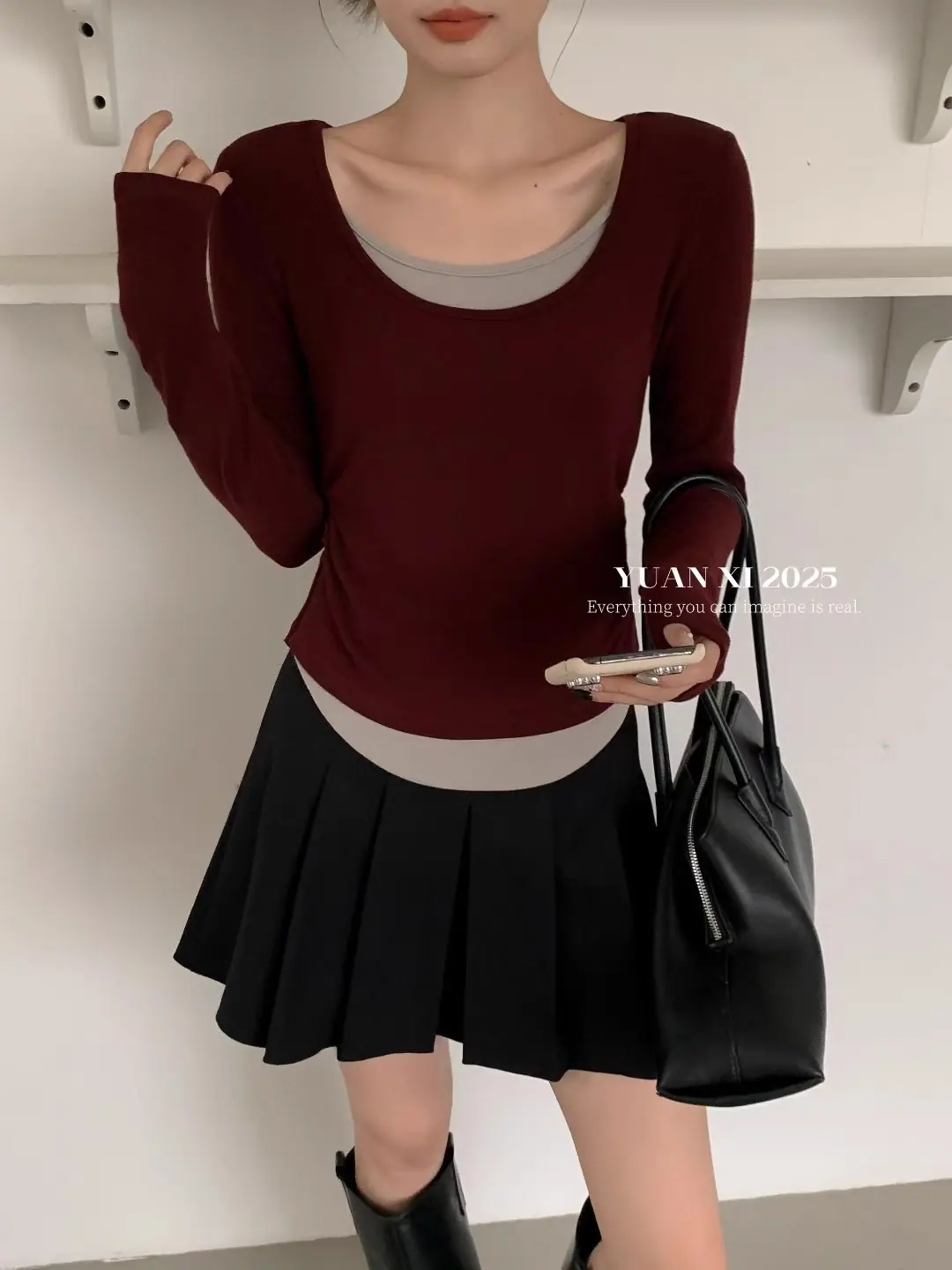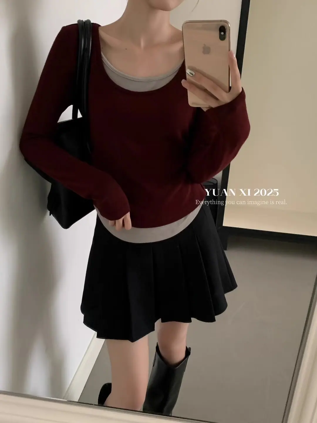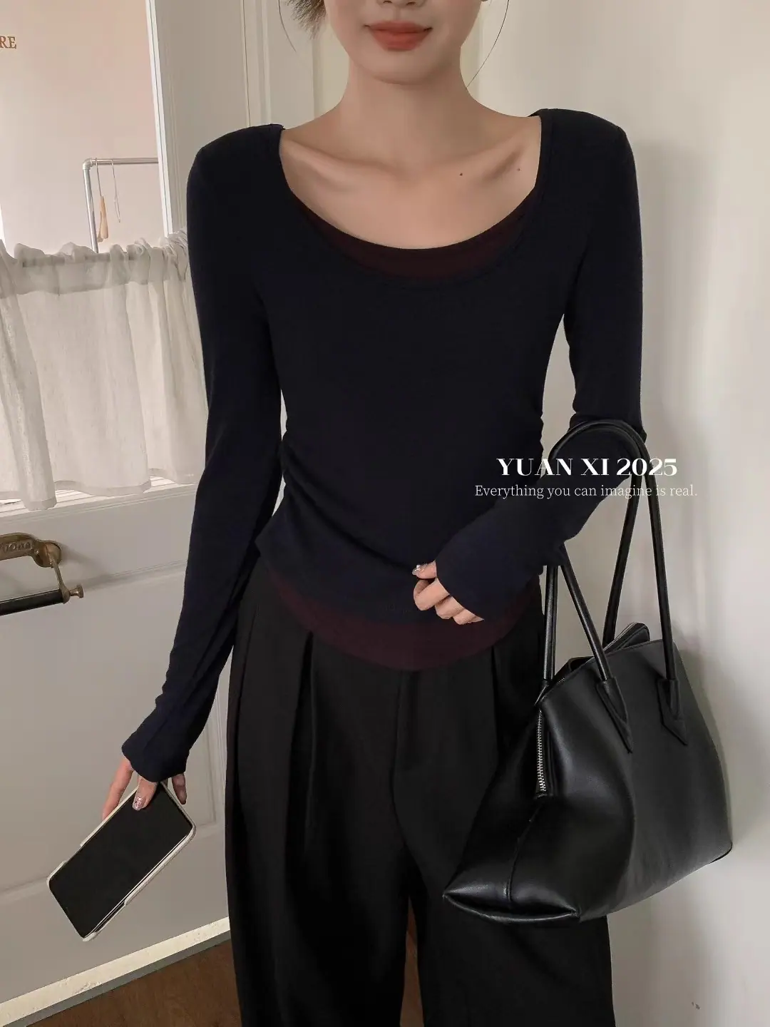Sentido del diseño nicho personalidad bloque de color falso dos piezas ajuste ceñido camisa base de cachemira mujer principios de otoño nuevo estilo coreano temperamento adelgazante
