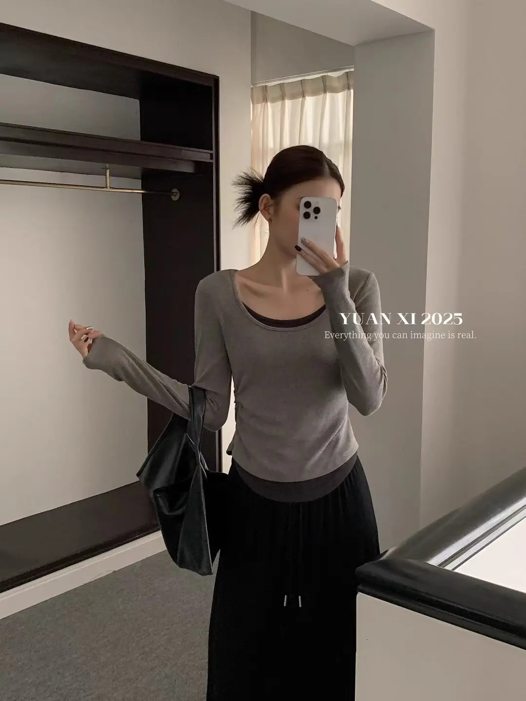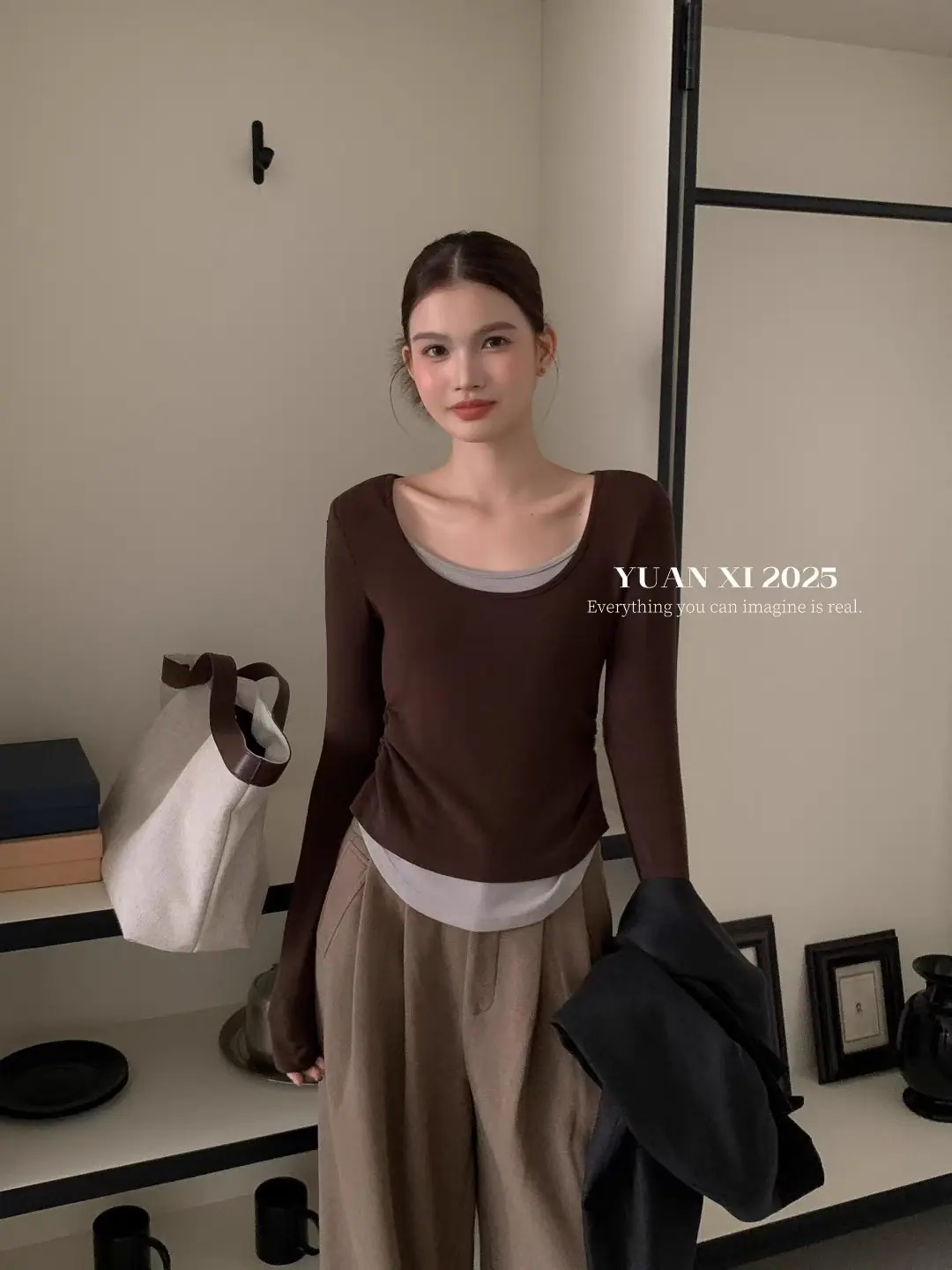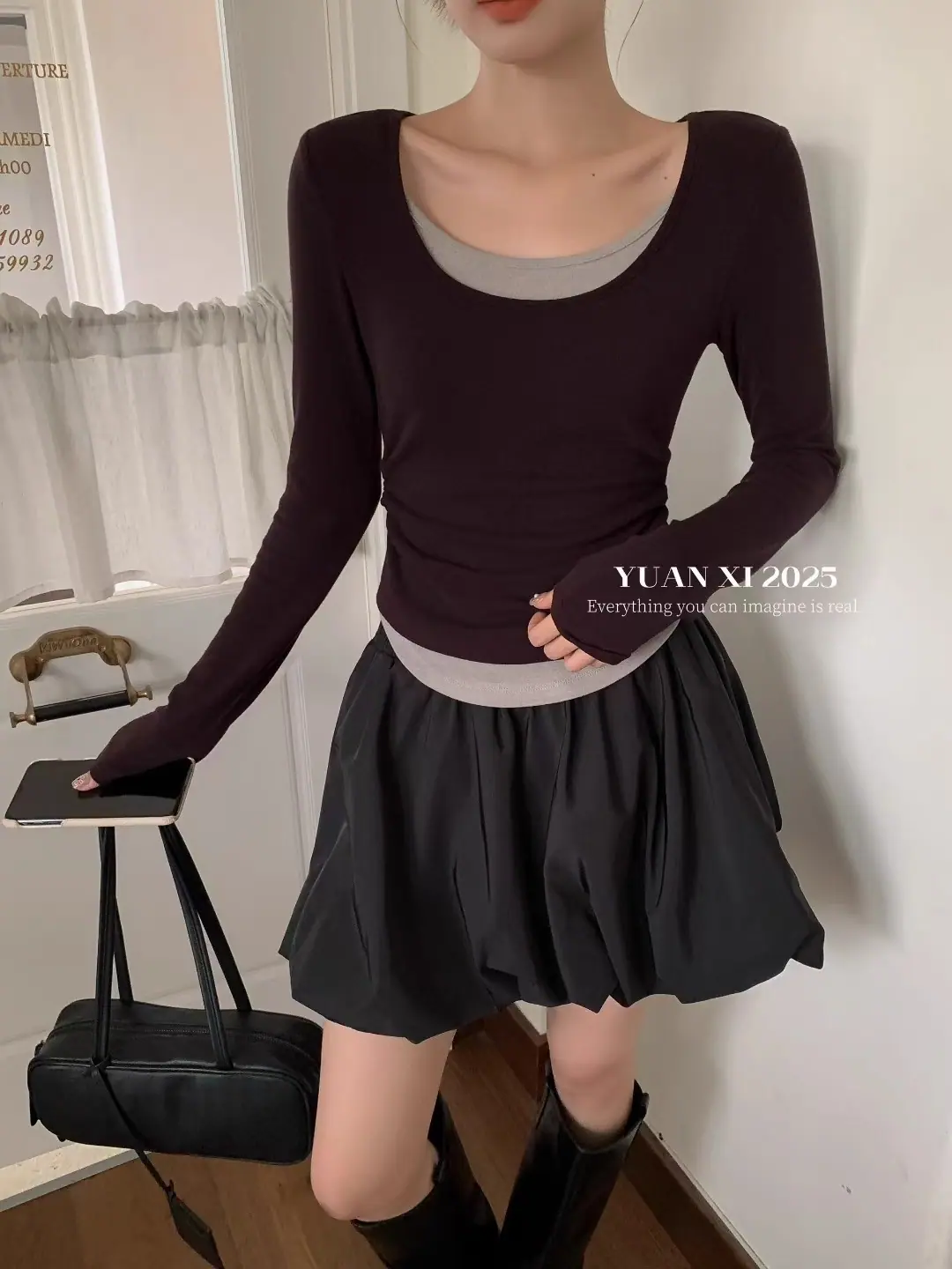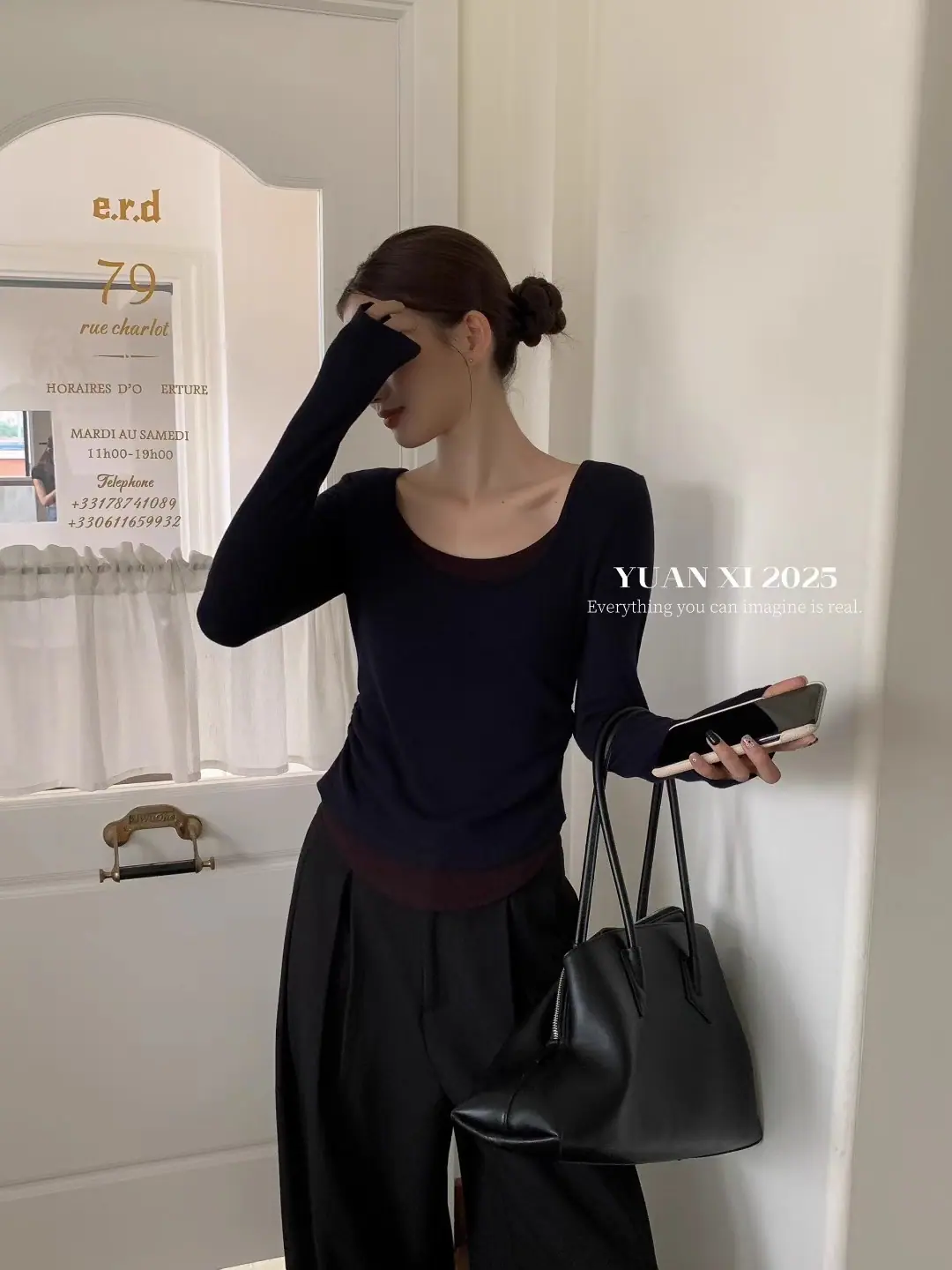 Sentido del diseño nicho personalidad bloque de color falso dos piezas ajuste ceñido camisa base de cachemira mujer principios de otoño nuevo estilo coreano temperamento adelgazante