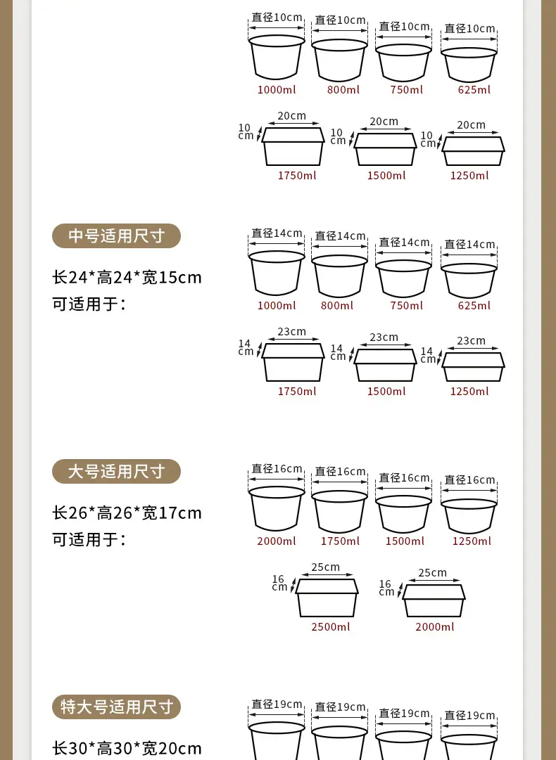 Grill size 35*25*14, Medium 24*24 High*15, Four drinks 23*30 high*17, Large size 26*26 high*17, Extra large 30...