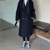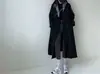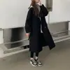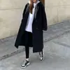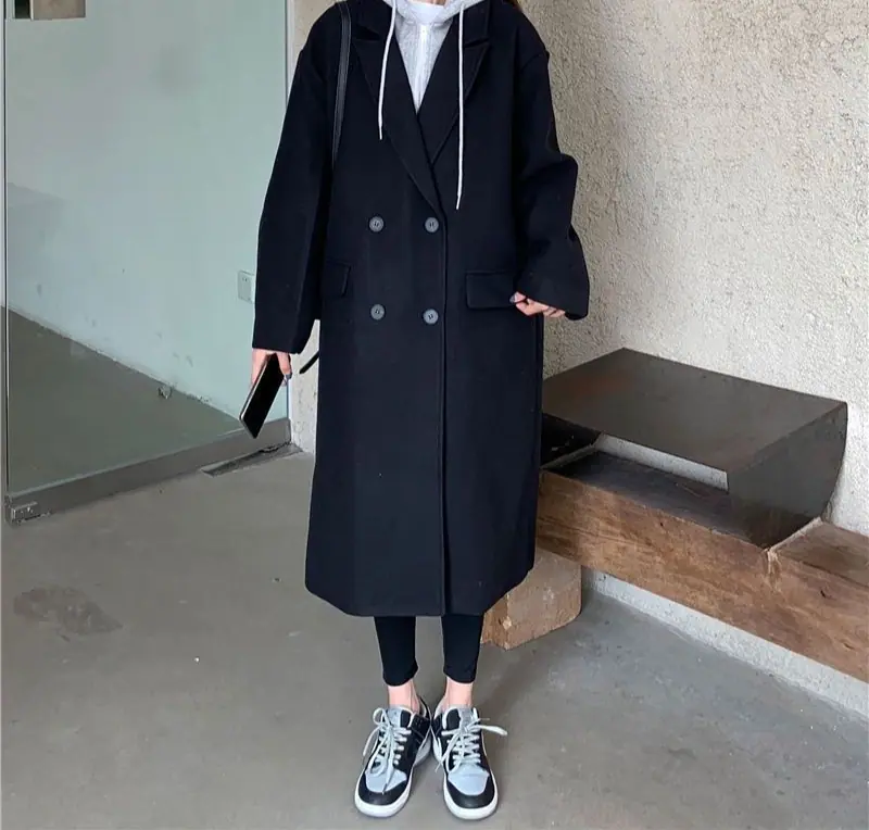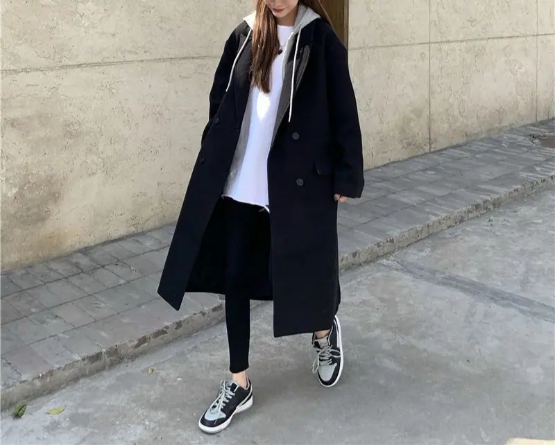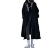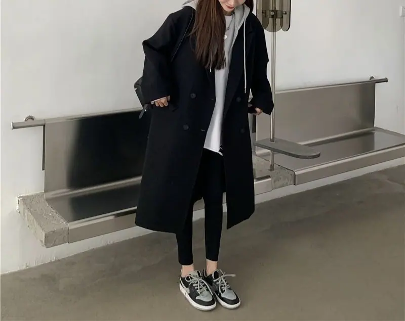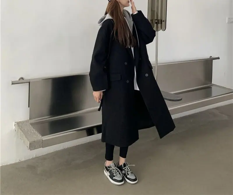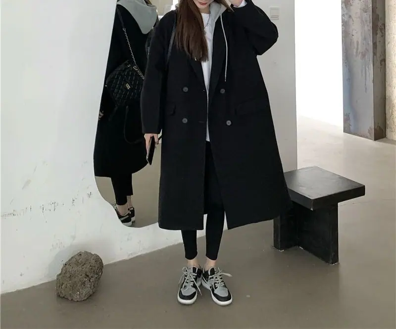 Abrigo de lana falso de dos piezas otoño e invierno 2025 estilo coreano holgado largo medio empalmado con capucha abrigo de lana engrosado ropa de mujer