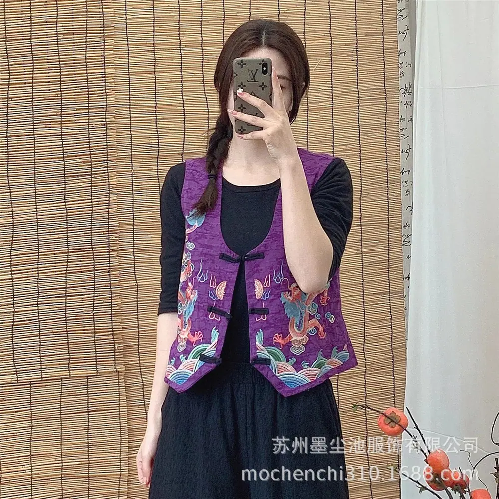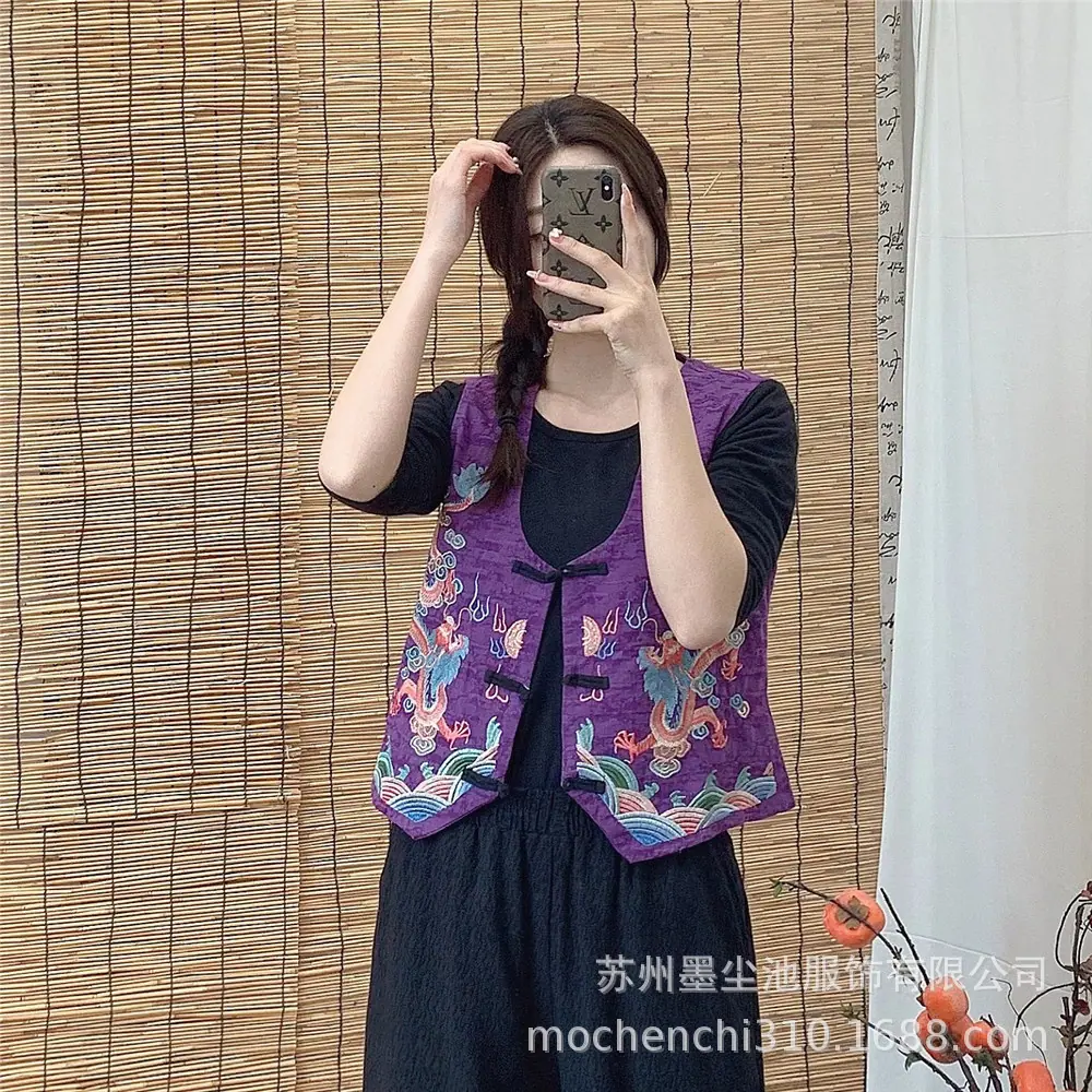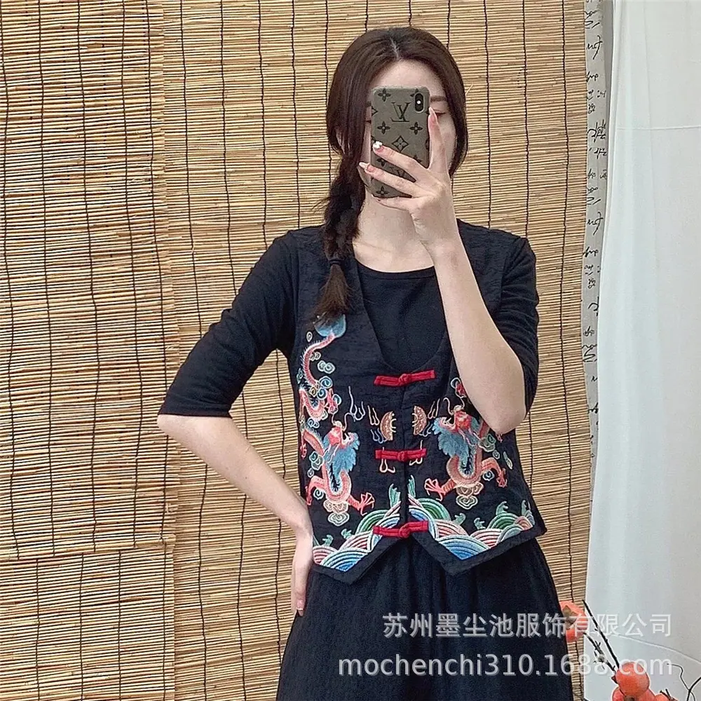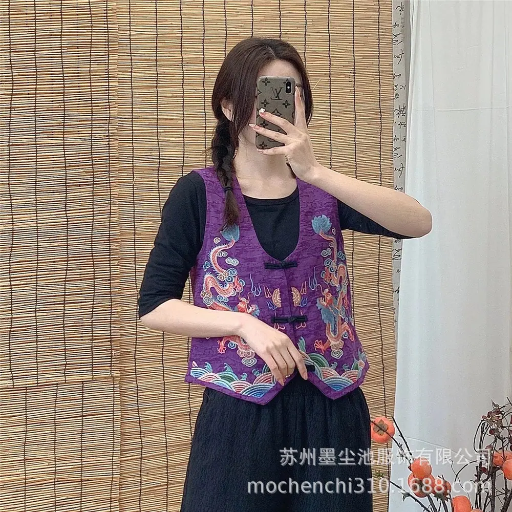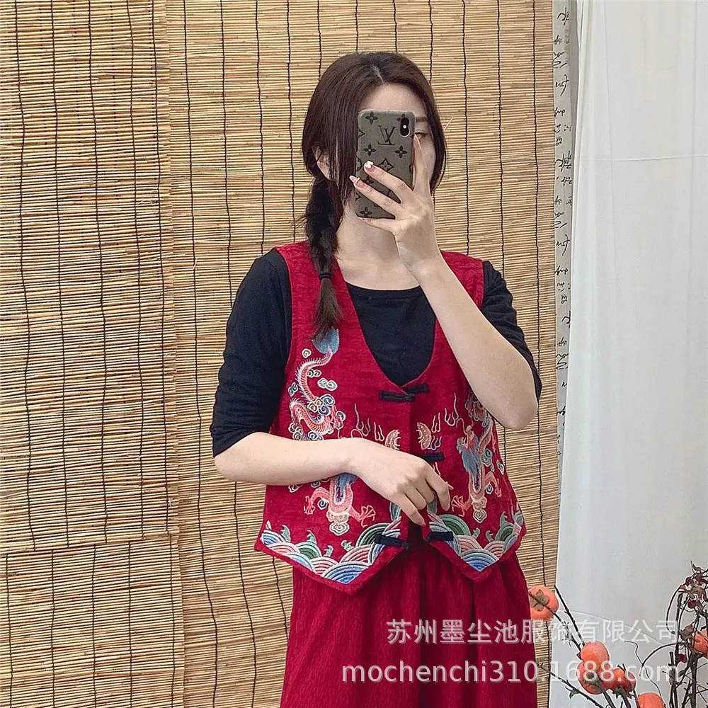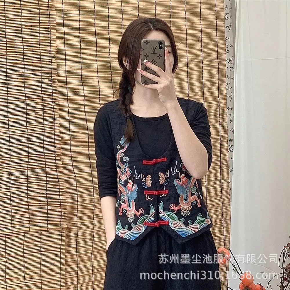 Chaleco Jacquard de Algodón Lino Primavera 2023 Estilo Étnico Patrón de Dragón Bordado Cuello U Chaleco con Hebilla para Mujer