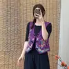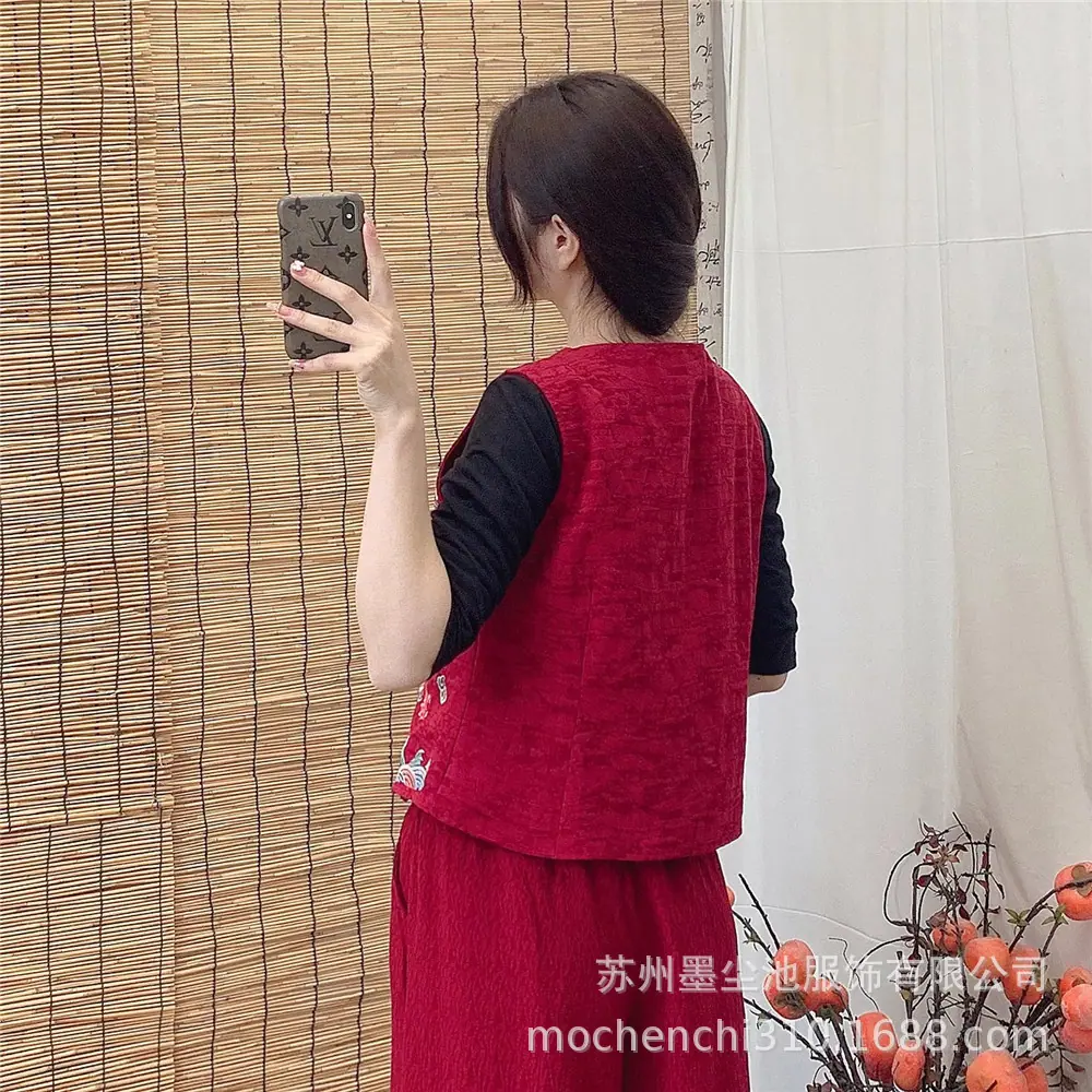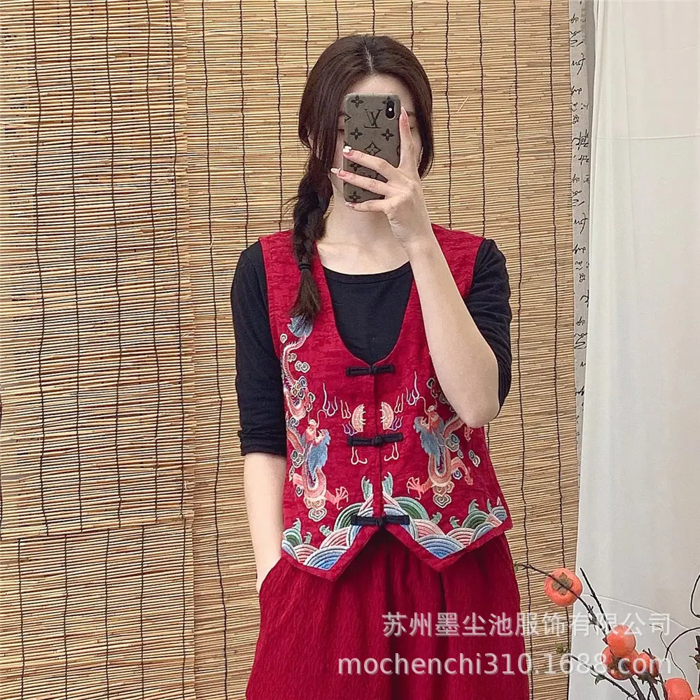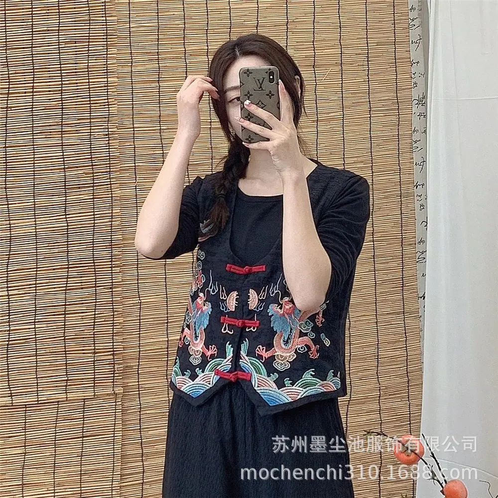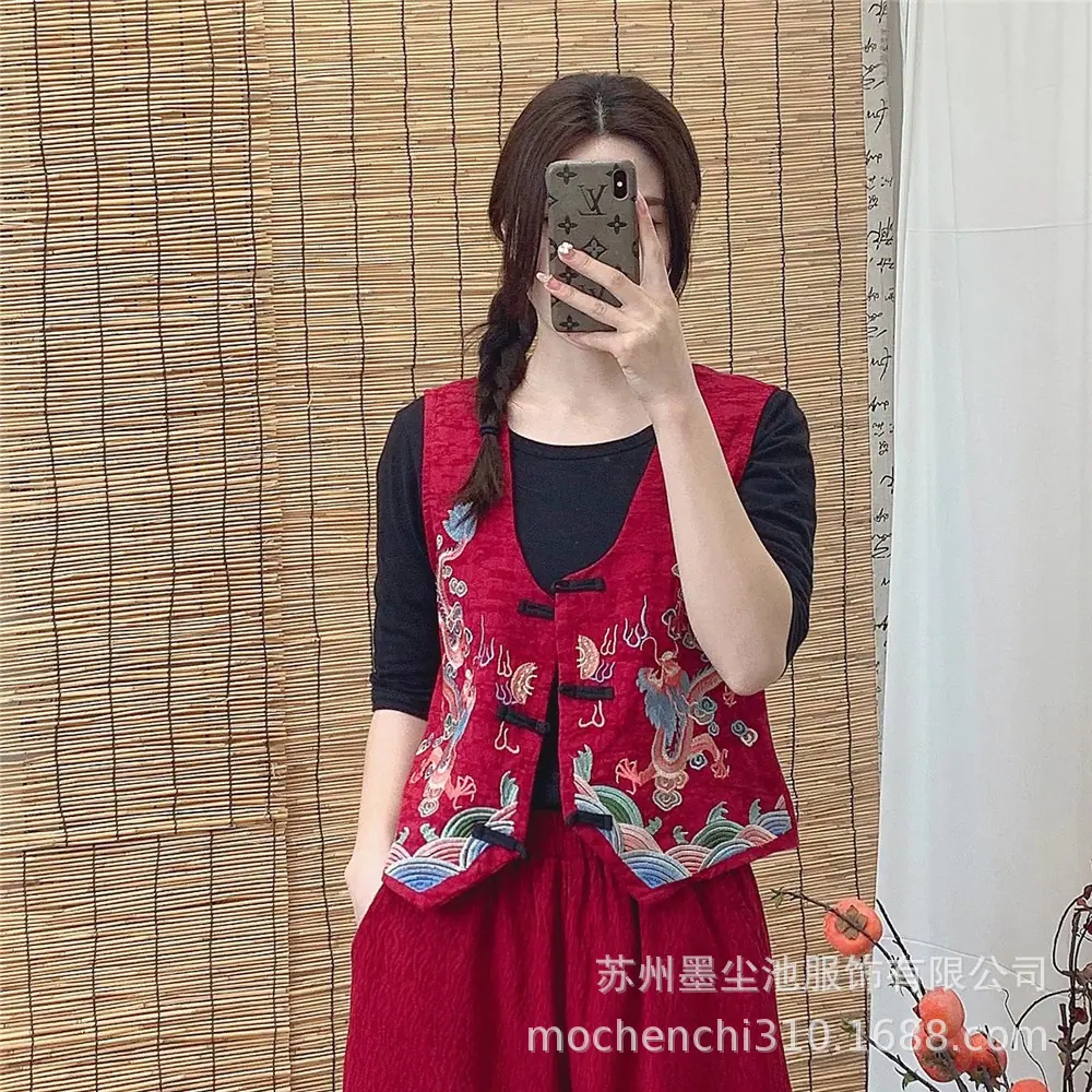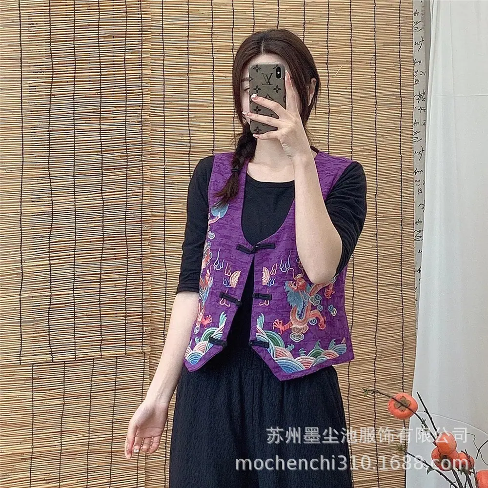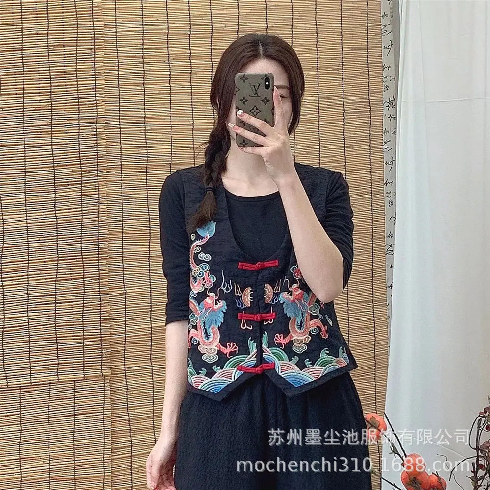 Chaleco Jacquard de Algodón Lino Primavera 2023 Estilo Étnico Patrón de Dragón Bordado Cuello U Chaleco con Hebilla para Mujer