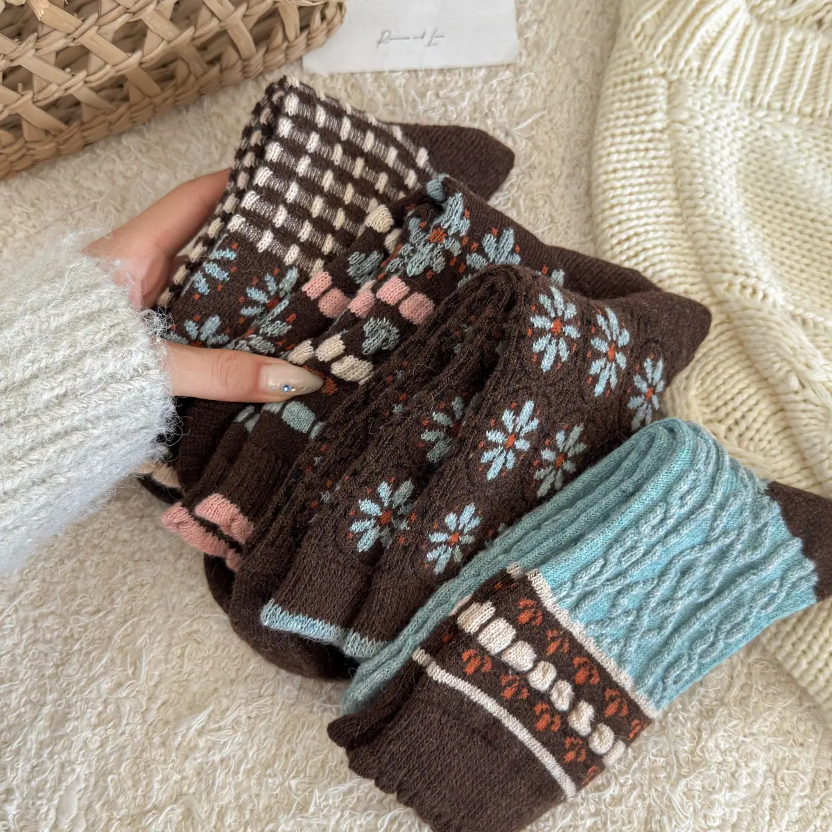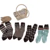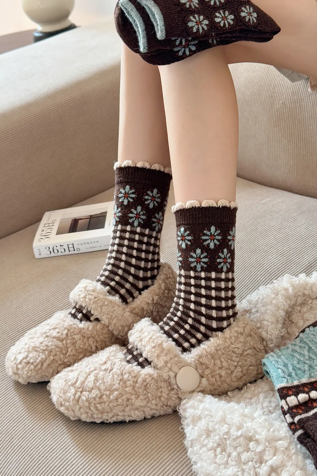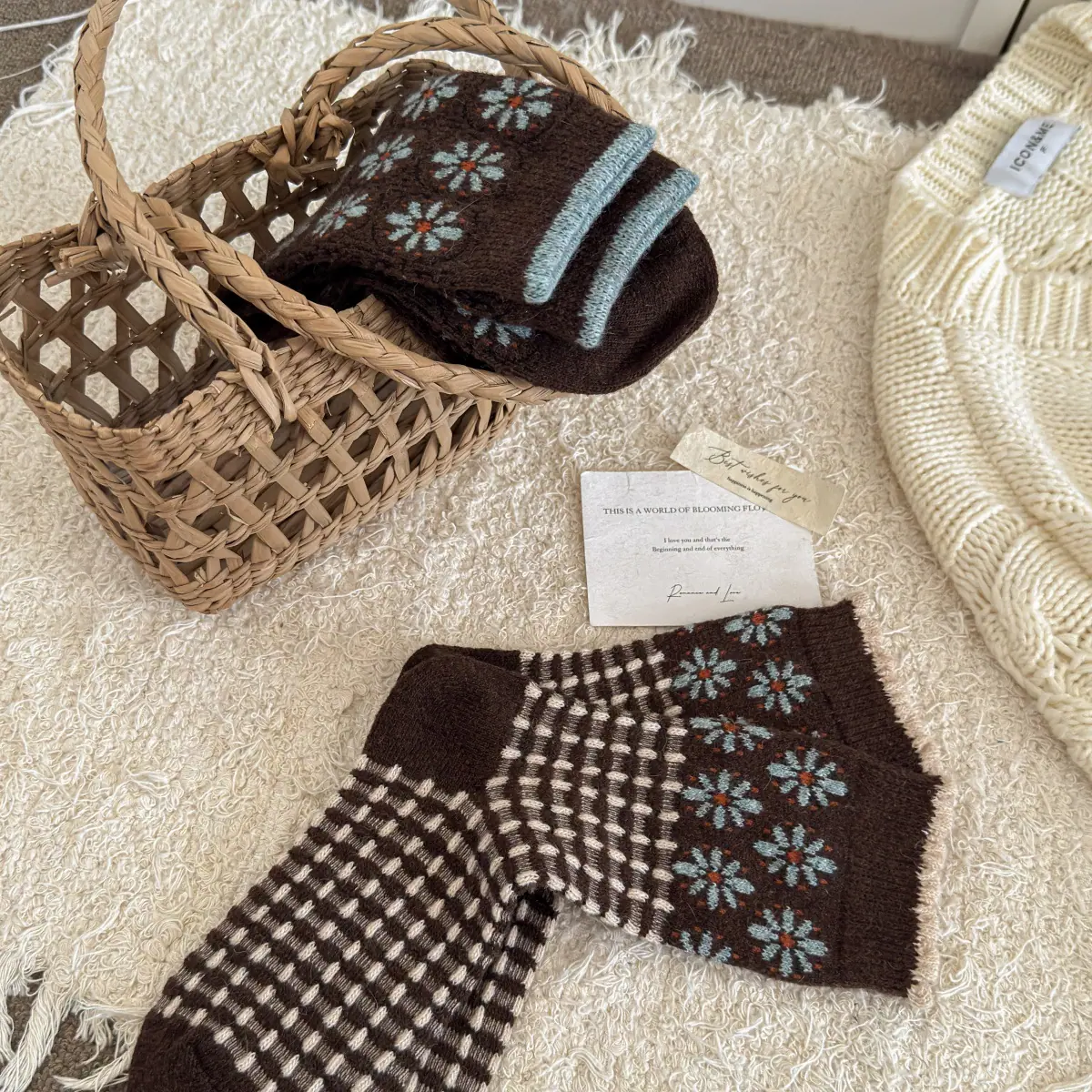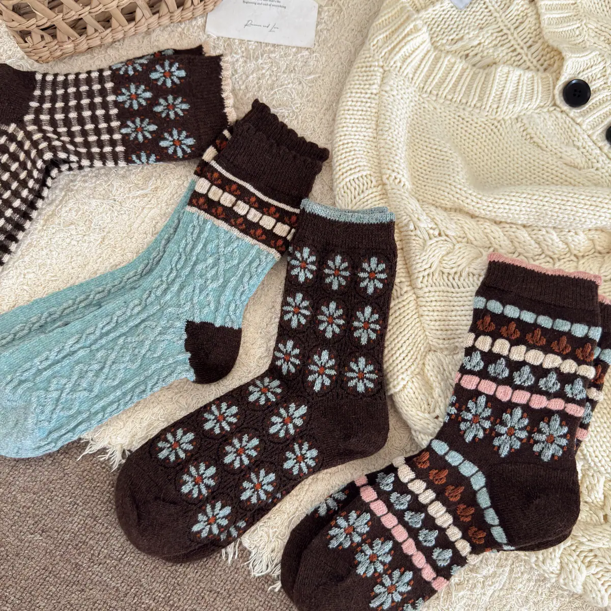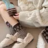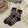 Calcetines de lana florales retro de otoño e invierno para mujer, estilo japonés, color café, de felpa, cálidos y gruesos, para combinar con botas de nieve
