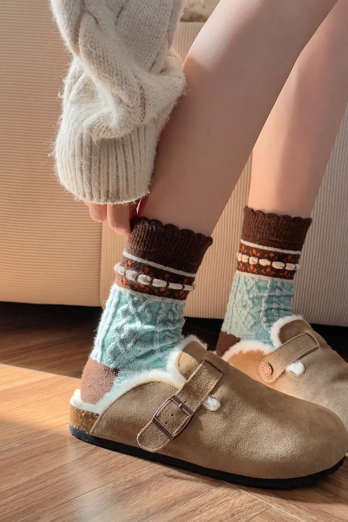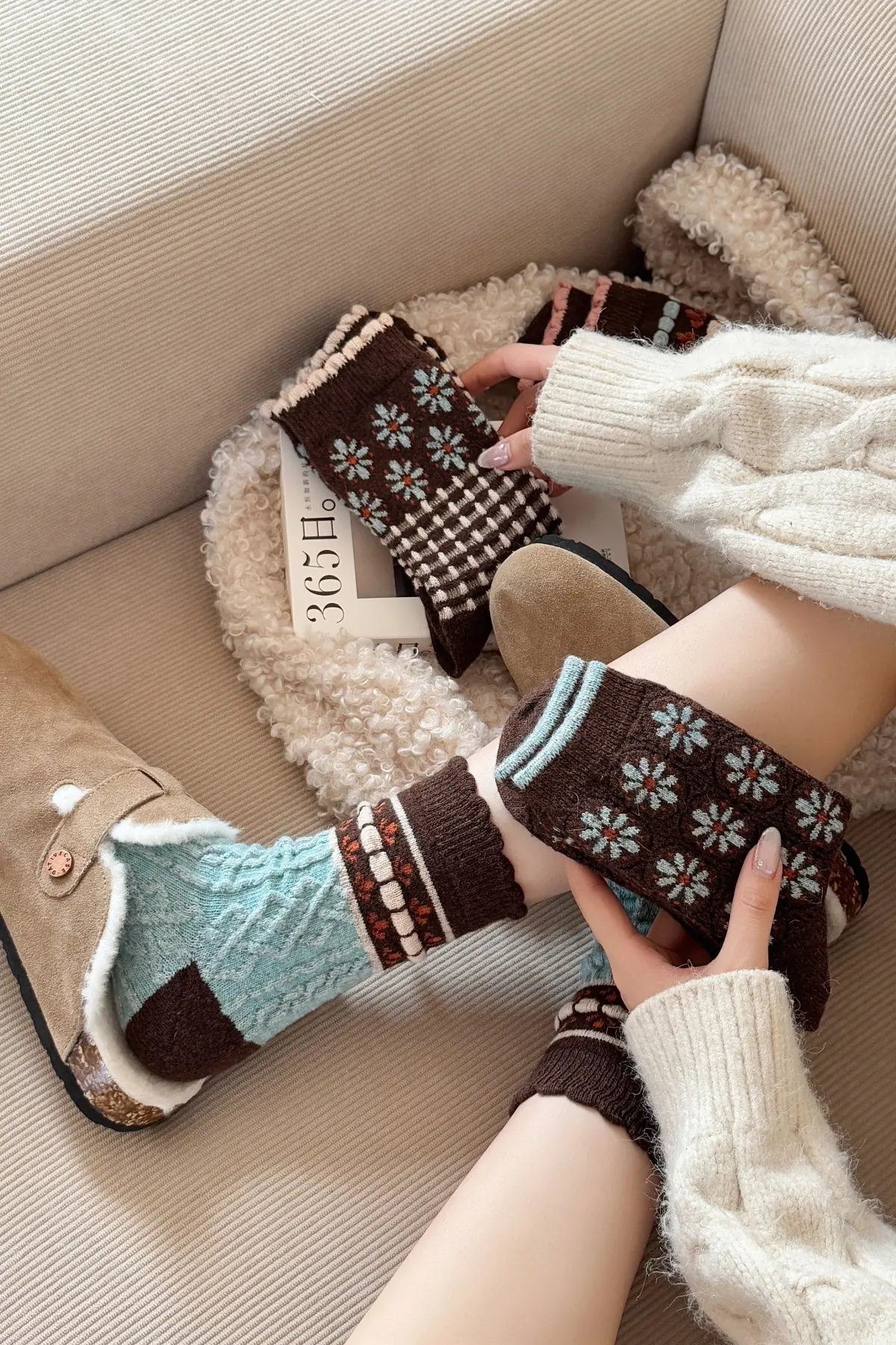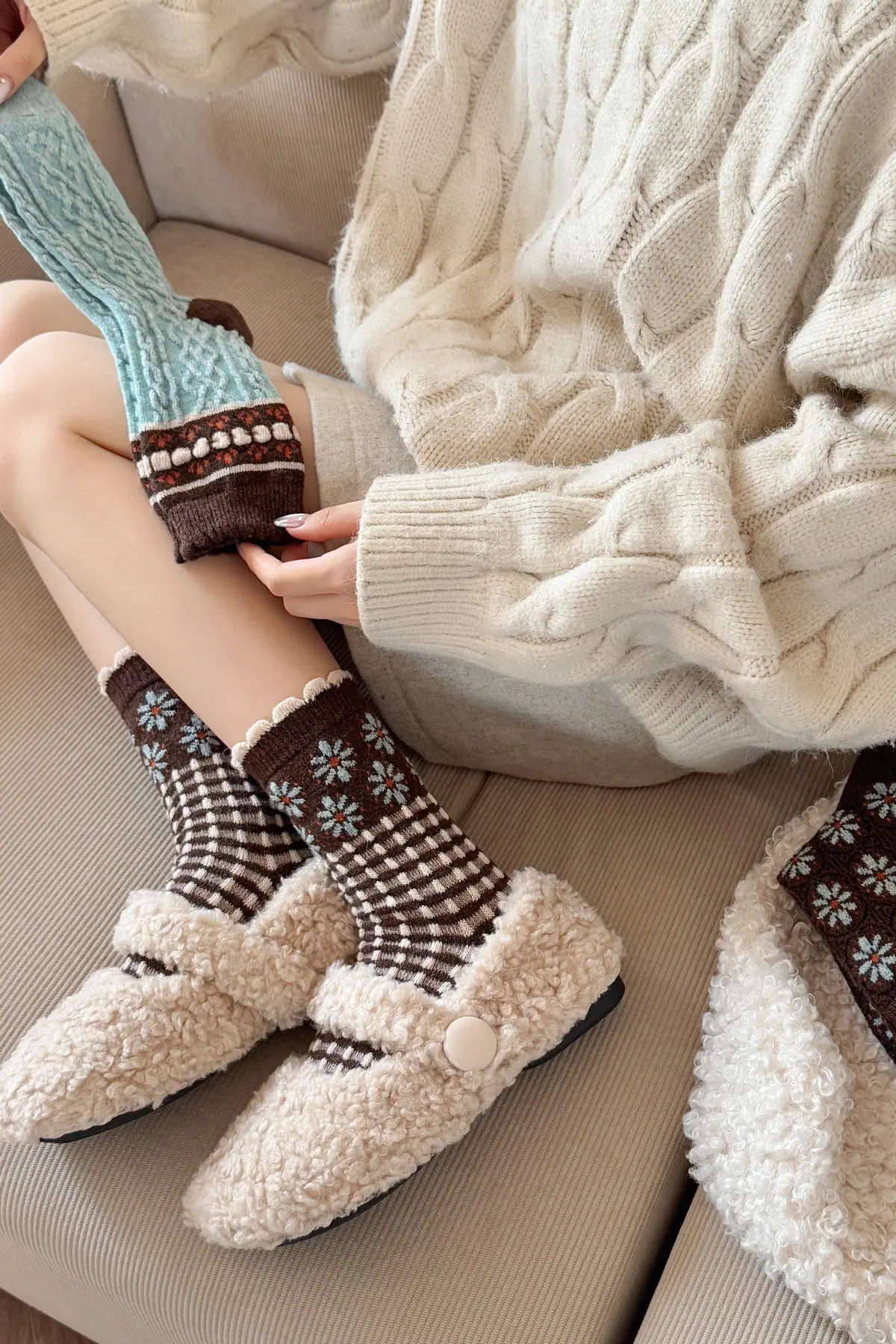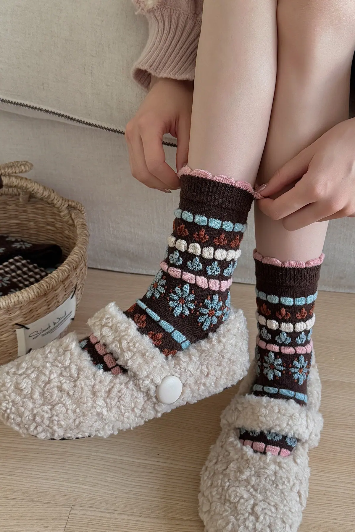 Calcetines de lana florales retro de otoño e invierno para mujer, estilo japonés, color café, de felpa, cálidos y gruesos, para combinar con botas de nieve