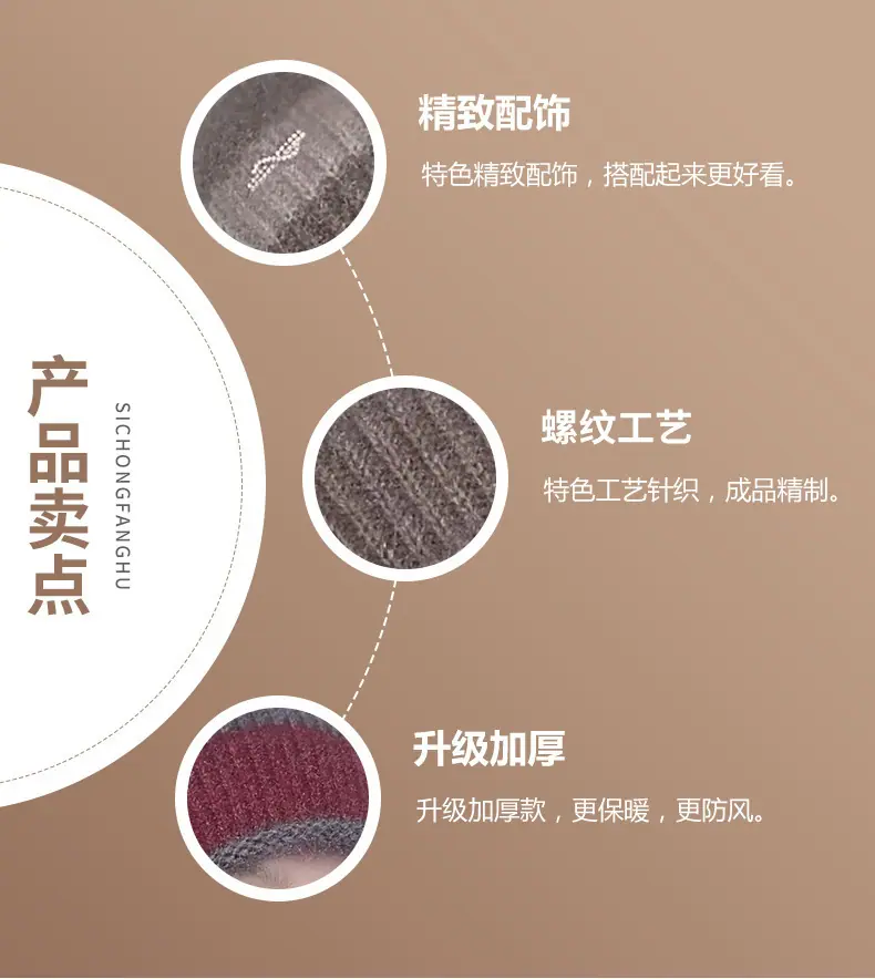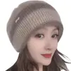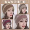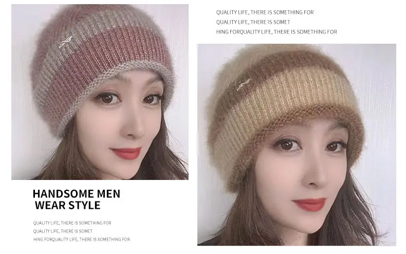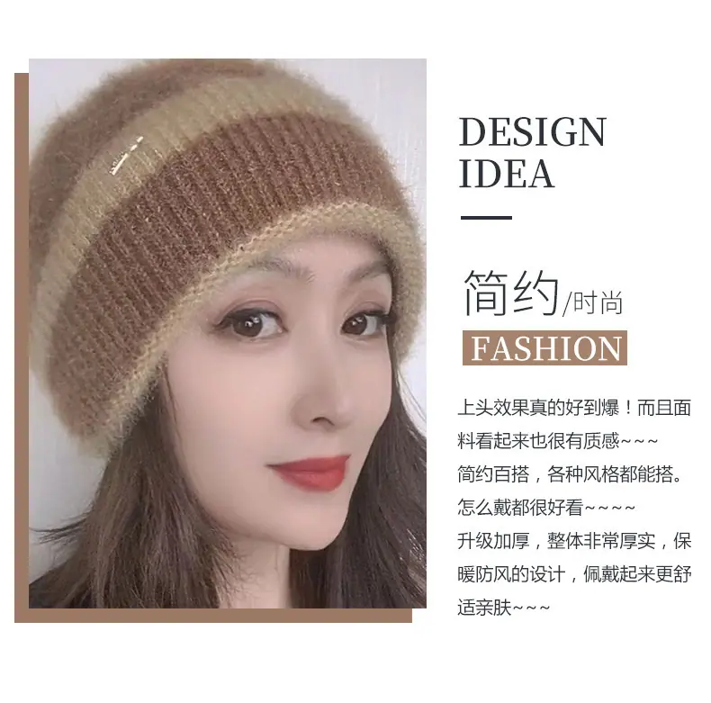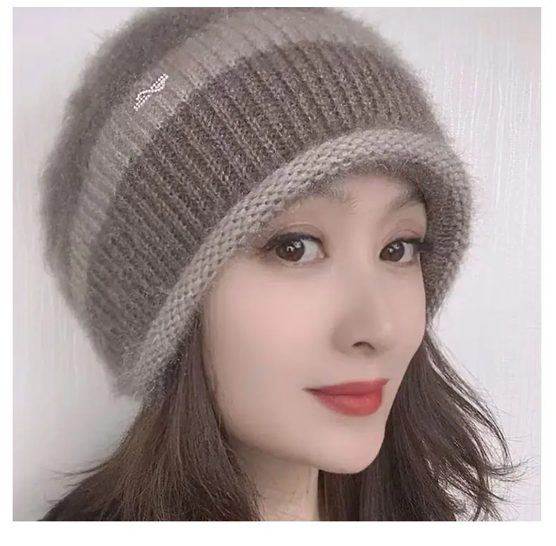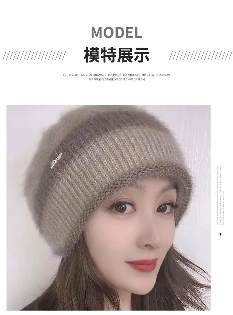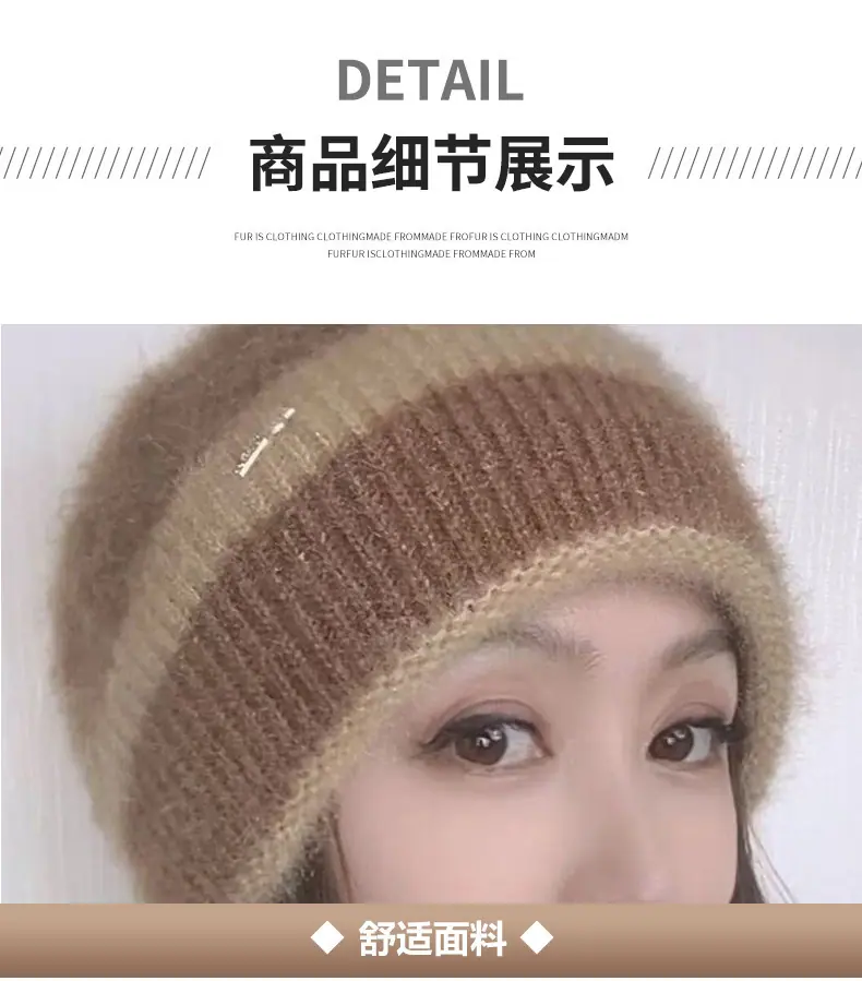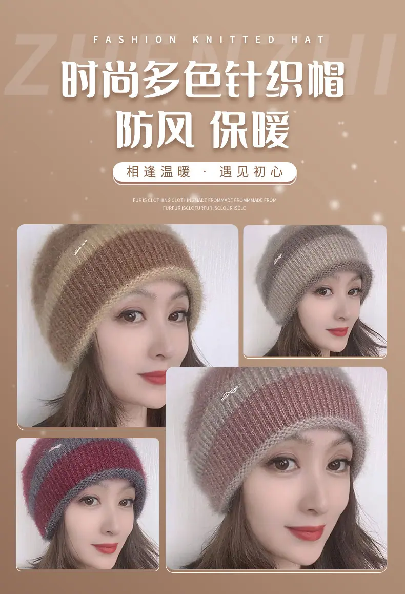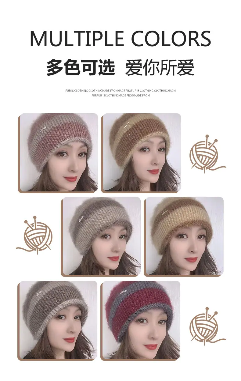 Boina de Invierno para Mujer Nueva Tejida de Moda a Rayas con Bloques de Color Doble Capa Gruesa Cálida Cómoda Suave