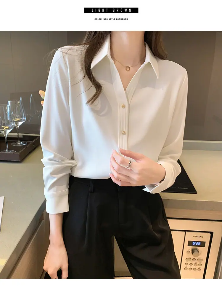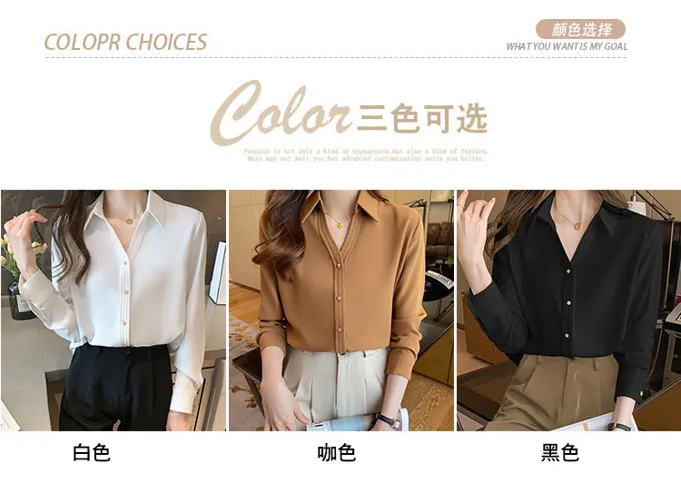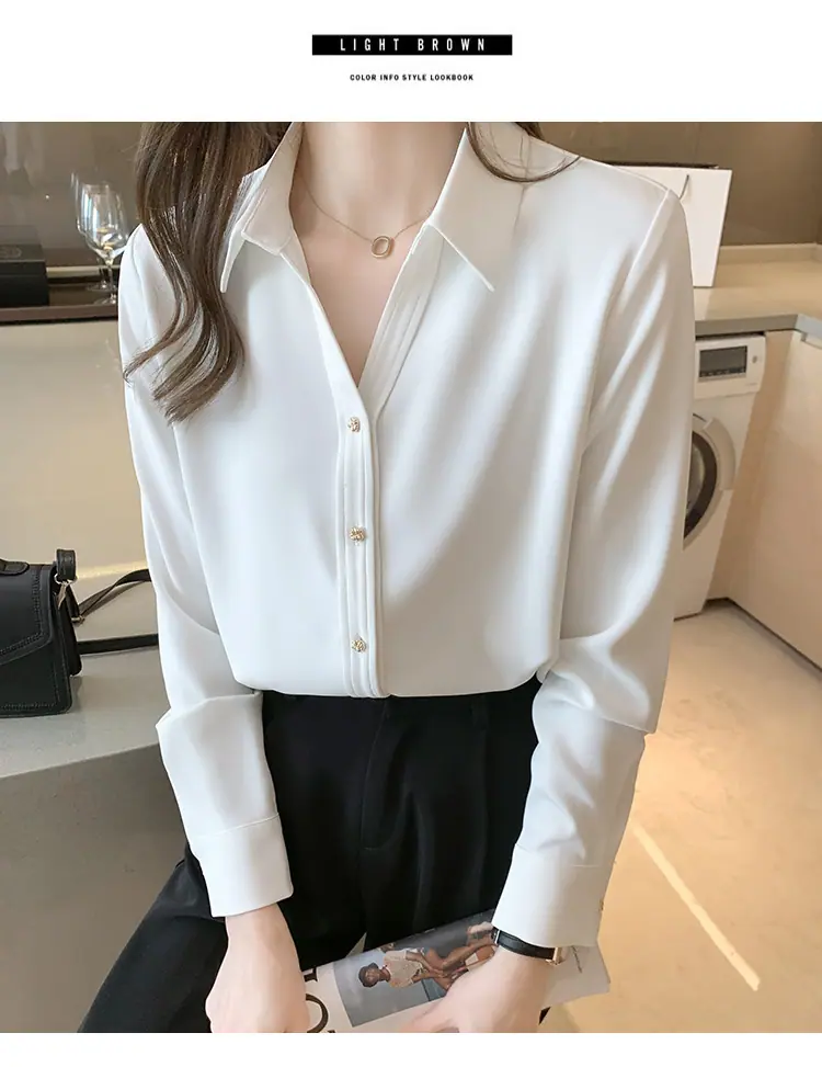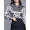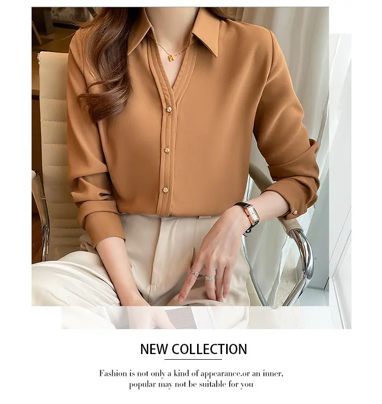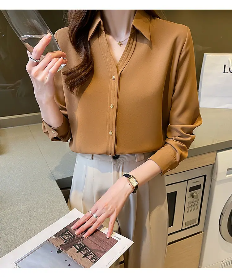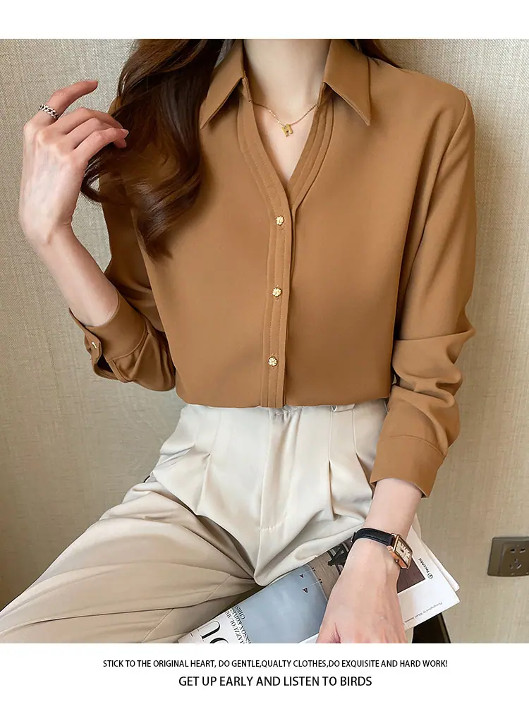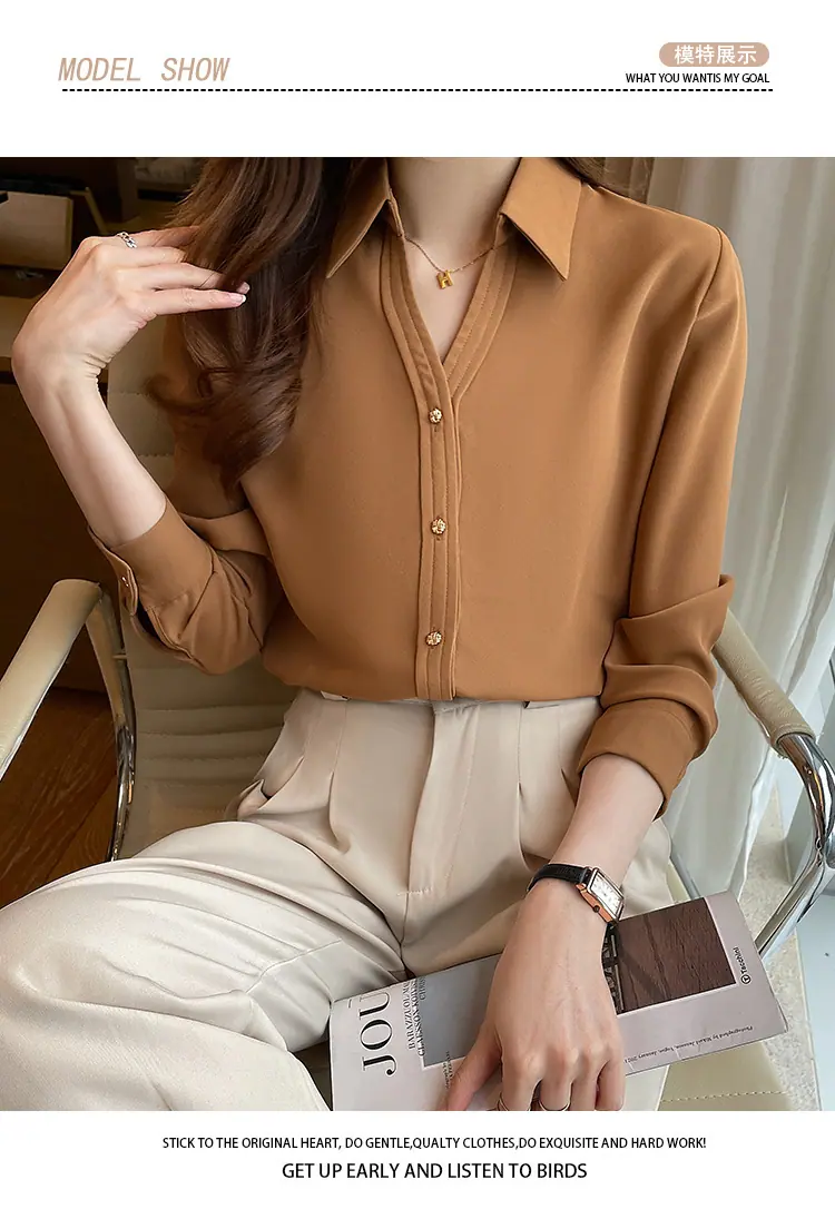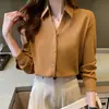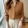 En stock Camisa marrón de satén de calidad para mujer, blusa elegante de manga larga para otoño, primavera y otoño, moda vintage.