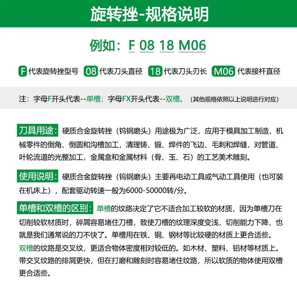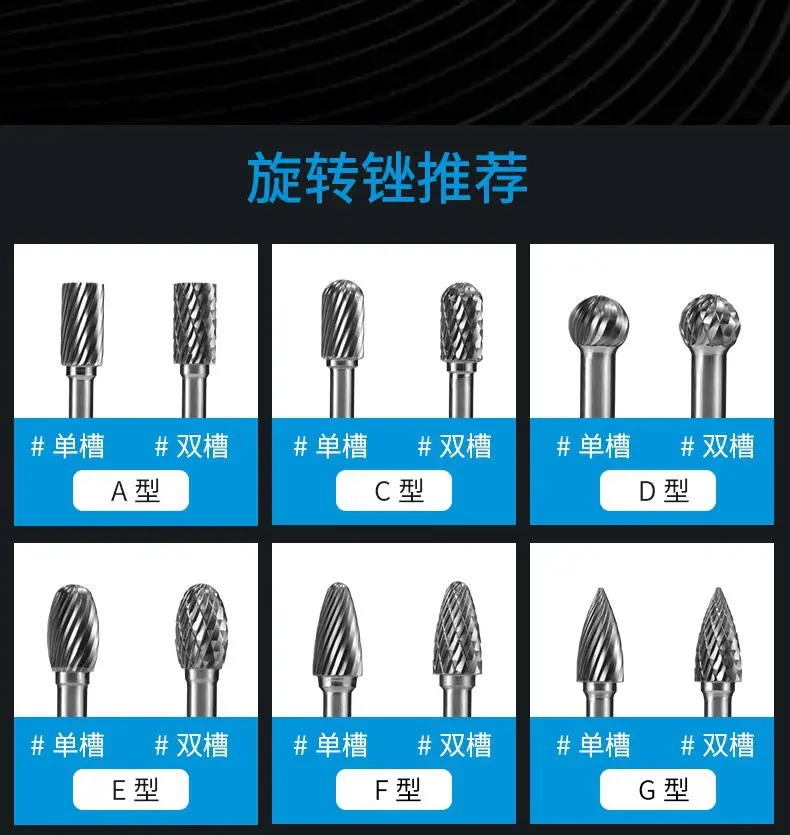 Las fresas rotativas de carburo, también conocidas como fresas de carburo surtidas de alta velocidad, fresas de carburo para matrices, etc., se utilizan con amoladoras eléctricas o herramientas neumáticas. Las fresas rotativas de carburo tienen una amplia gama de usos y se utilizan en sectores industriales como maquinaria, automóviles, barcos, productos químicos y grabado artesanal. Se pueden utilizar para procesar hierro fundido, acero fundido, acero al carbono, acero aleado, acero inoxidable, acero templado, cobre y aluminio, etc. Dado que las fresas rotativas de carburo se controlan manualmente cuando se montan en herramientas rotativas de alta velocidad, la presión y la velocidad de avance aplicadas a la fresa rotativa de carburo determinan la vida útil y el efecto de corte de la herramienta.