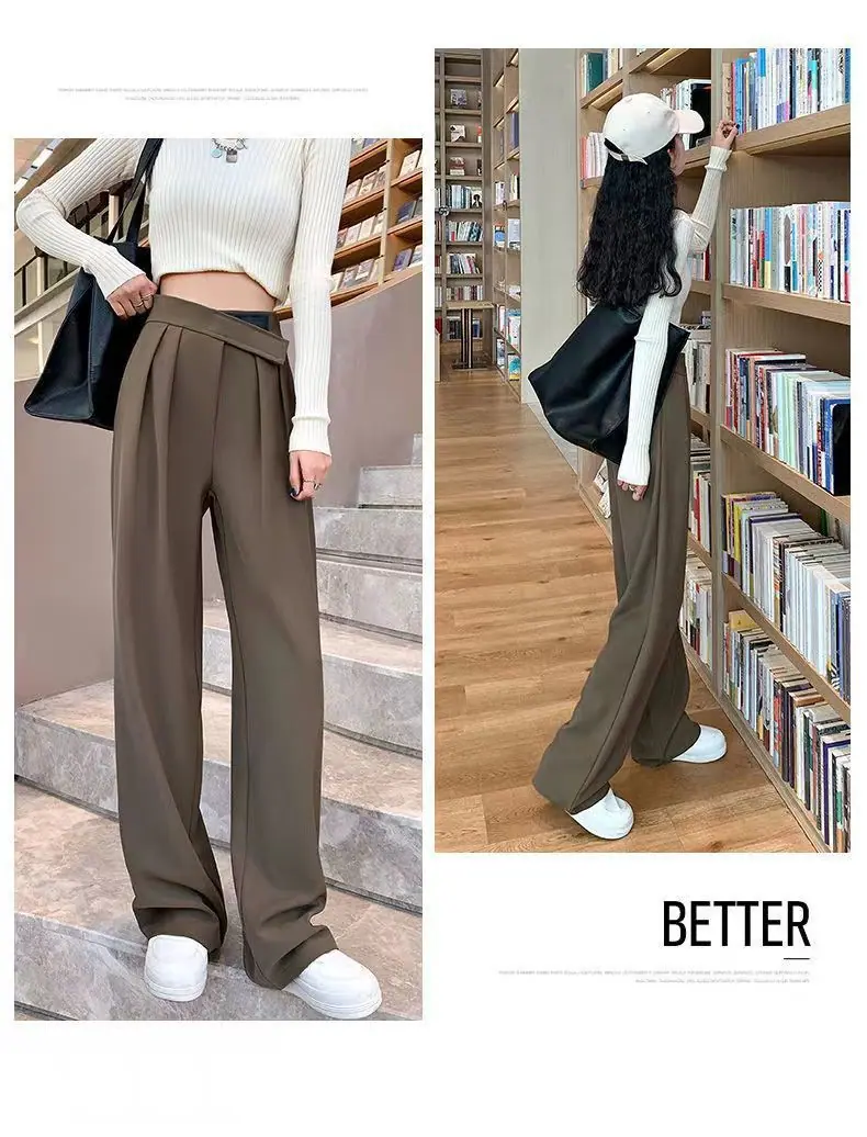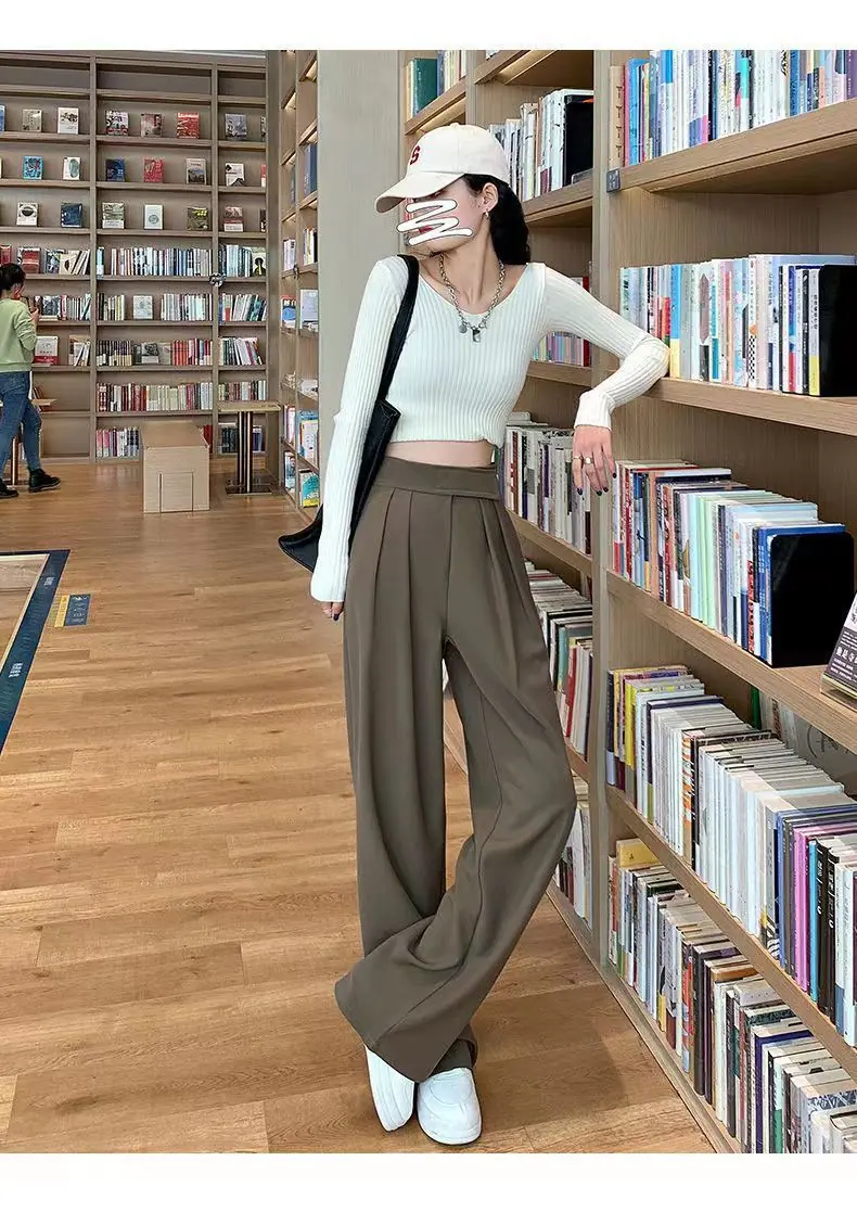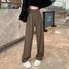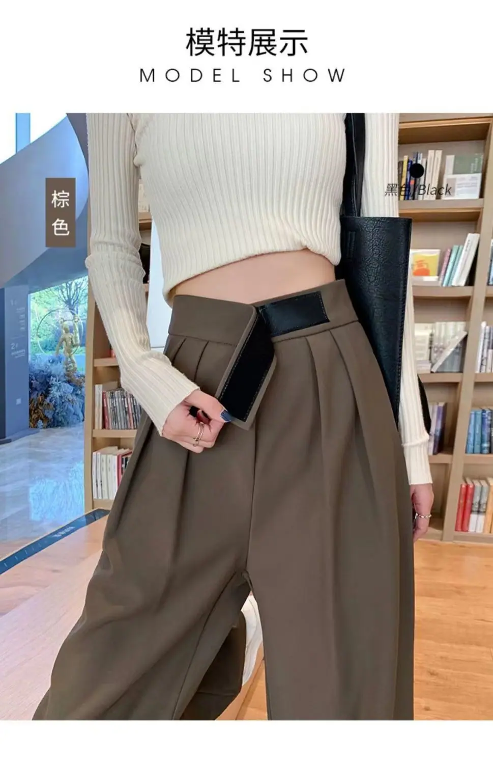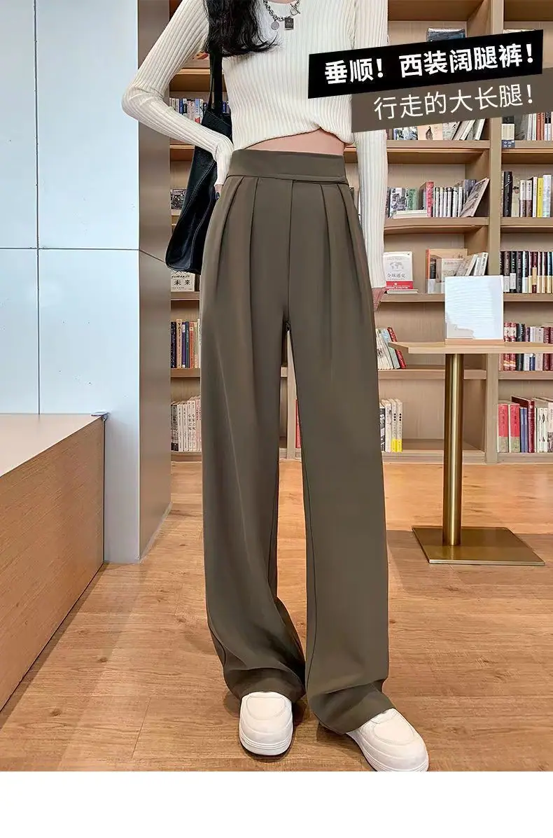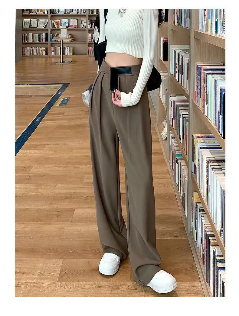 Pantalones de Velcro Color Café para Mujer Primavera y Verano Cintura Alta Dosis Largo Corte Slim Recto Suelto Casual Pierna Ancha