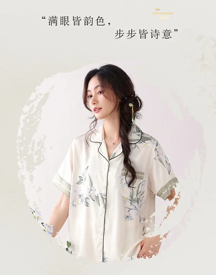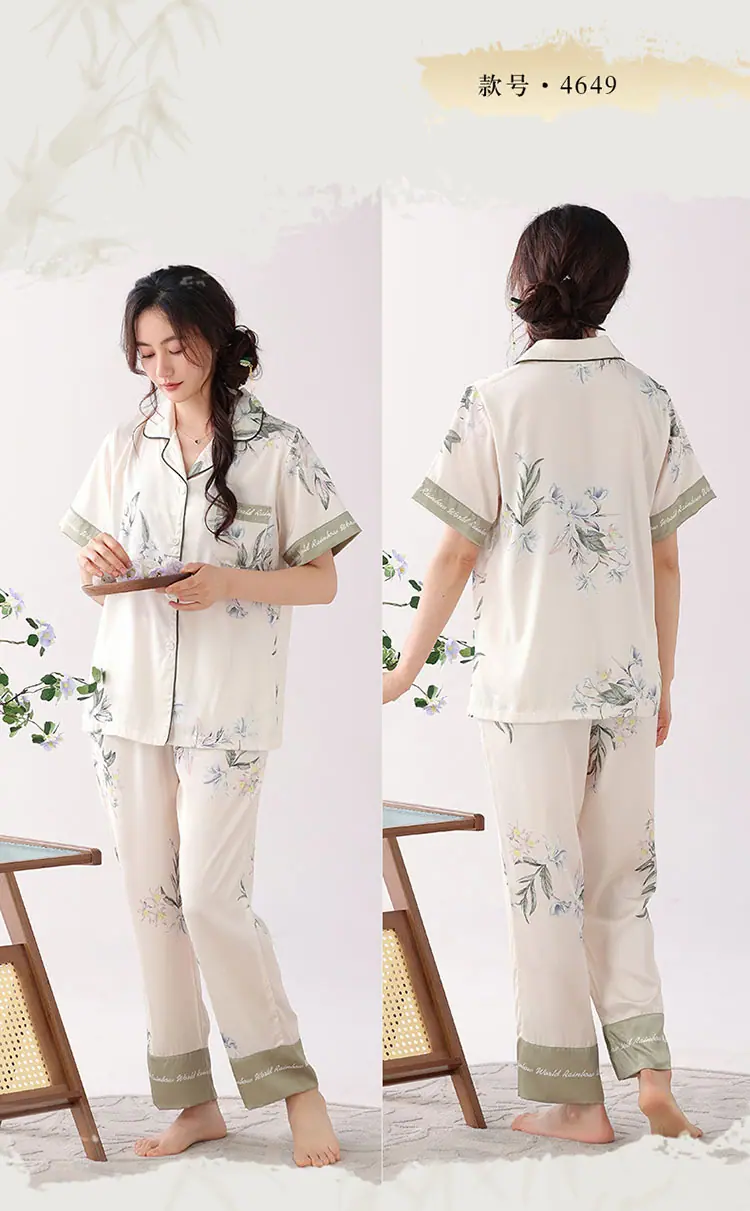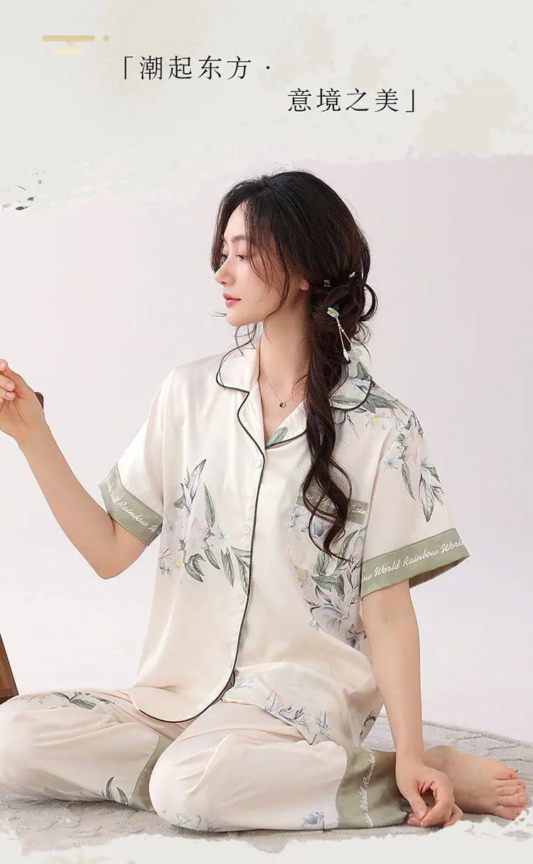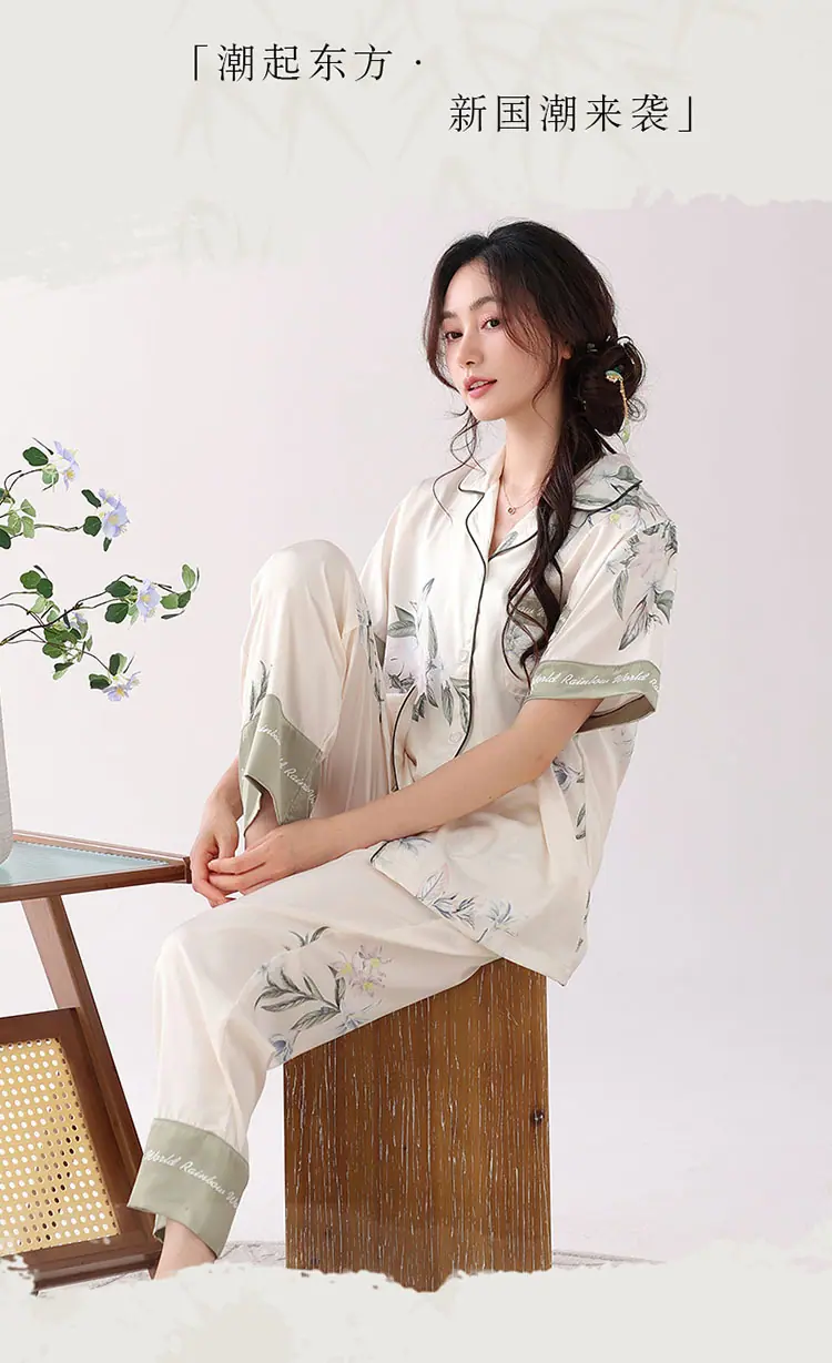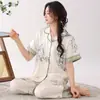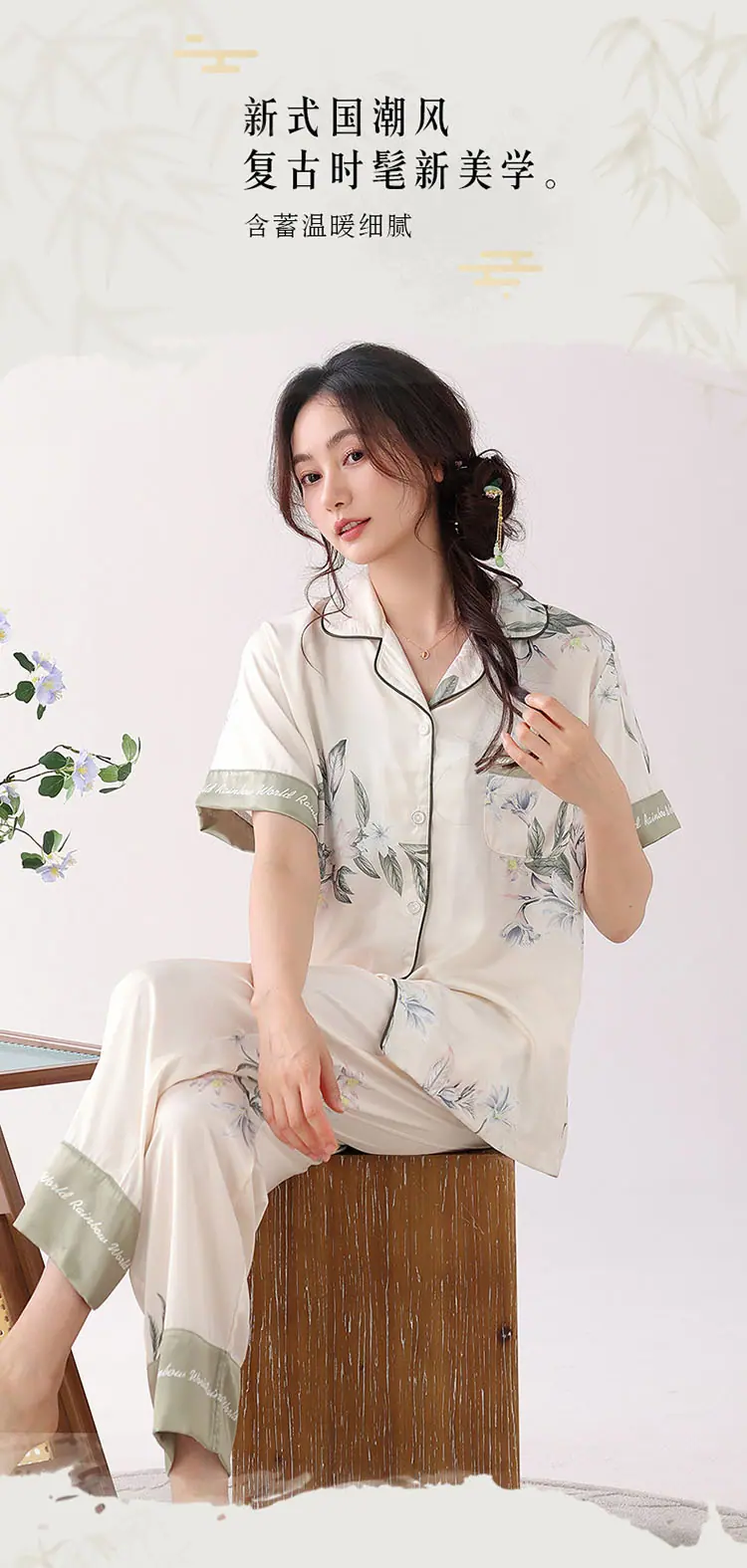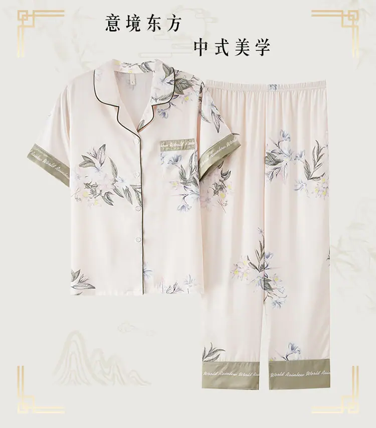 Traje de ropa para el hogar de estilo nacional chino de alta gama, estilo nuevo, verano para mujer, fino, seda de hielo, manga corta, pantalones, talla grande, pijama