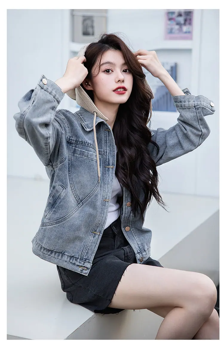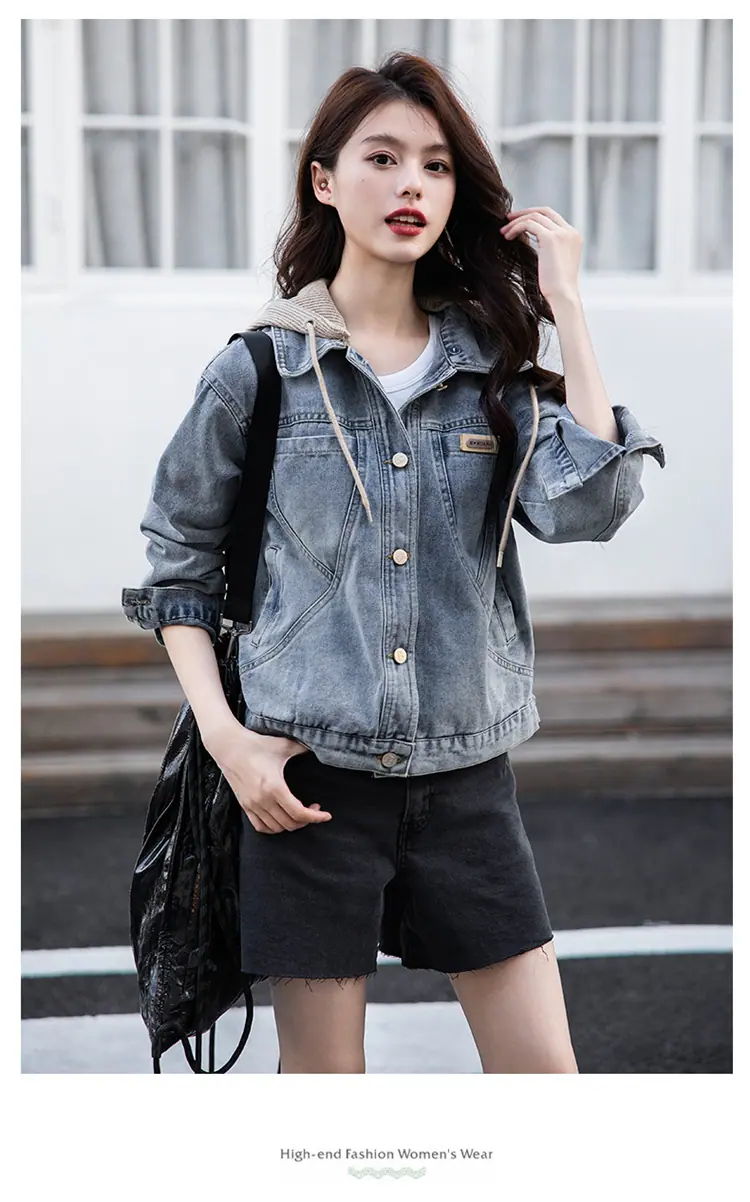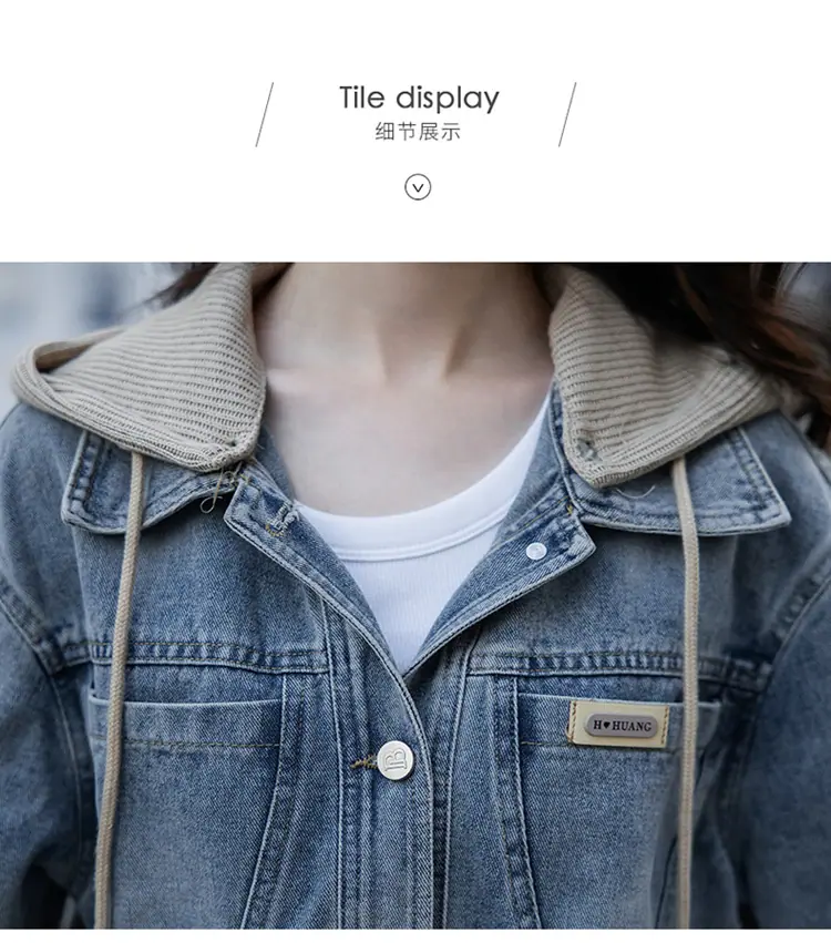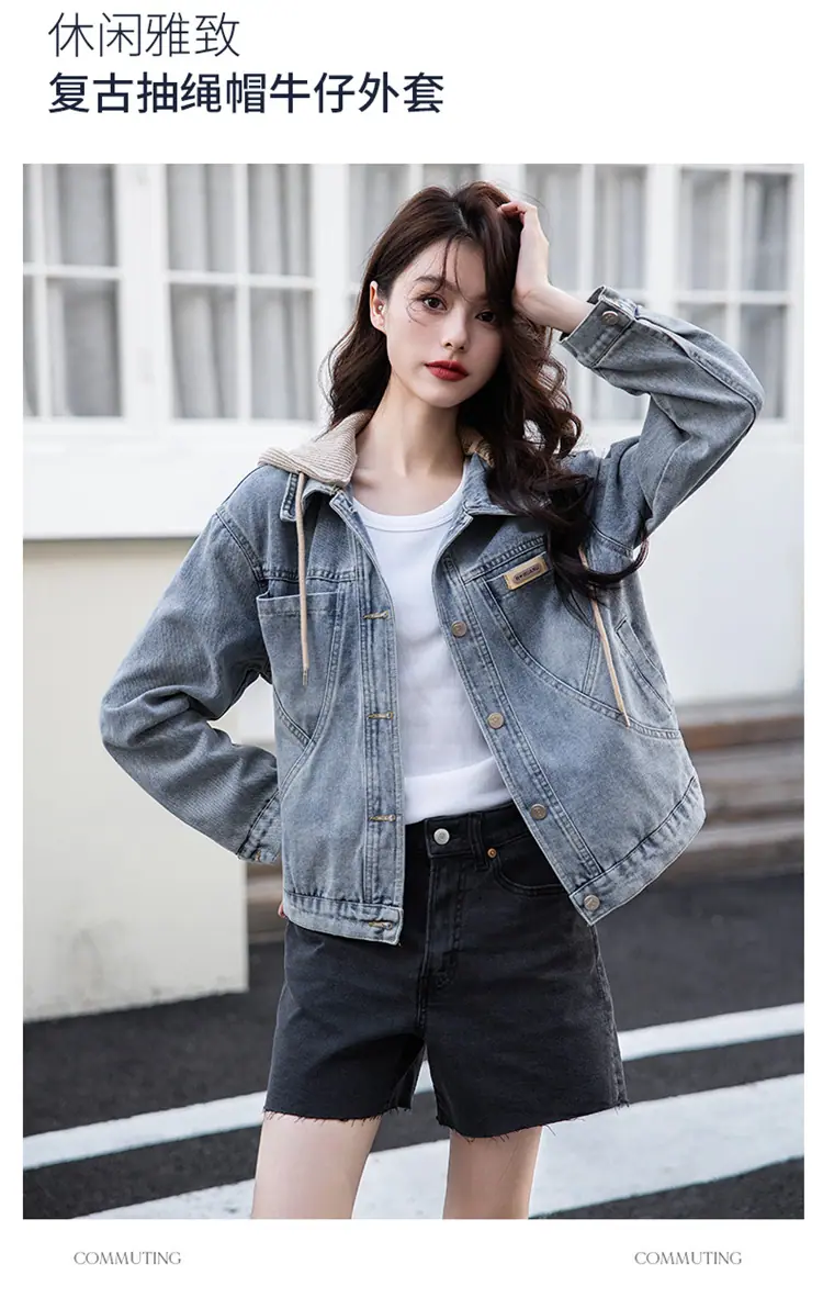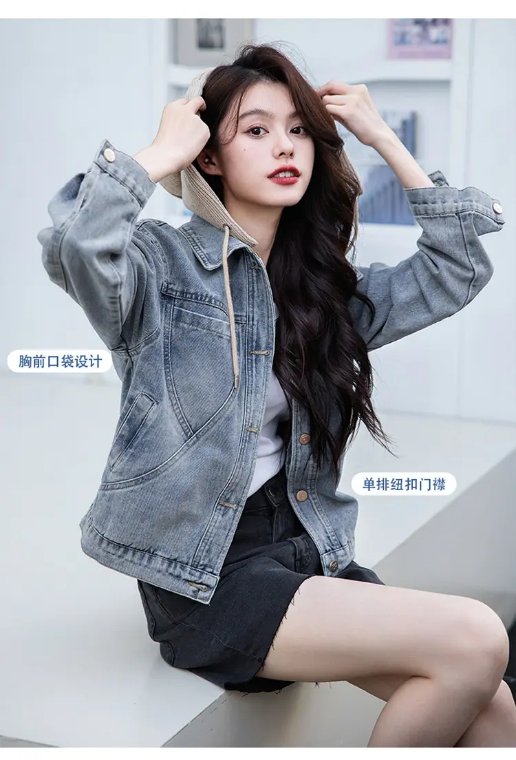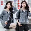 Chaqueta de mezclilla de moda retro para mujer 2025 primavera nueva talla pequeña elegante talla grande chaqueta con capucha top corto