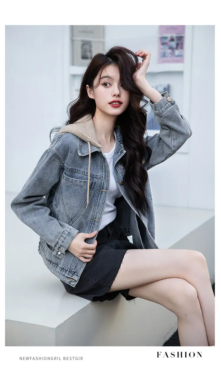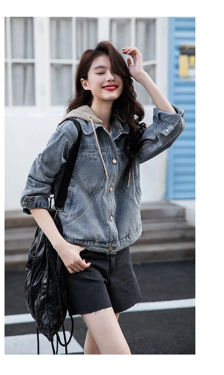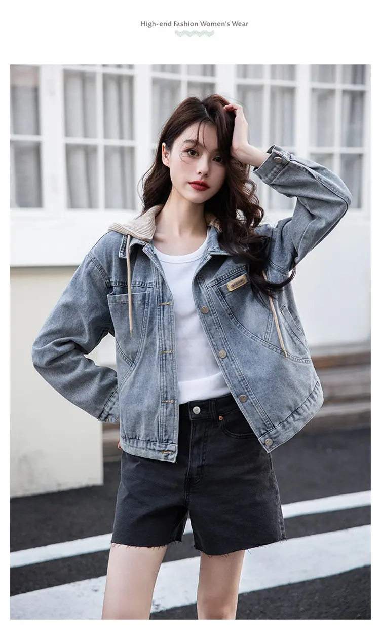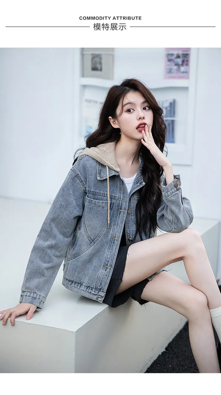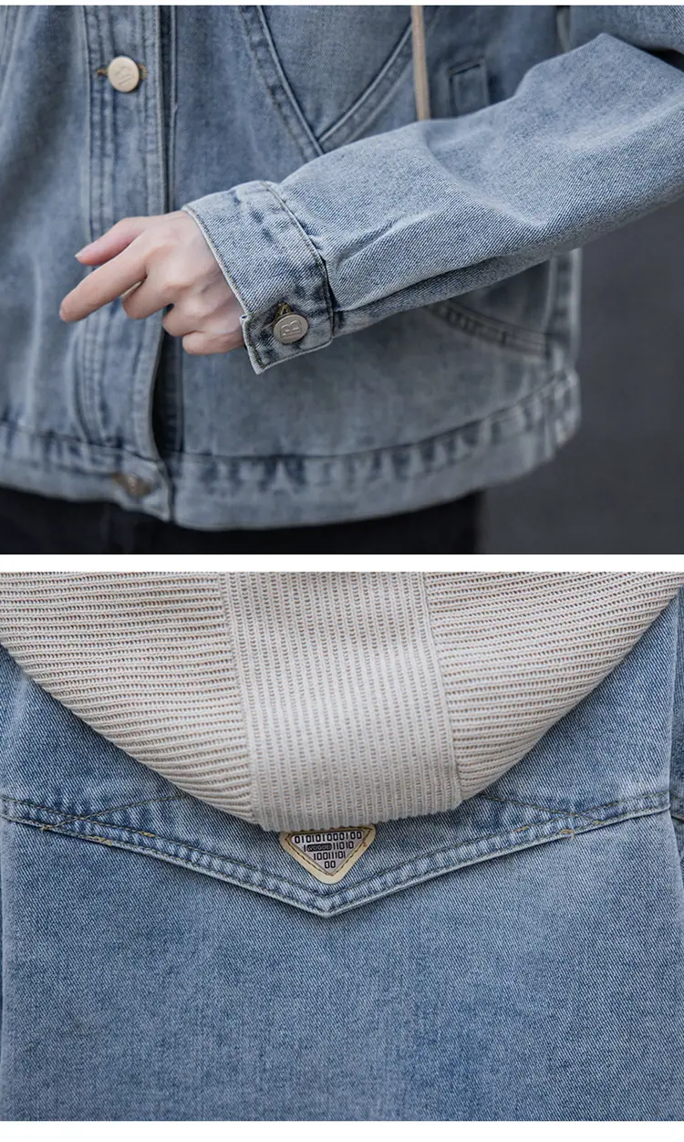 Chaqueta de mezclilla de moda retro para mujer 2025 primavera nueva talla pequeña elegante talla grande chaqueta con capucha top corto