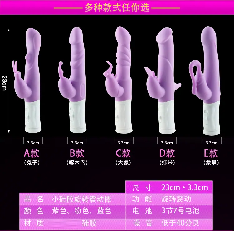 Este vibrador:Hay 5 estilos (estilo A conejo, estilo B pájaro carpintero, estilo C elefante, estilo D camarón, estilo E trompa de elefante), 3 colores (púrpura, rosa, azul) los colores se envían al azar,(Caja negra predeterminada) Para embalaje transparente, ¡tome nota usted mismo o contacte con el servicio de atención al cliente!, ¡por favor haga su pedido de acuerdo con las especificaciones del producto!