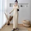 Vestido Largo de Punto Ajustado con Cuello en V para Mujer Otoño e Invierno Ajustado Cubre Caderas Suéter de Punto Interior Falda Larga por Debajo de la Rodilla