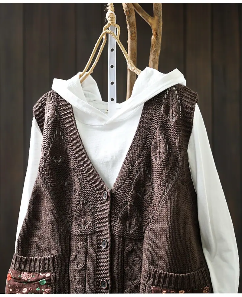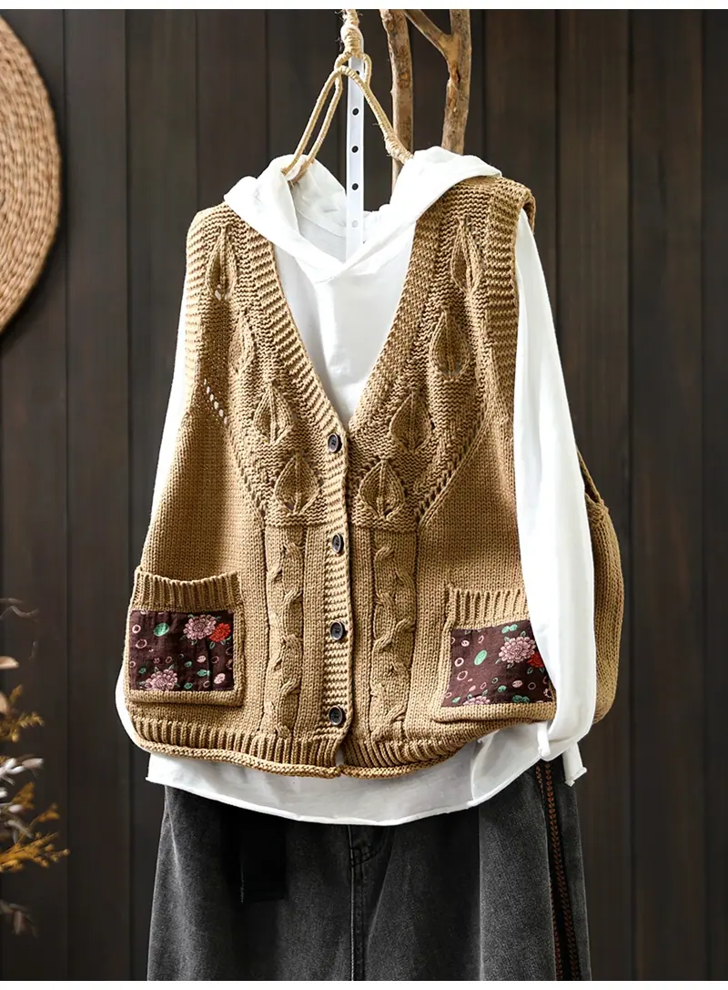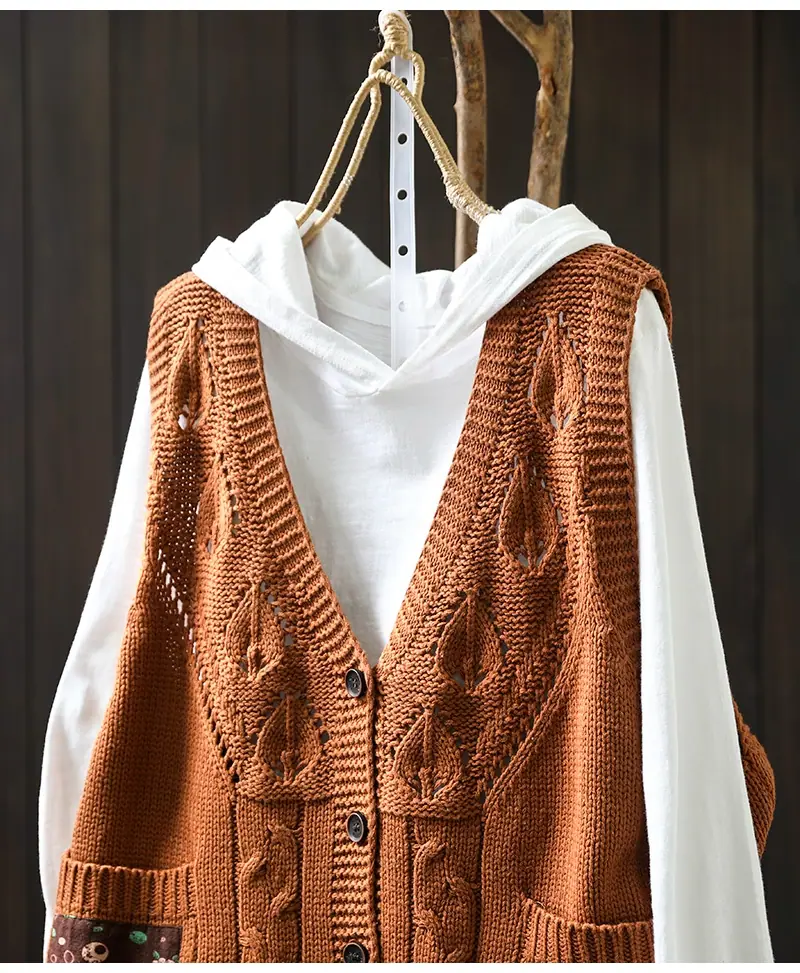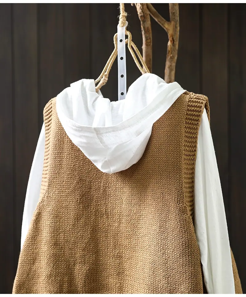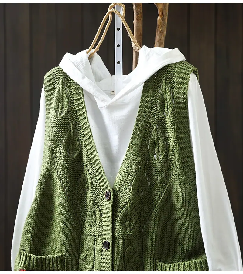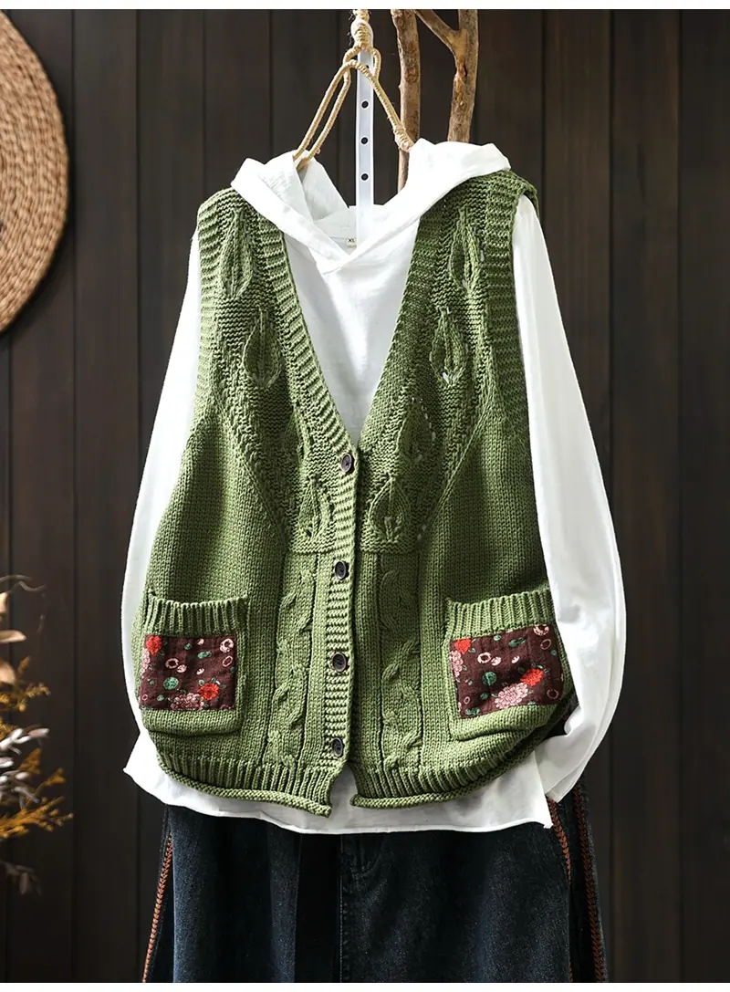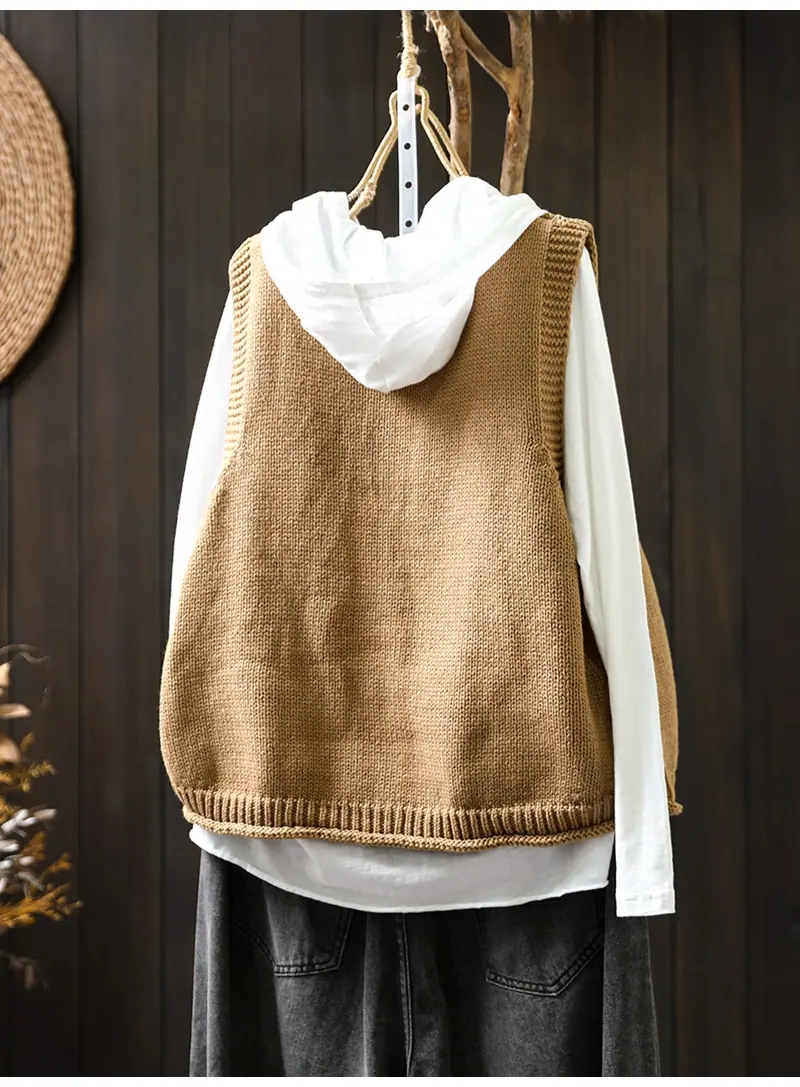 Chaleco Cárdigan de Punto de Algodón con Cuello en V y Bolsillo Acolchado para Mujer, Holgado, Adelgazante, Otoño, Vintage, Artístico, sin Mangas, Apilado en la Cintura