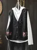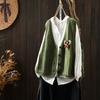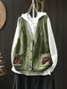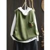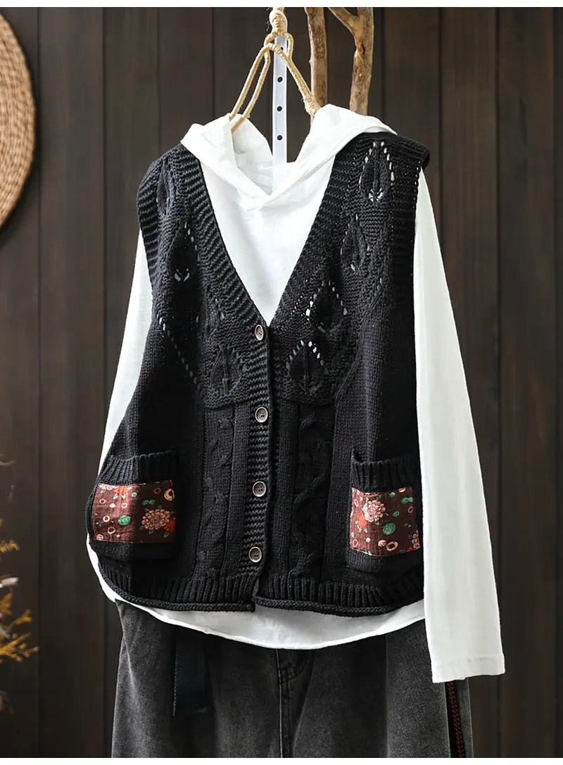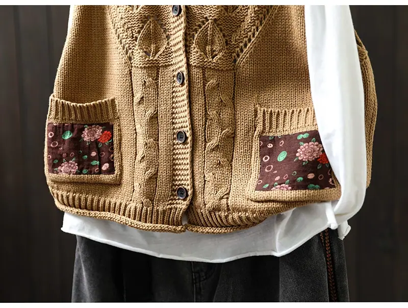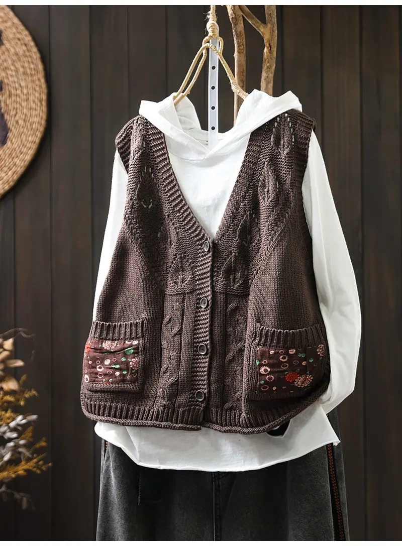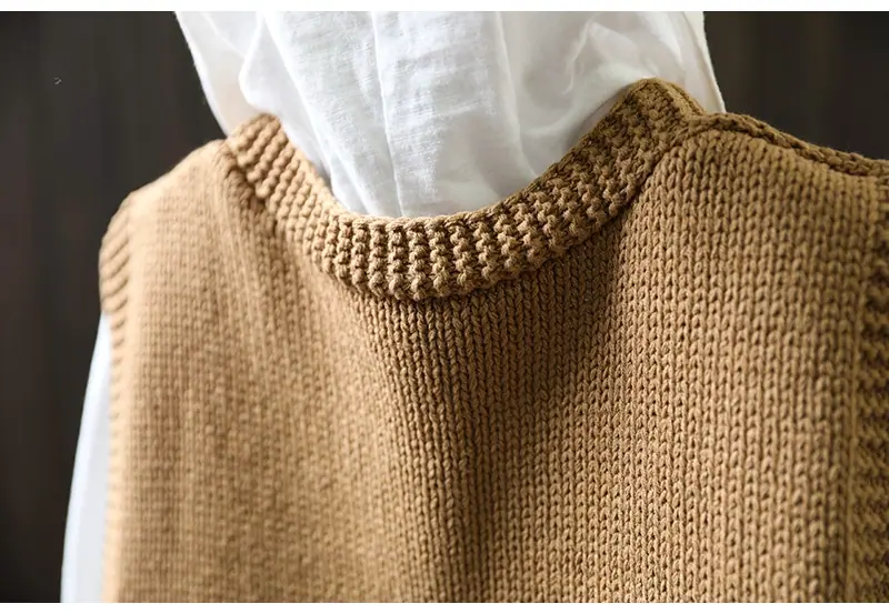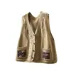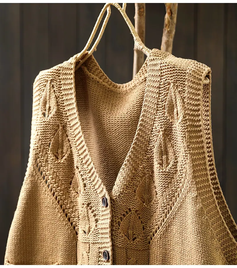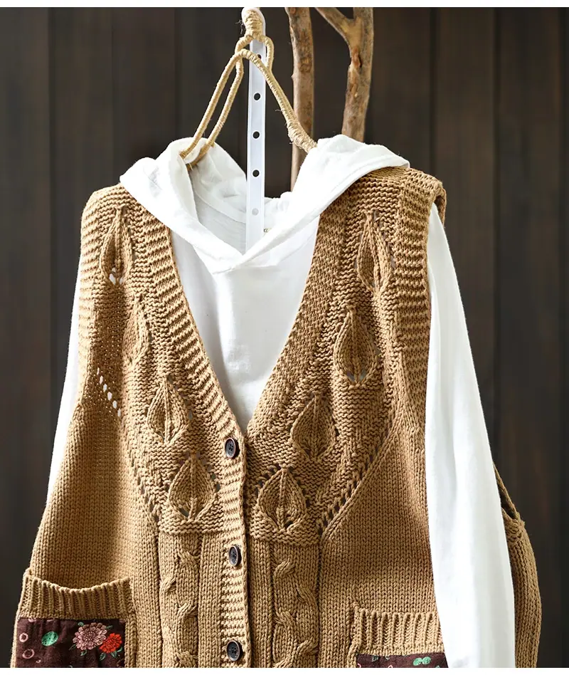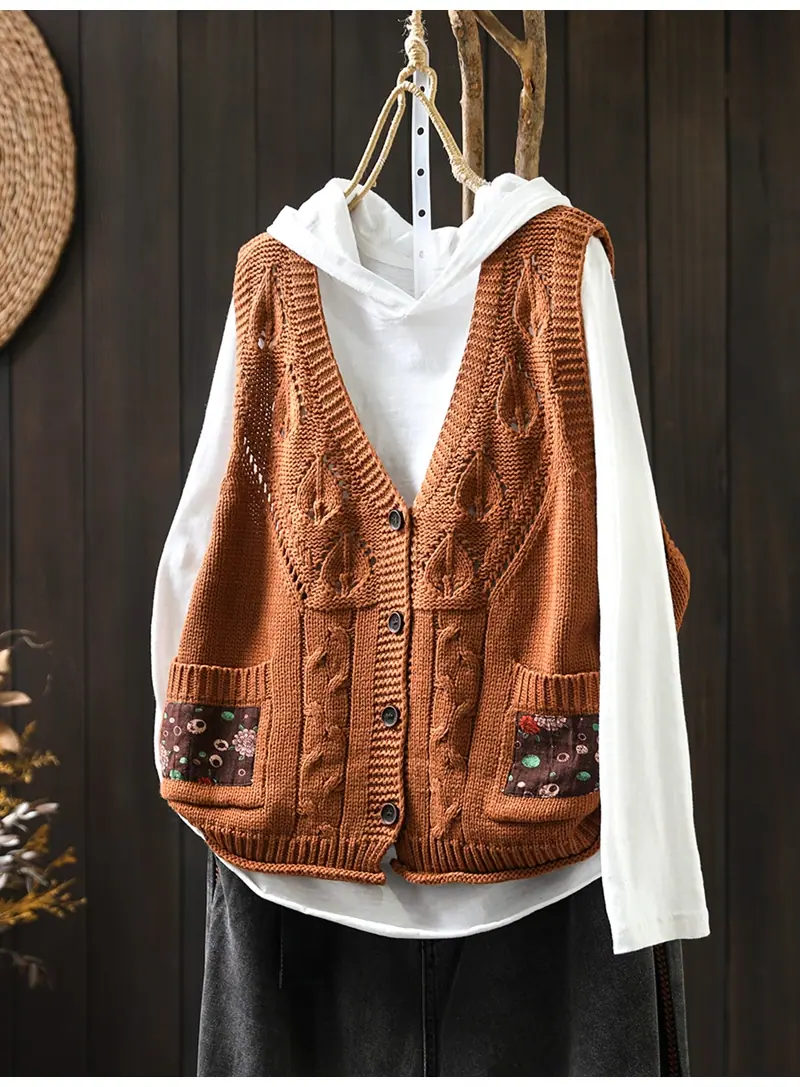 Chaleco Cárdigan de Punto de Algodón con Cuello en V y Bolsillo Acolchado para Mujer, Holgado, Adelgazante, Otoño, Vintage, Artístico, sin Mangas, Apilado en la Cintura