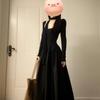 Vestido Hepburn Francés de Cuello Cuadrado y Manga Larga para Mujer Otoño Falda Abullonada Negro Cintura Entallada Falda Larga