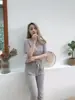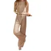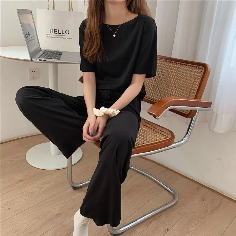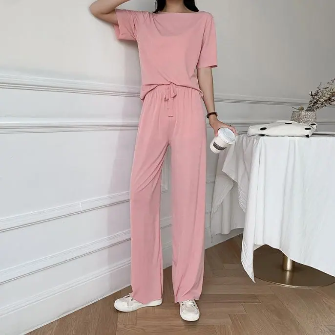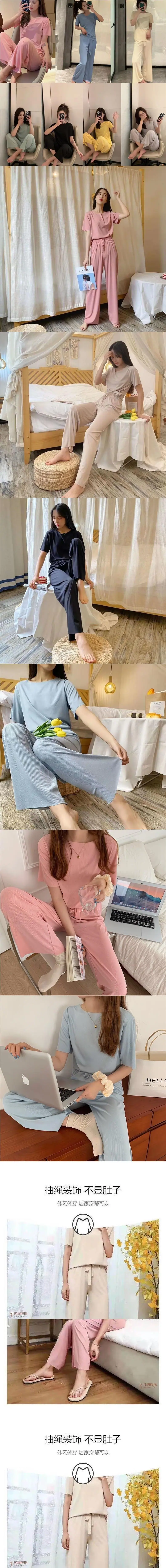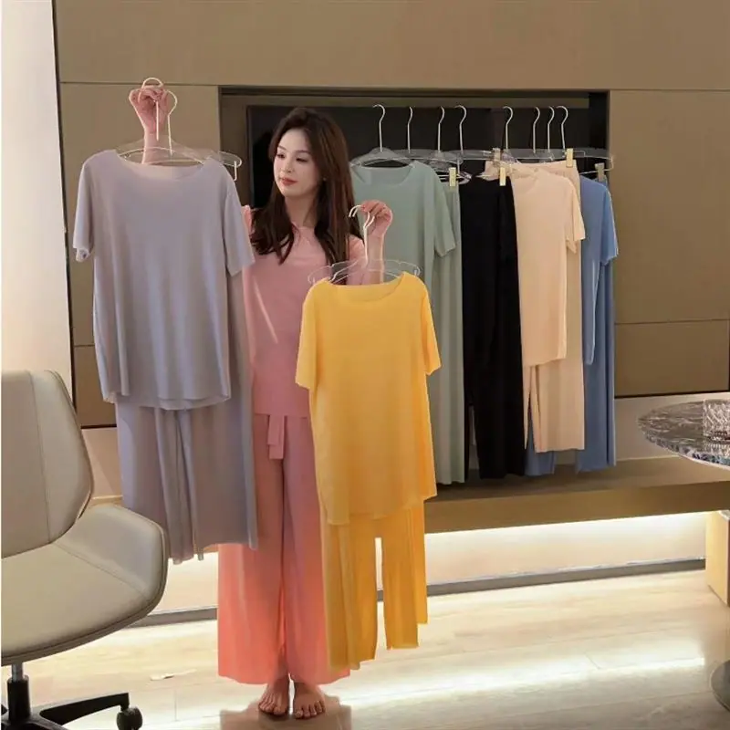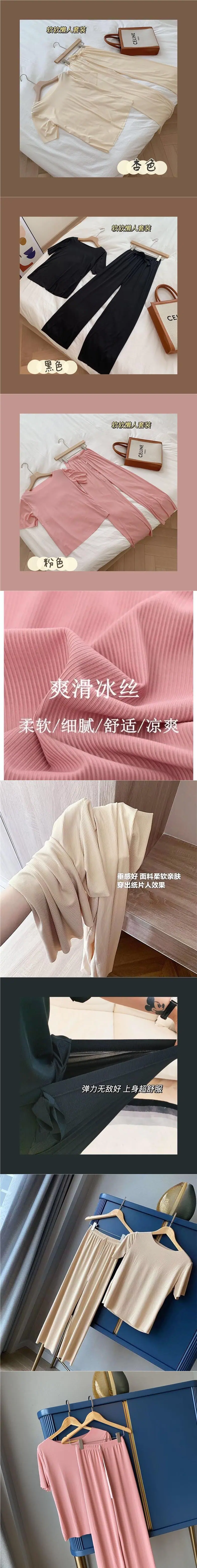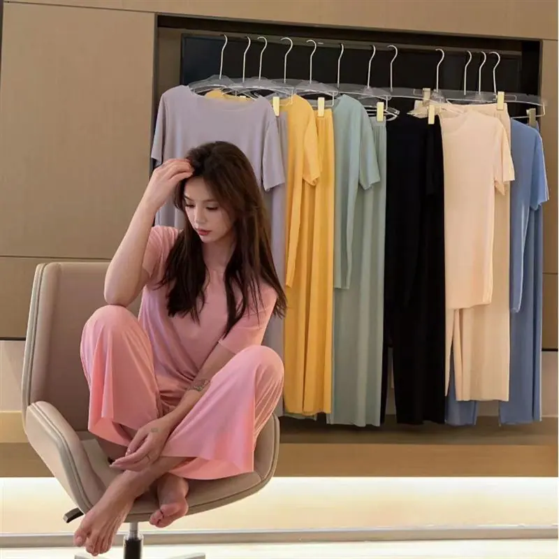 Cuello Redondo Moda Casual Holgada Delgada Ropa para el Hogar Suave Conjunto de Dos Piezas Temporada Manga Corta Pantalón Largo Conjunto de Pijama Mujer Verano Seda Helada