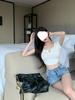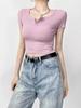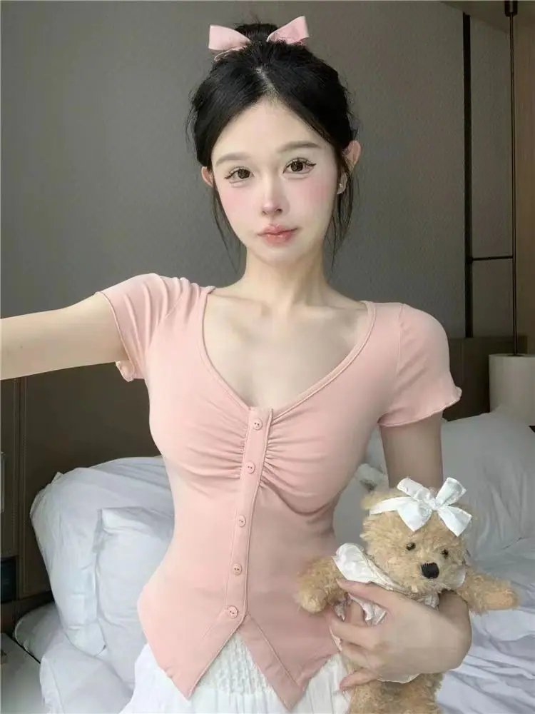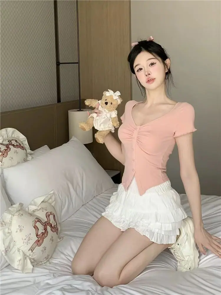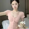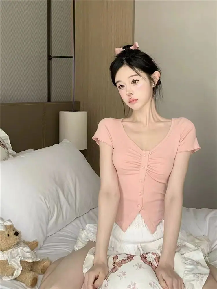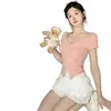 Camiseta Blanca de Cuello en V y Hombro Descubierto de Manga Corta para Mujer Diseño de Verano Plisada Cintura Alta Ombligo Descubierto Top Corto con Abertura