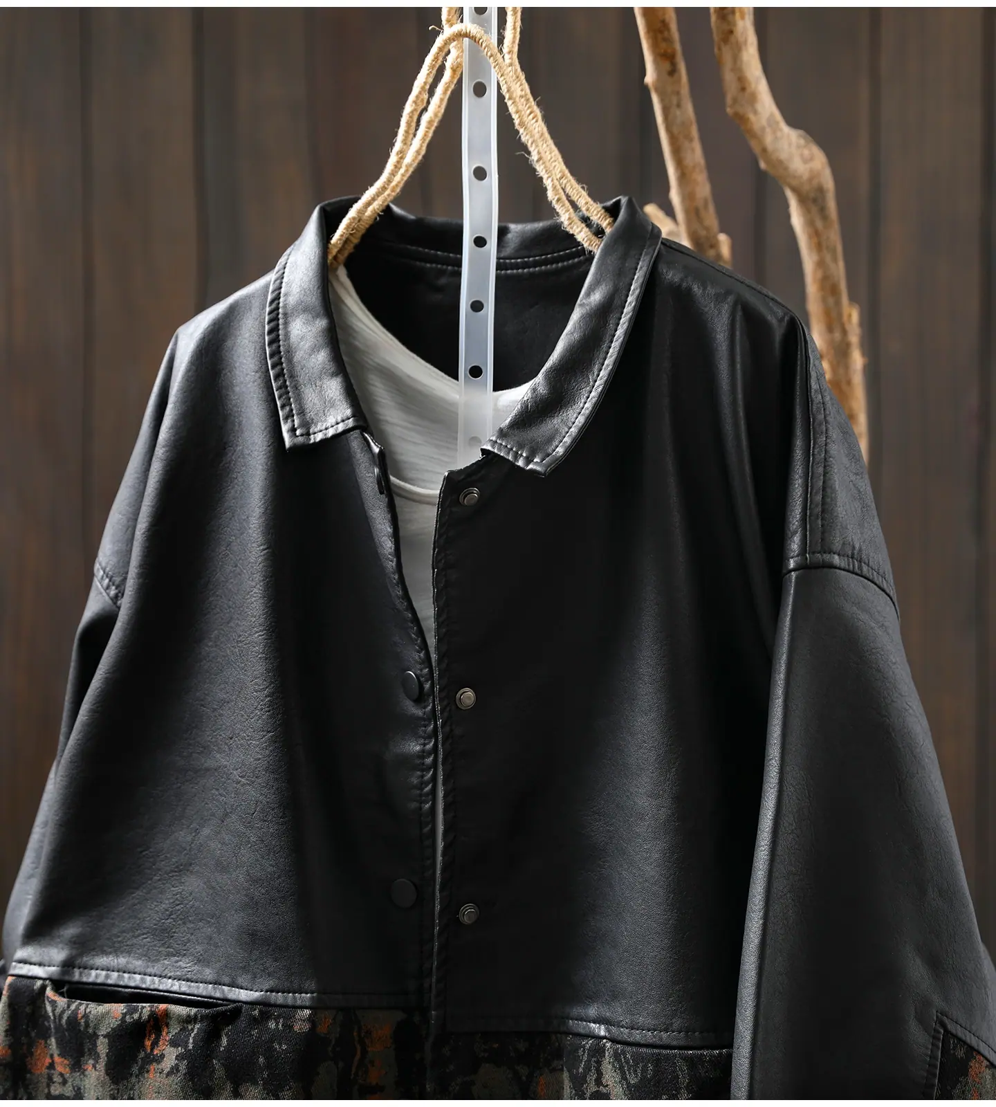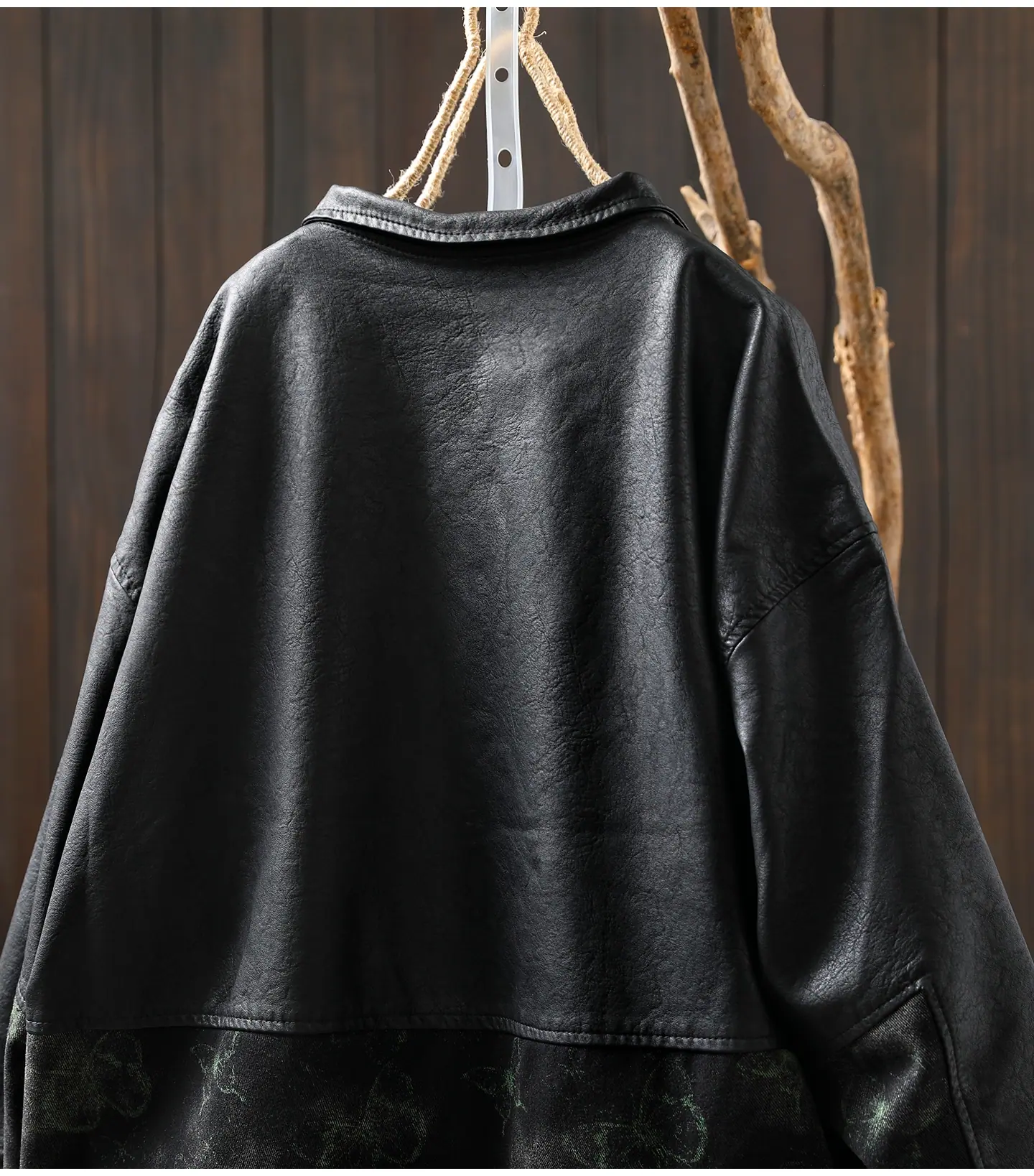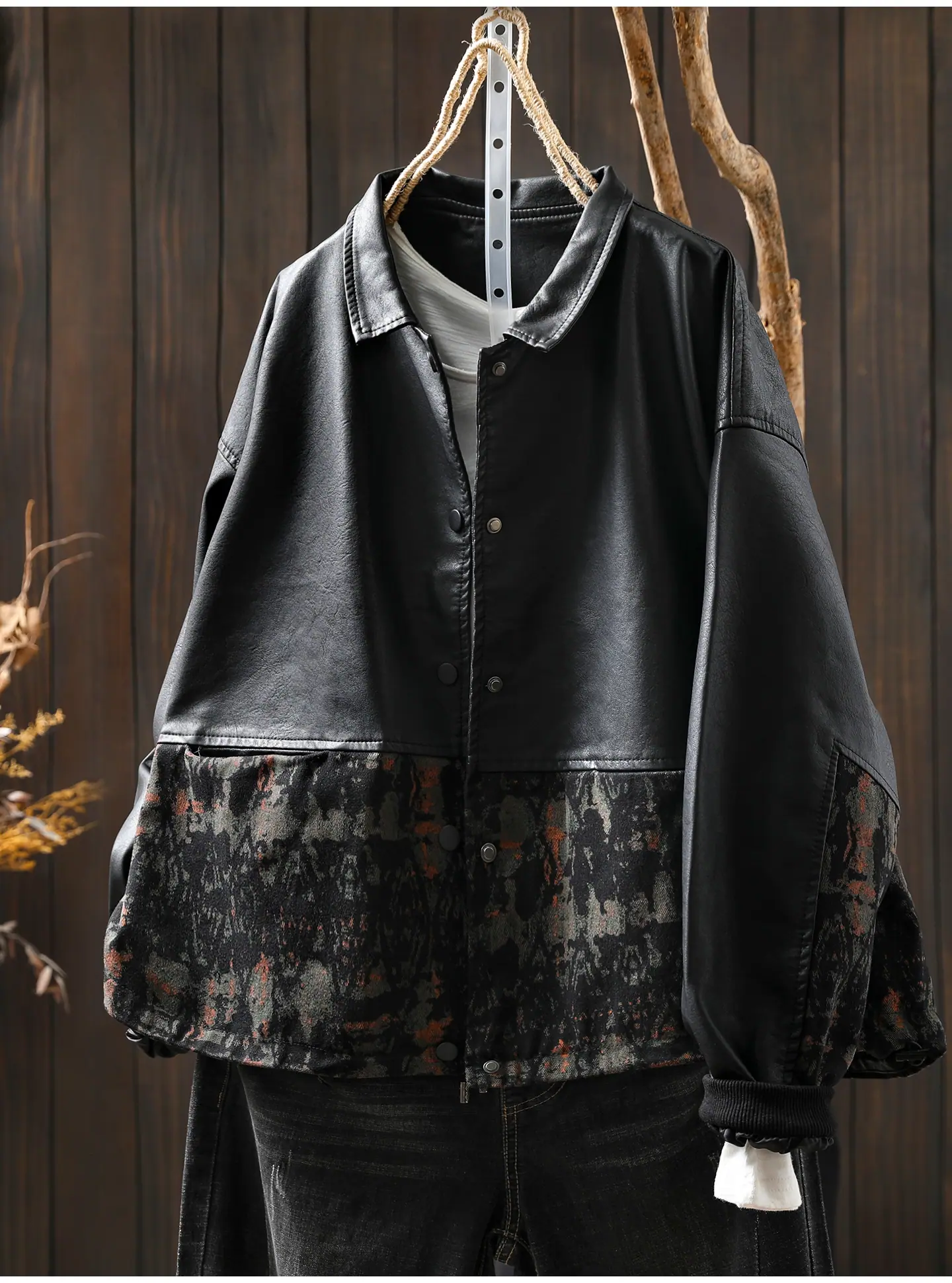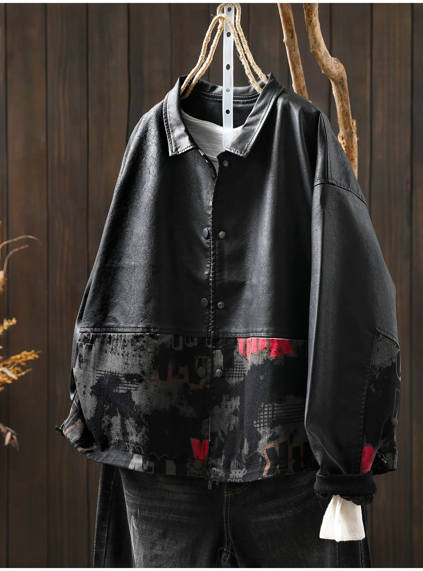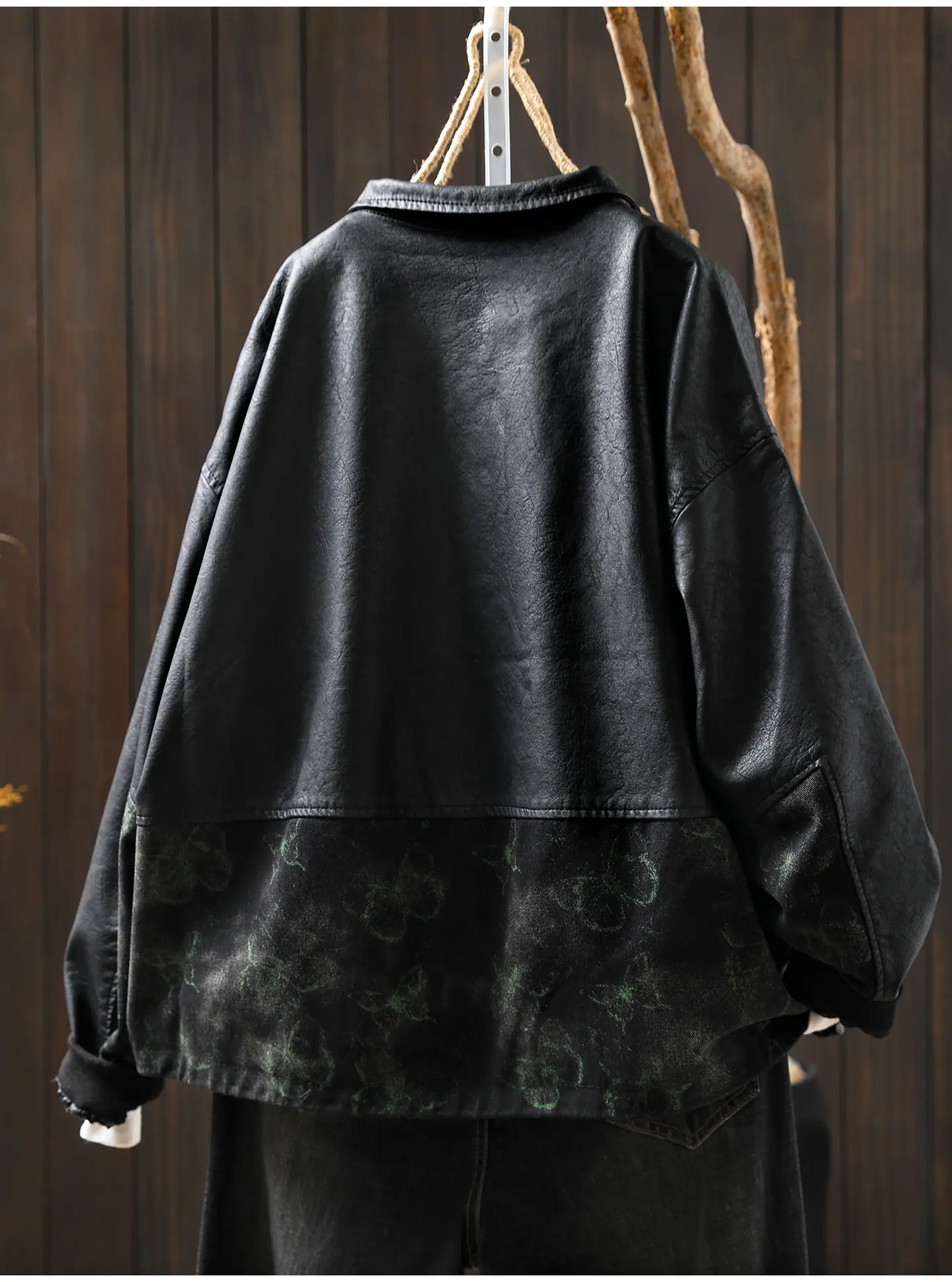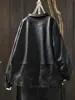 Chaqueta de Cuero Corta para Mujer 2025 Otoño Nueva Estampado Patchwork Cuello Vuelto PU Cuero Suelta Moda Estilo Extranjero Chaqueta de Cuero