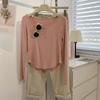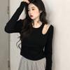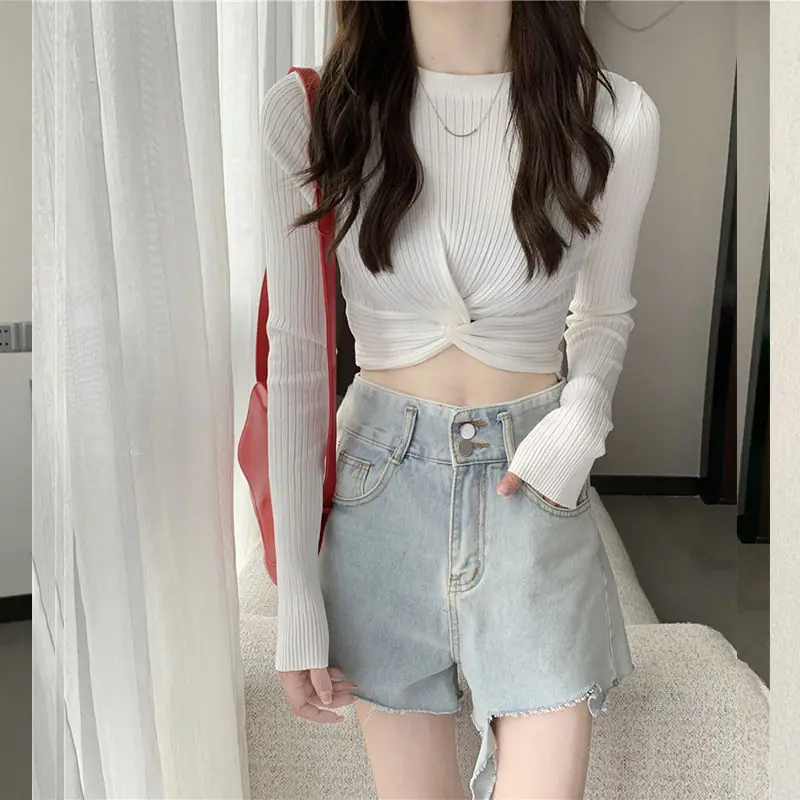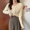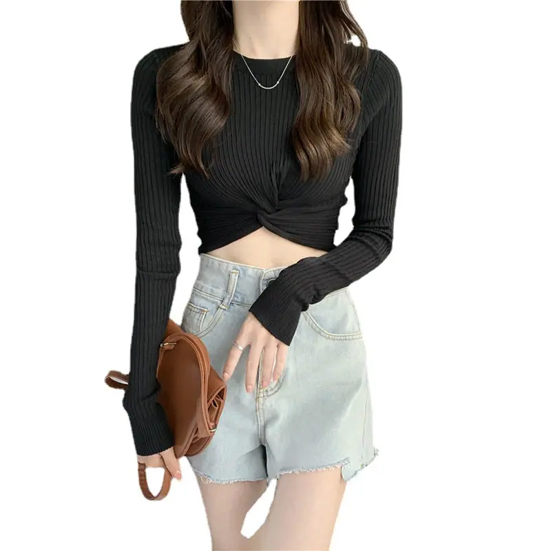 Camiseta de Manga Larga Cruzada Tejido de Punto para Mujer 2023 Nuevo Verano Diseño Coreano Nicho Slim Top Corto