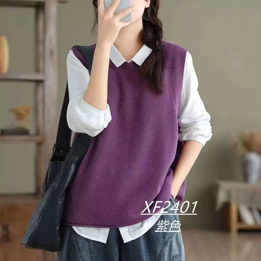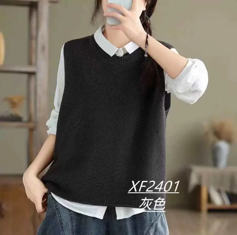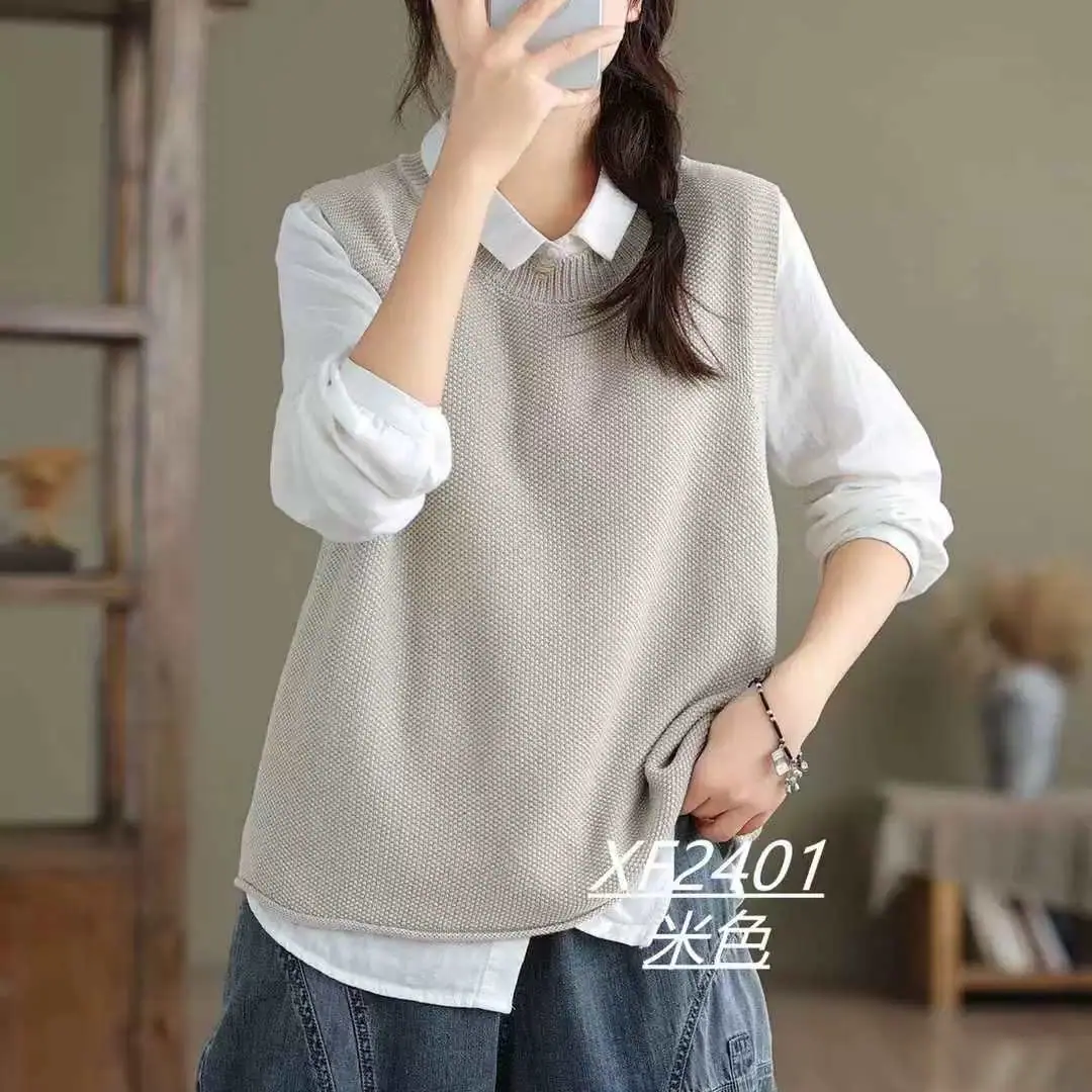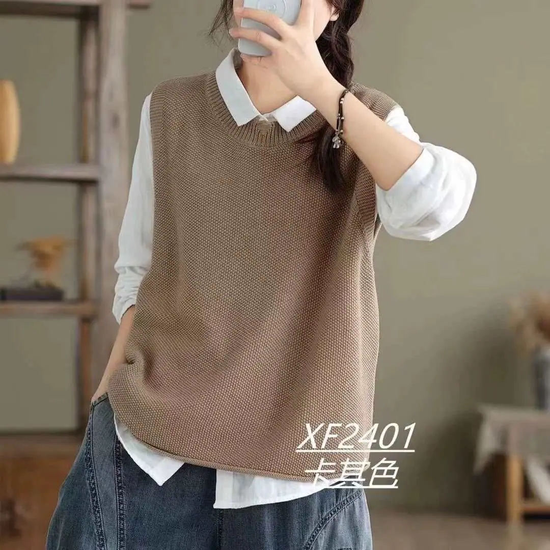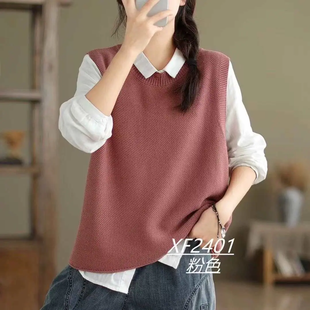 Chaleco Suéter de Punto sin Mangas de Hilo de Algodón Versátil de Color Sólido con Cuello Redondo para Mujer Primavera Otoño 2025 Tank Top Tejido Adelgazante Exterior Tendencia