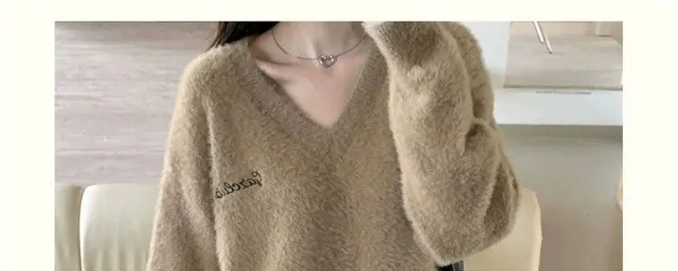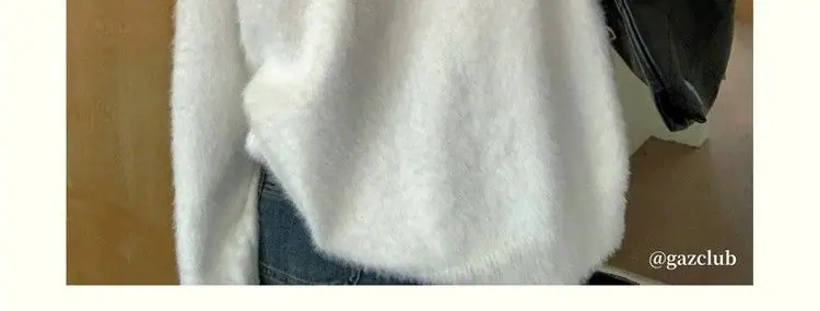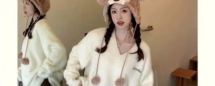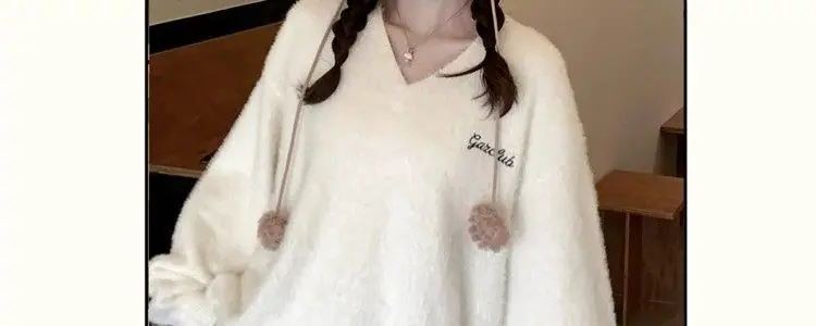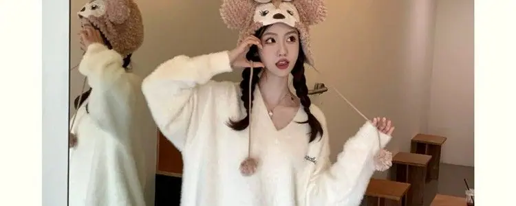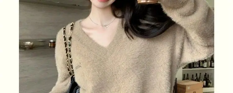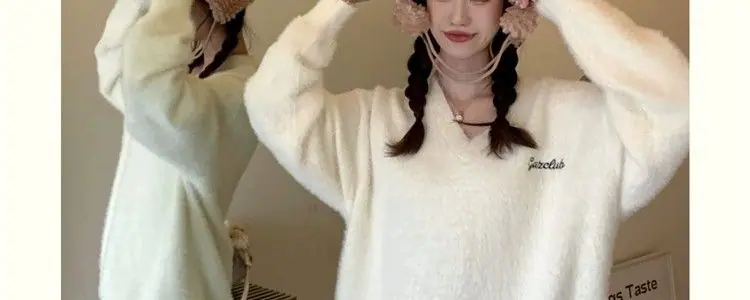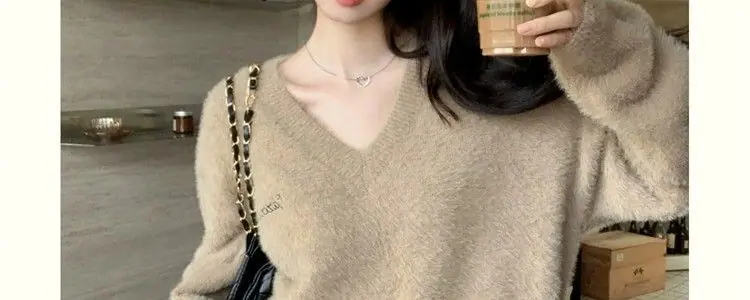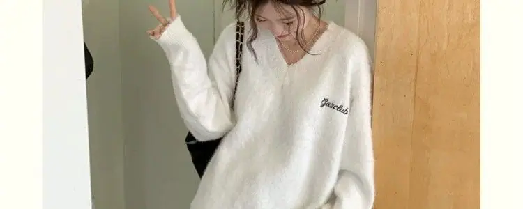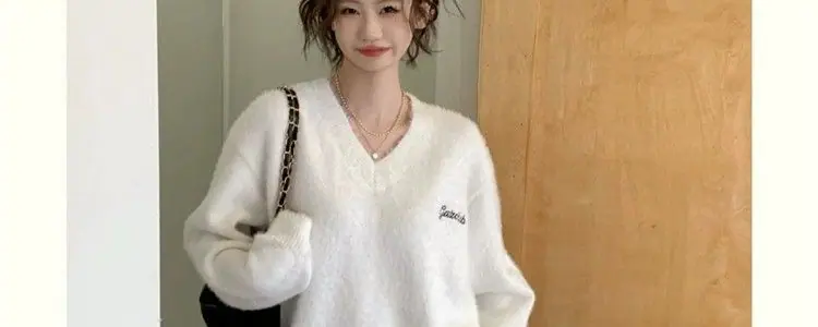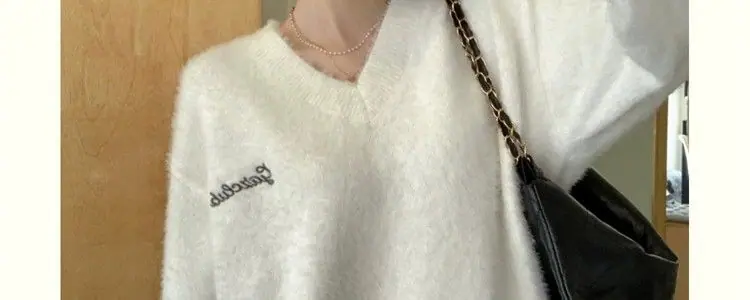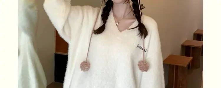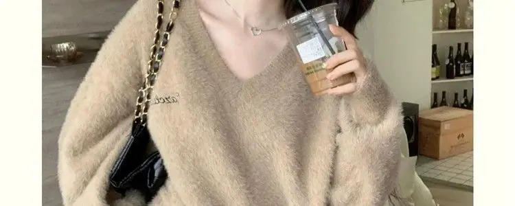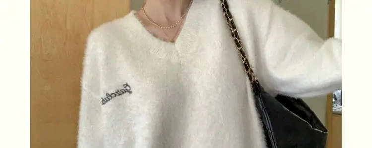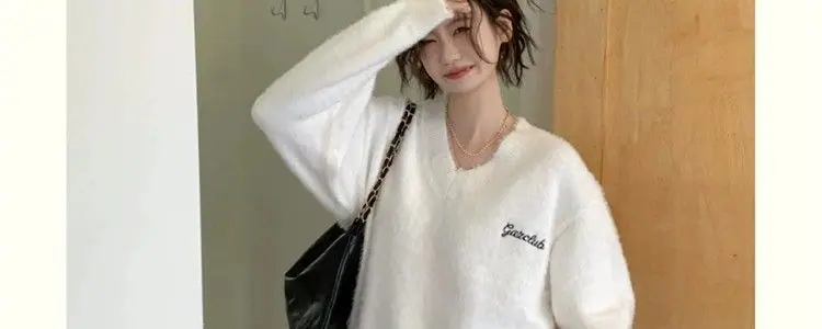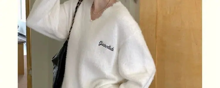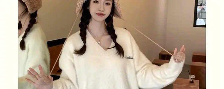 Suéter de punto japonés retro de otoño e invierno con cuello en V para mujer, estilo holgazán, suéter blanco, terciopelo de visón sintético, top suave holgado