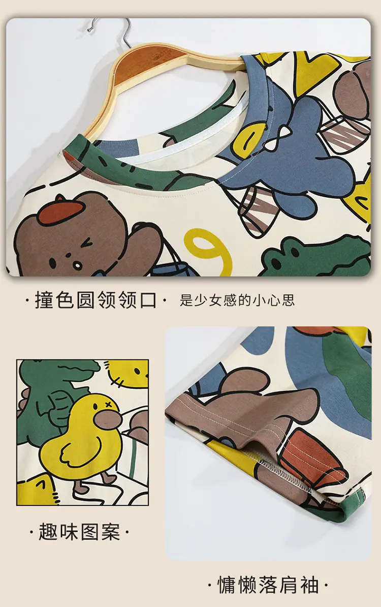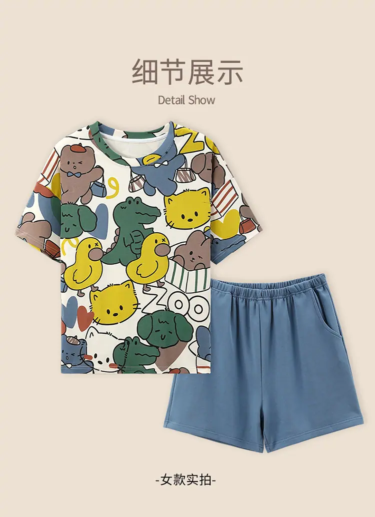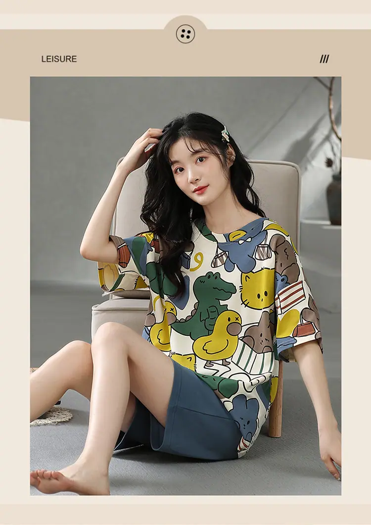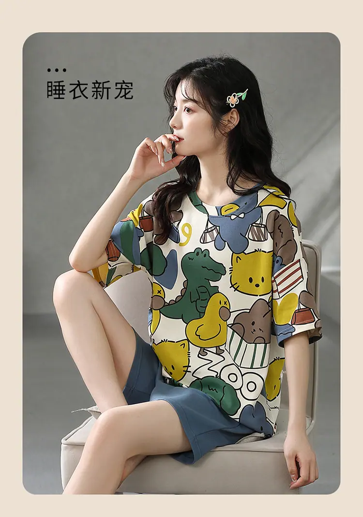 Pijama de Algodón Puro para Mujer Verano Manga Corta Holgado Talla Grande Delgado Nuevo Casual Ropa de Casa Traje de Dos Piezas