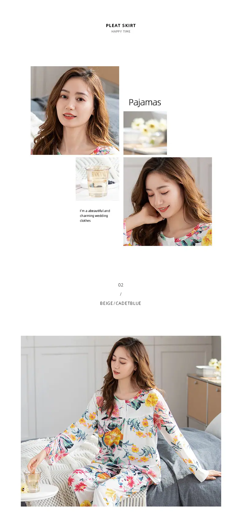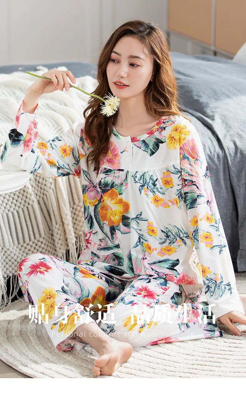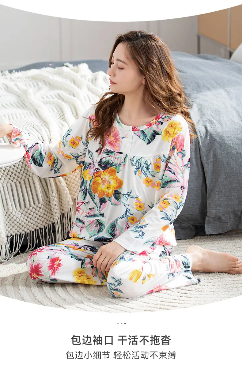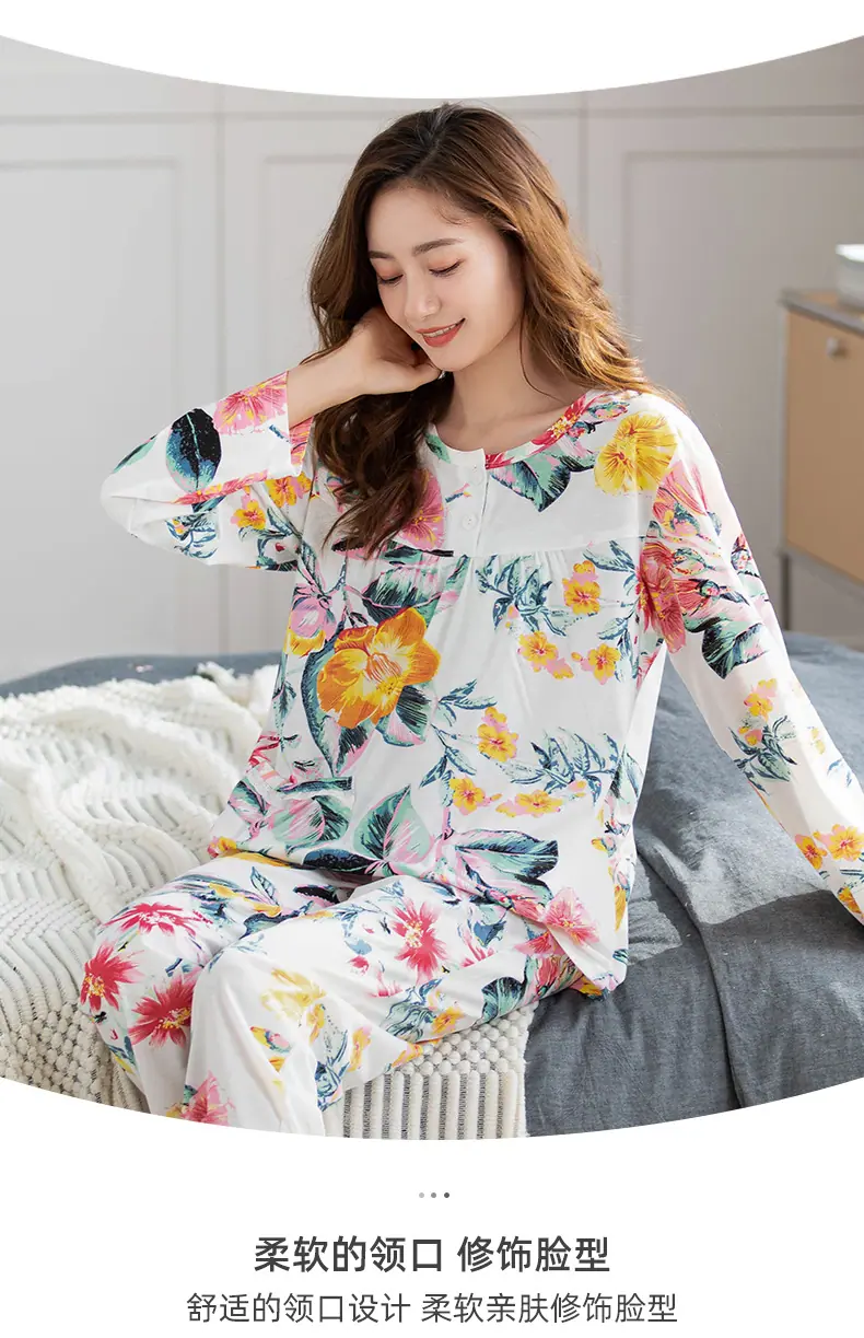 Pijama Modal para Mujer Primavera y Otoño Delgado Pantalones de Manga Larga Talla Grande para Nueva Madre Conjunto de Ropa para el Hogar