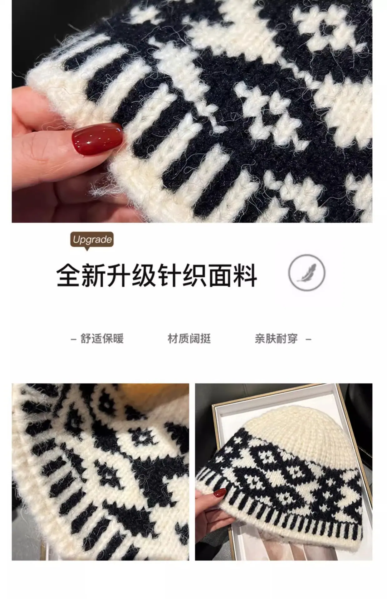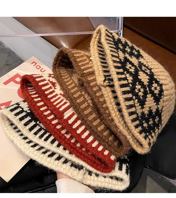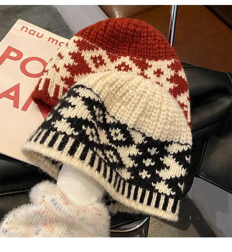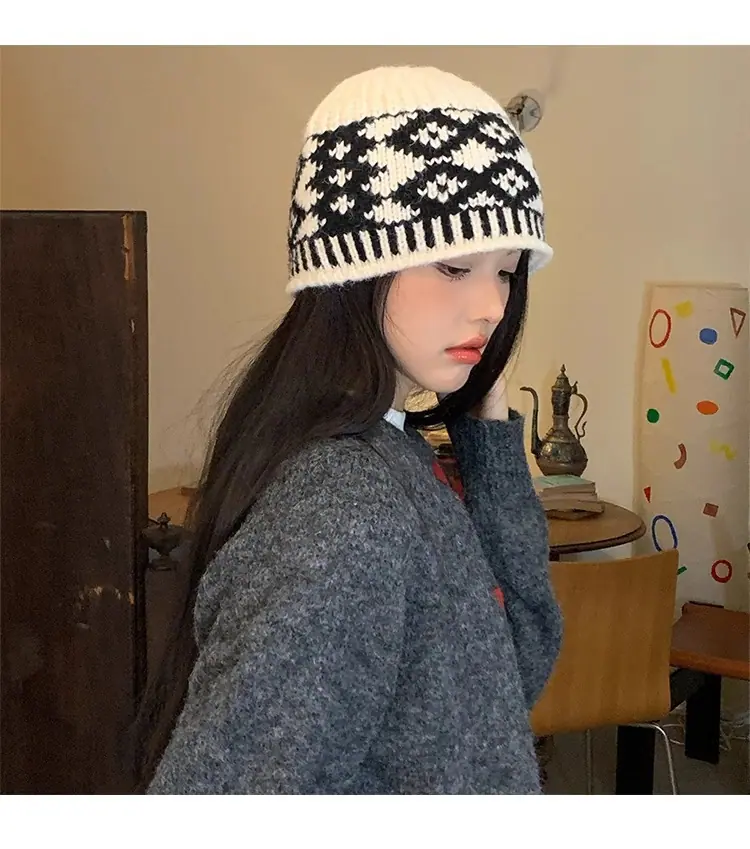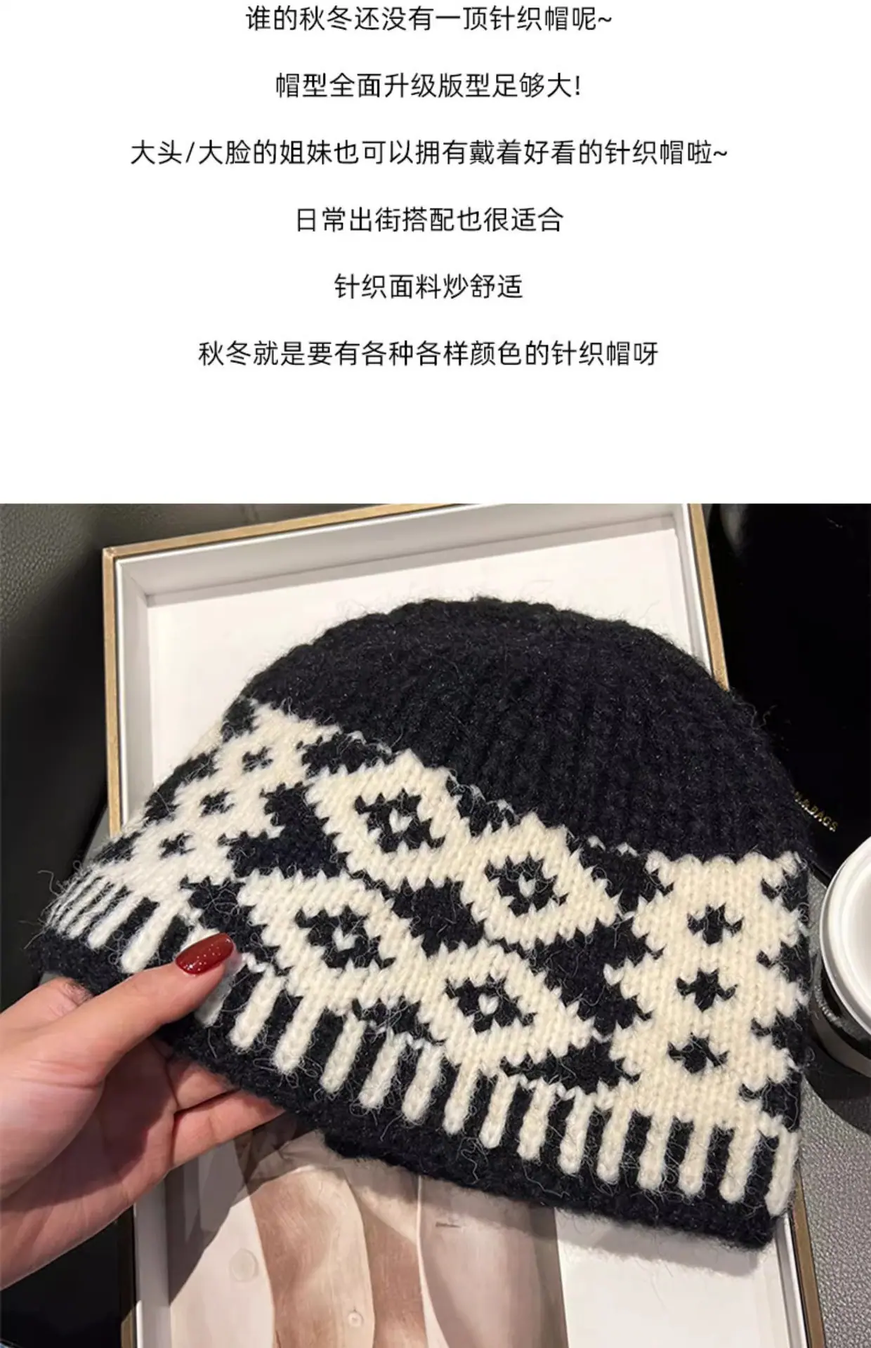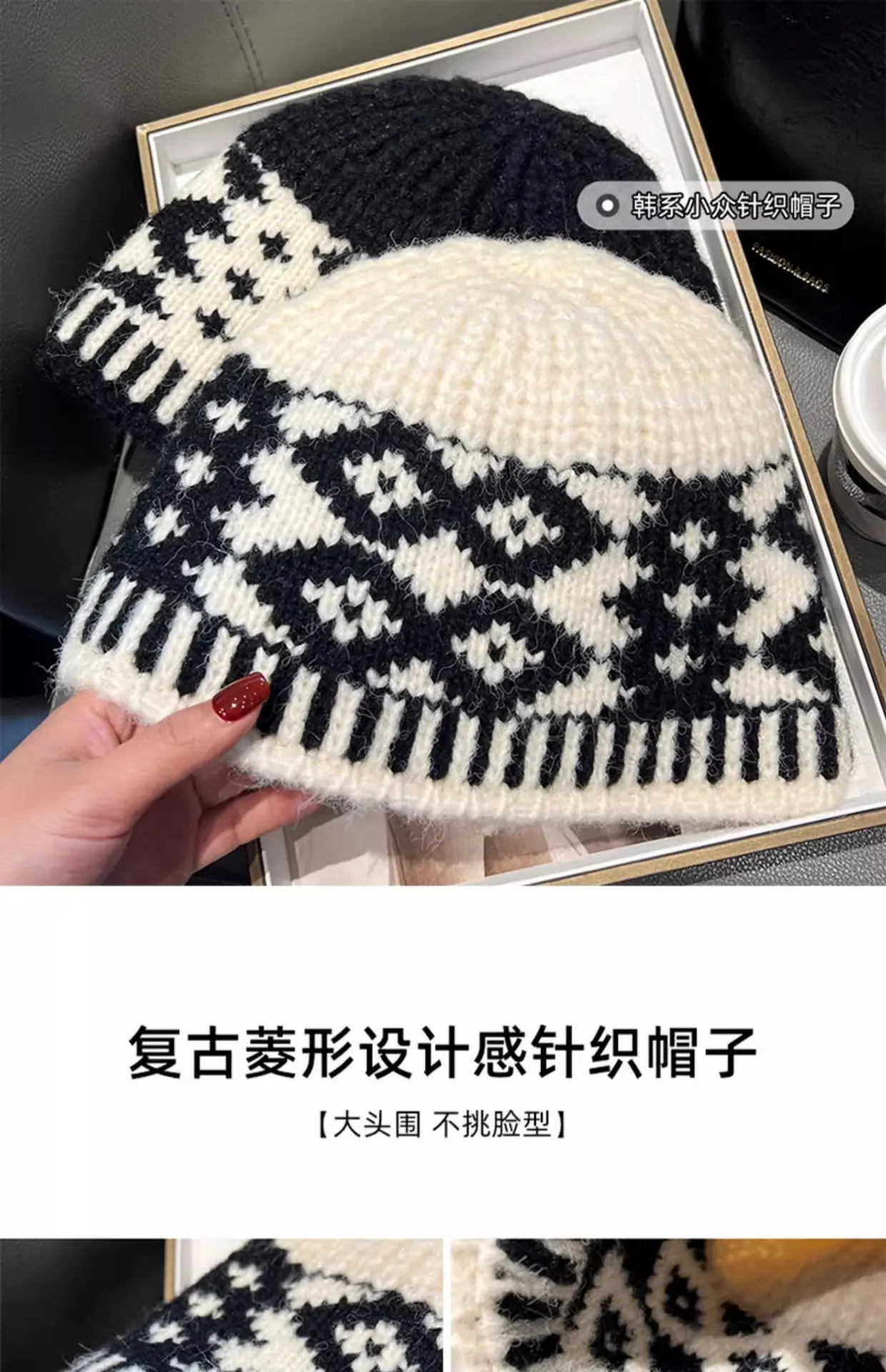 Gorro de Punto a Cuadros con Patrón de Diamantes Vintage para Mujer, Estilo Nicho Otoño e Invierno, Gorro Cálido y a Prueba de Frío
