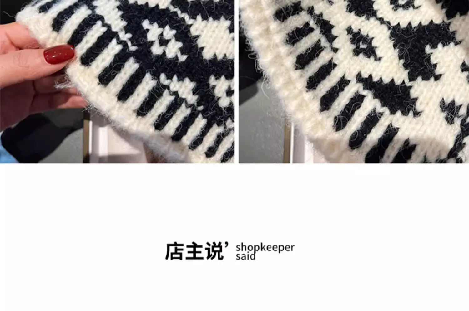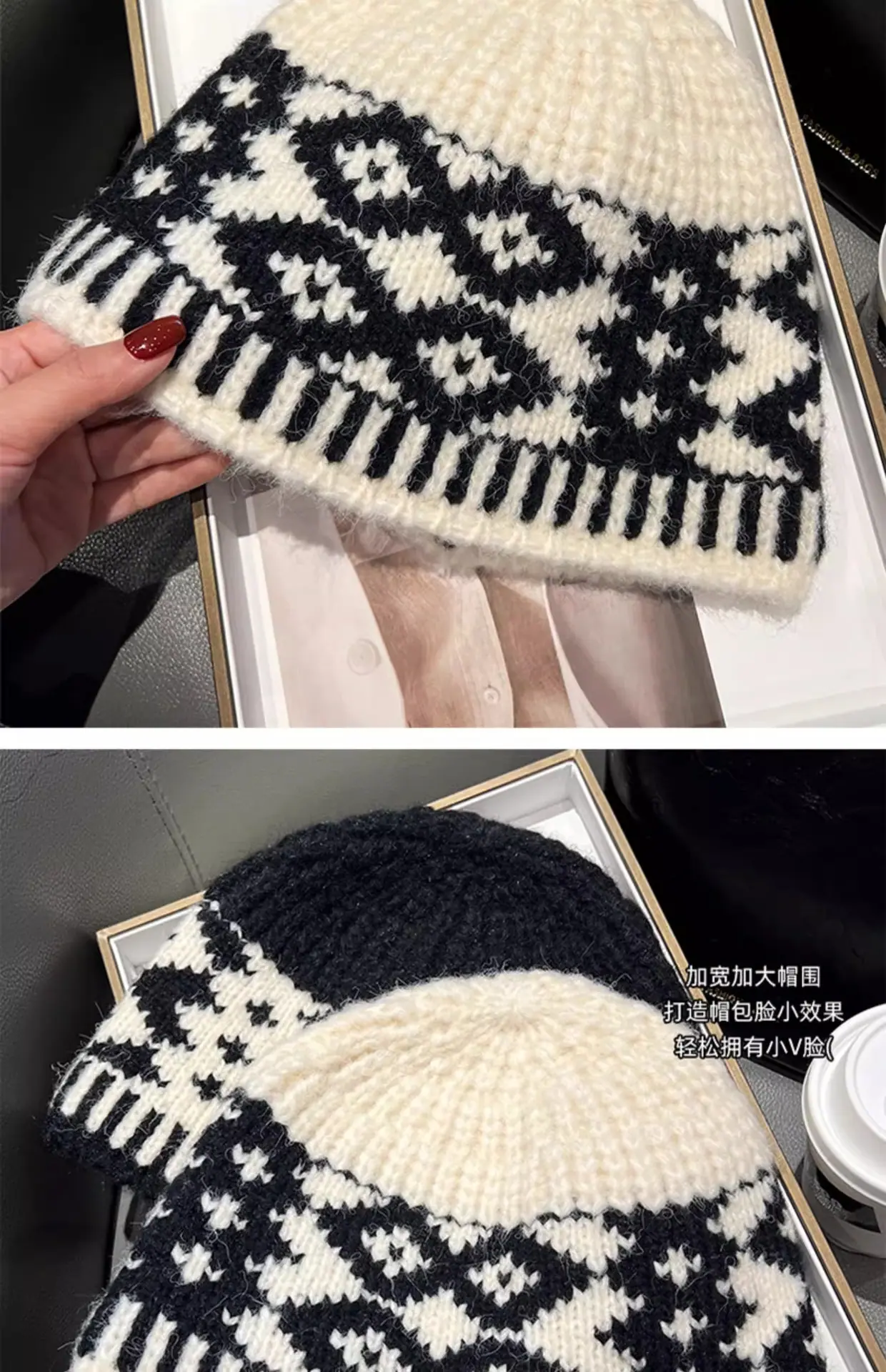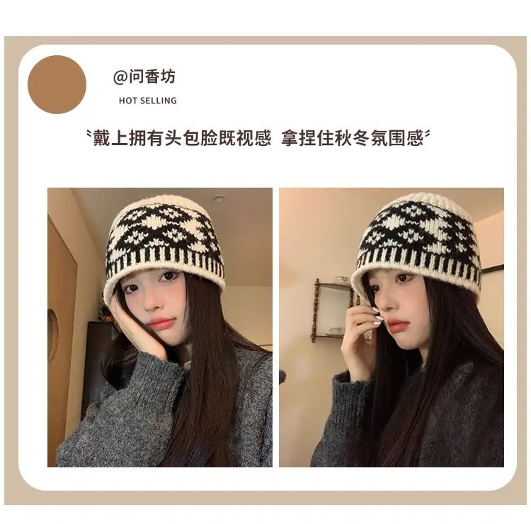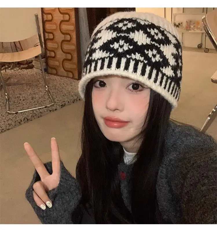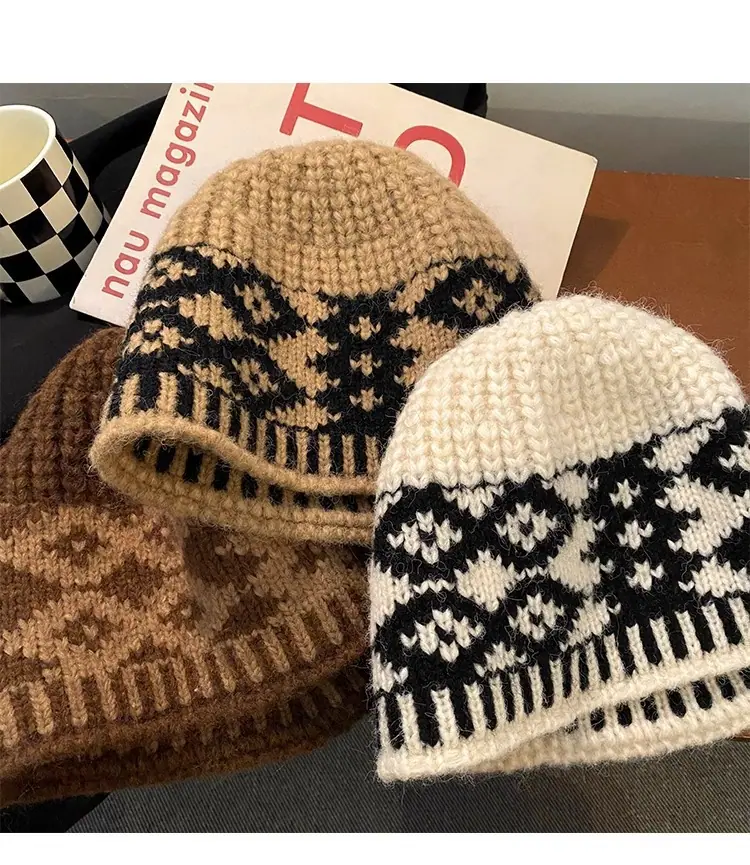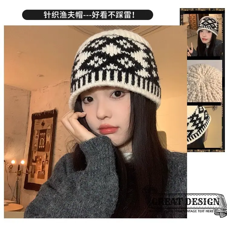 Gorro de Punto a Cuadros con Patrón de Diamantes Vintage para Mujer, Estilo Nicho Otoño e Invierno, Gorro Cálido y a Prueba de Frío