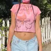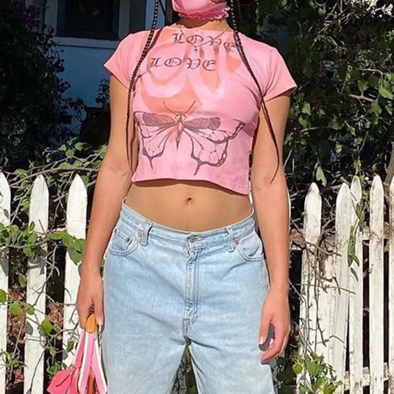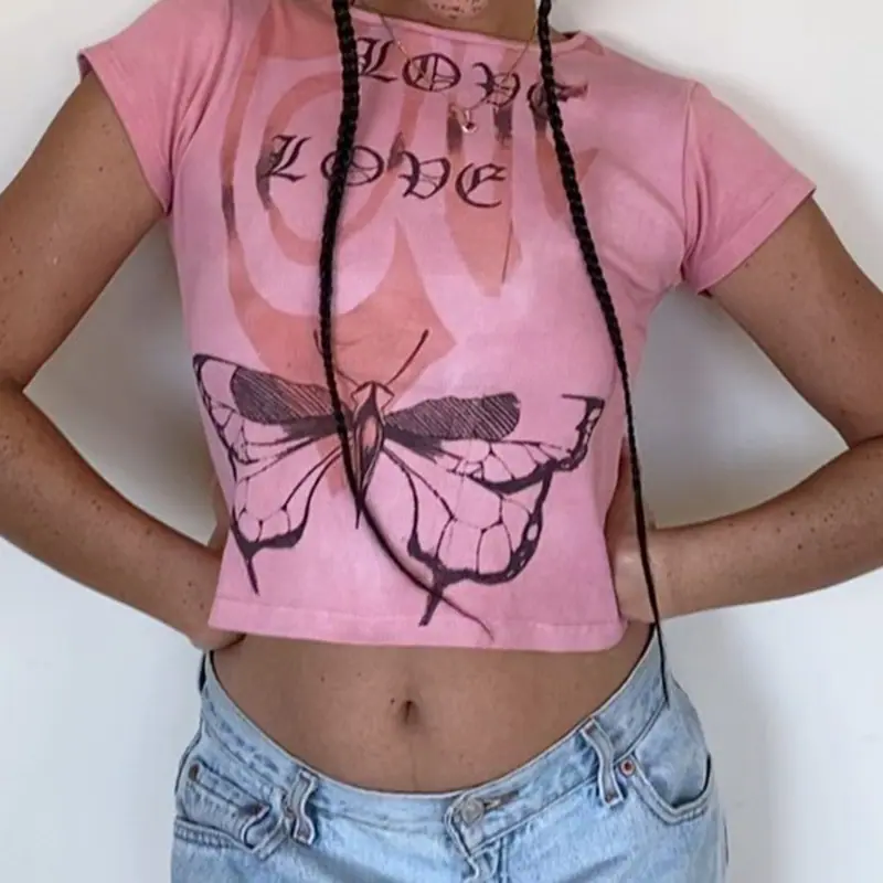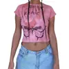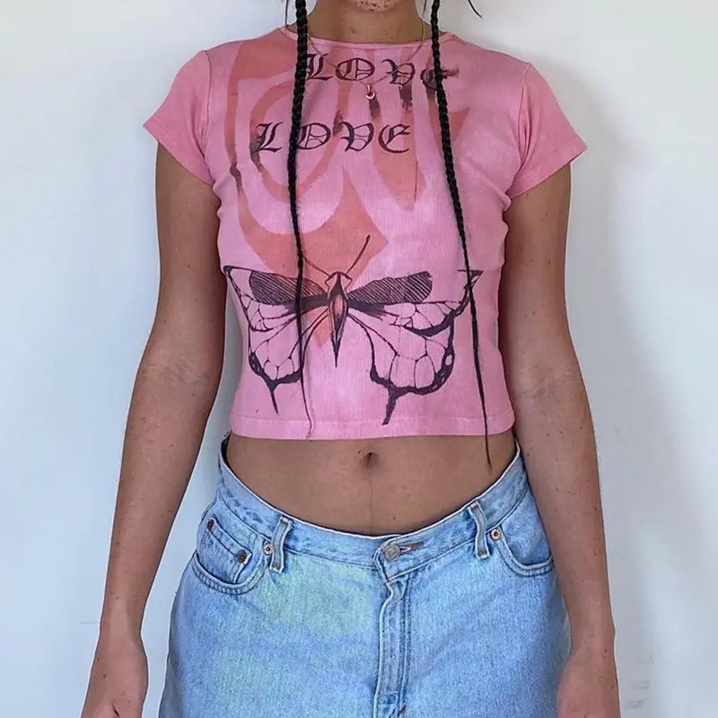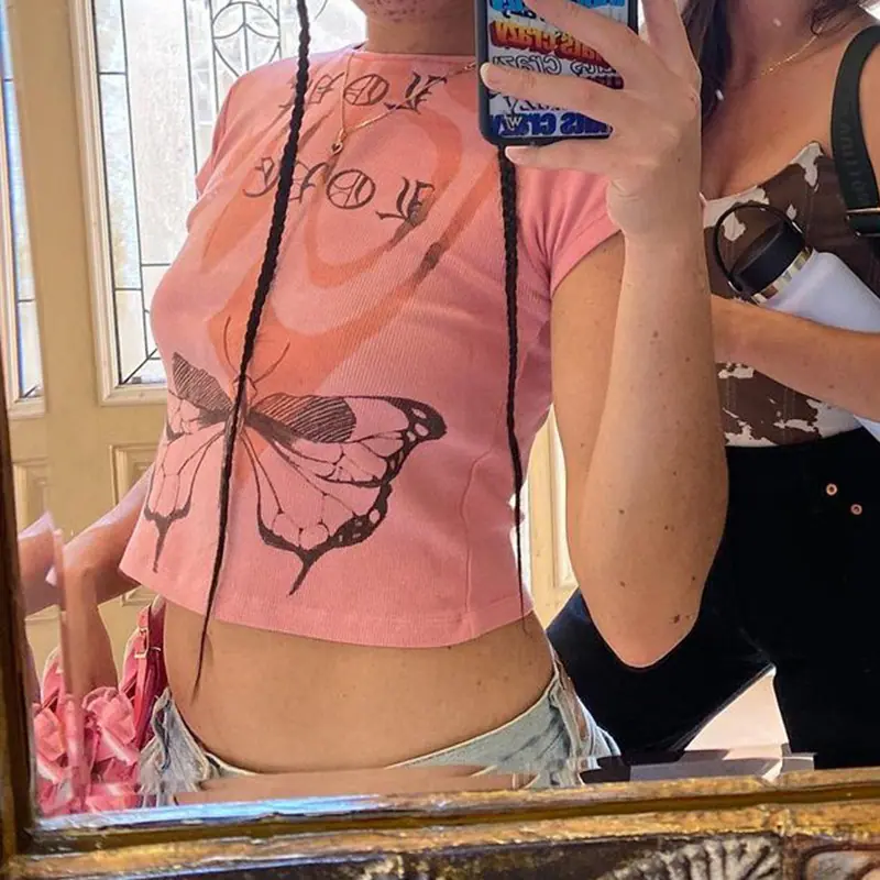 2025 Verano Nuevo Estampado de Mariposa Personalidad Calle Chica Caliente Retro Camiseta Manga Corta Casual Cuello Redondo Ajuste Entallado Ropa de Mujer