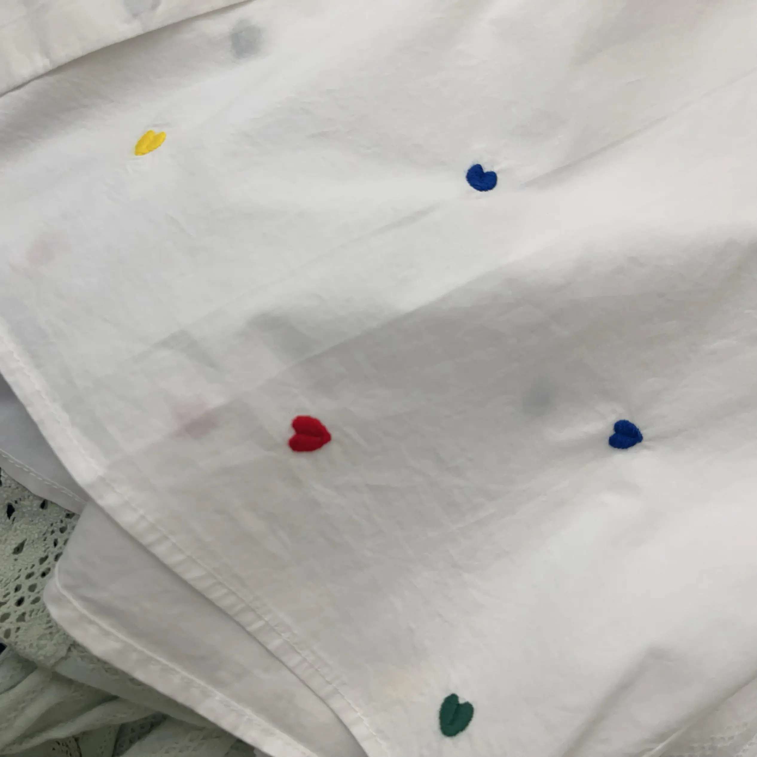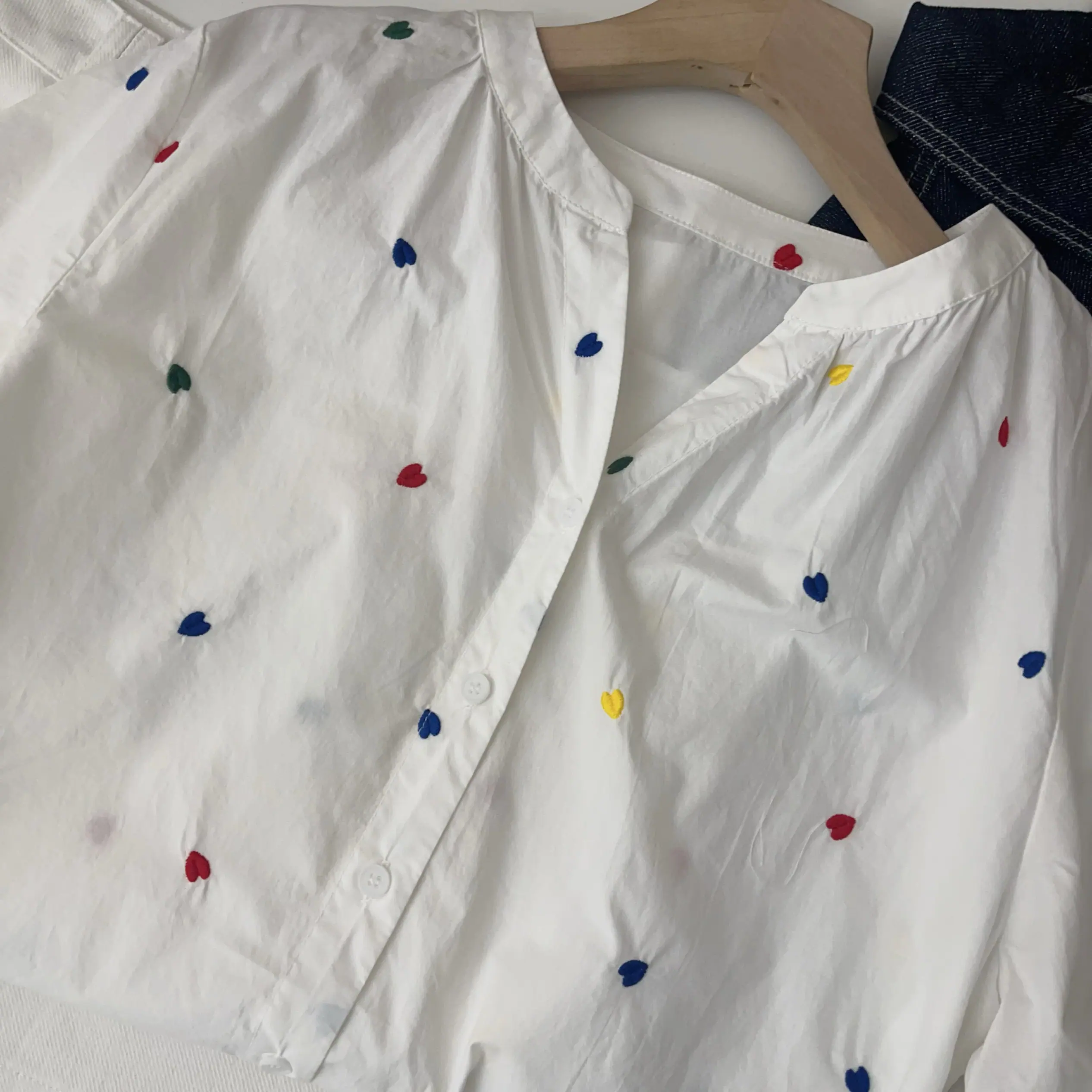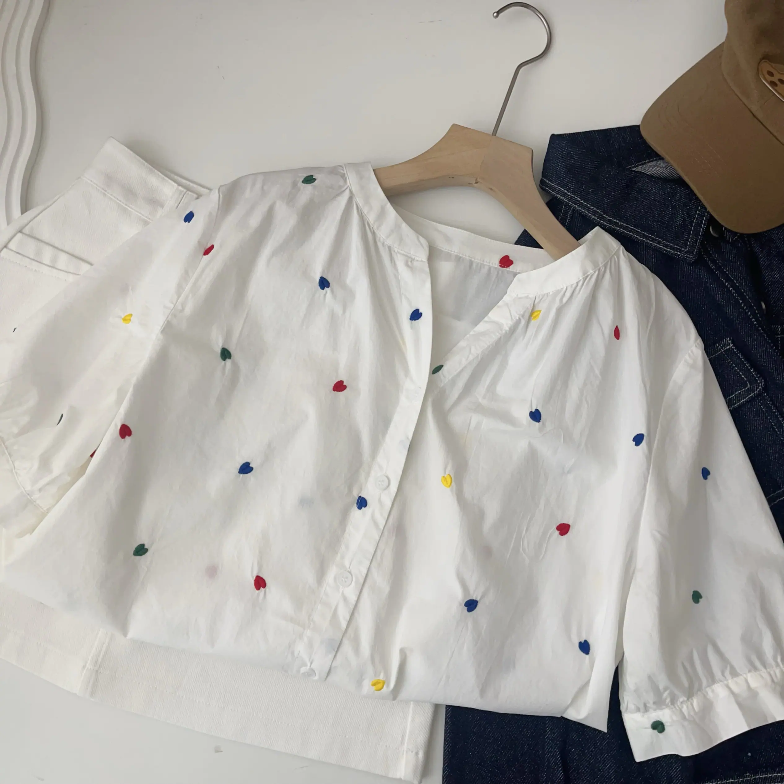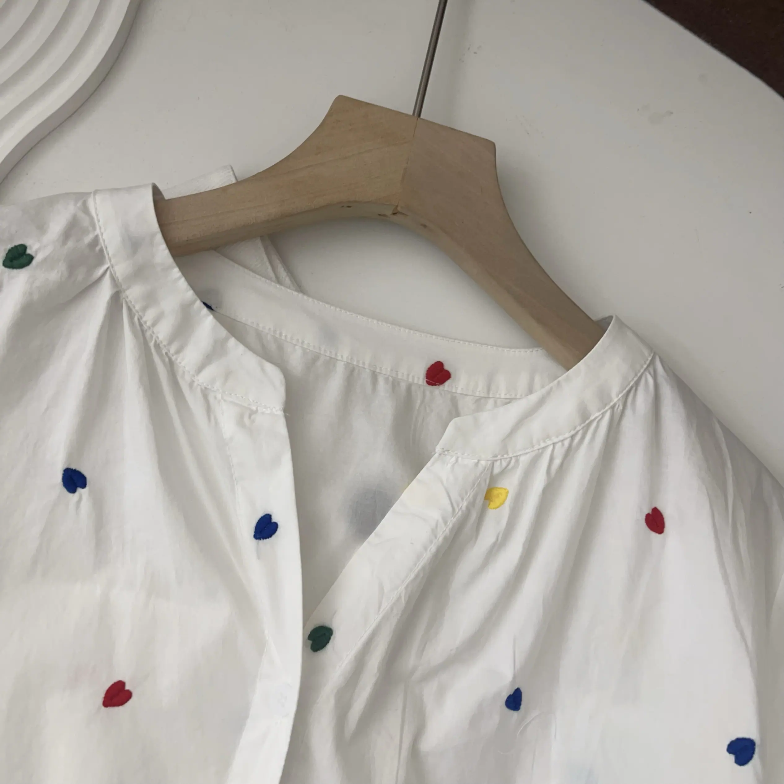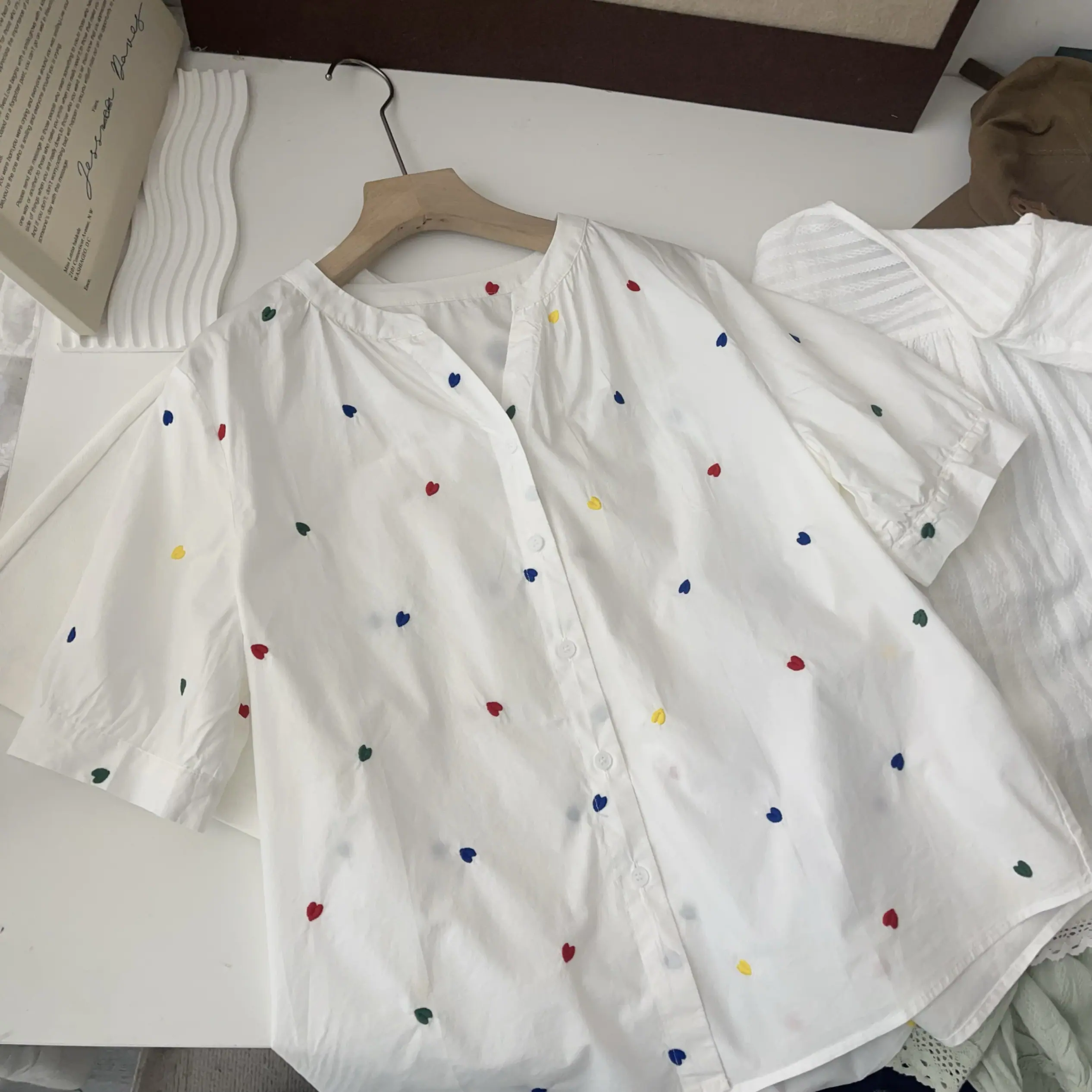 Camisa de Algodón con Bordado de Corazón, Cuello en V Abotonada 2025 Verano Nuevo Estilo Dulce Camisa de Manga Tres Cuartos Trendy Transfronteriza