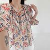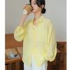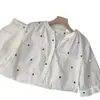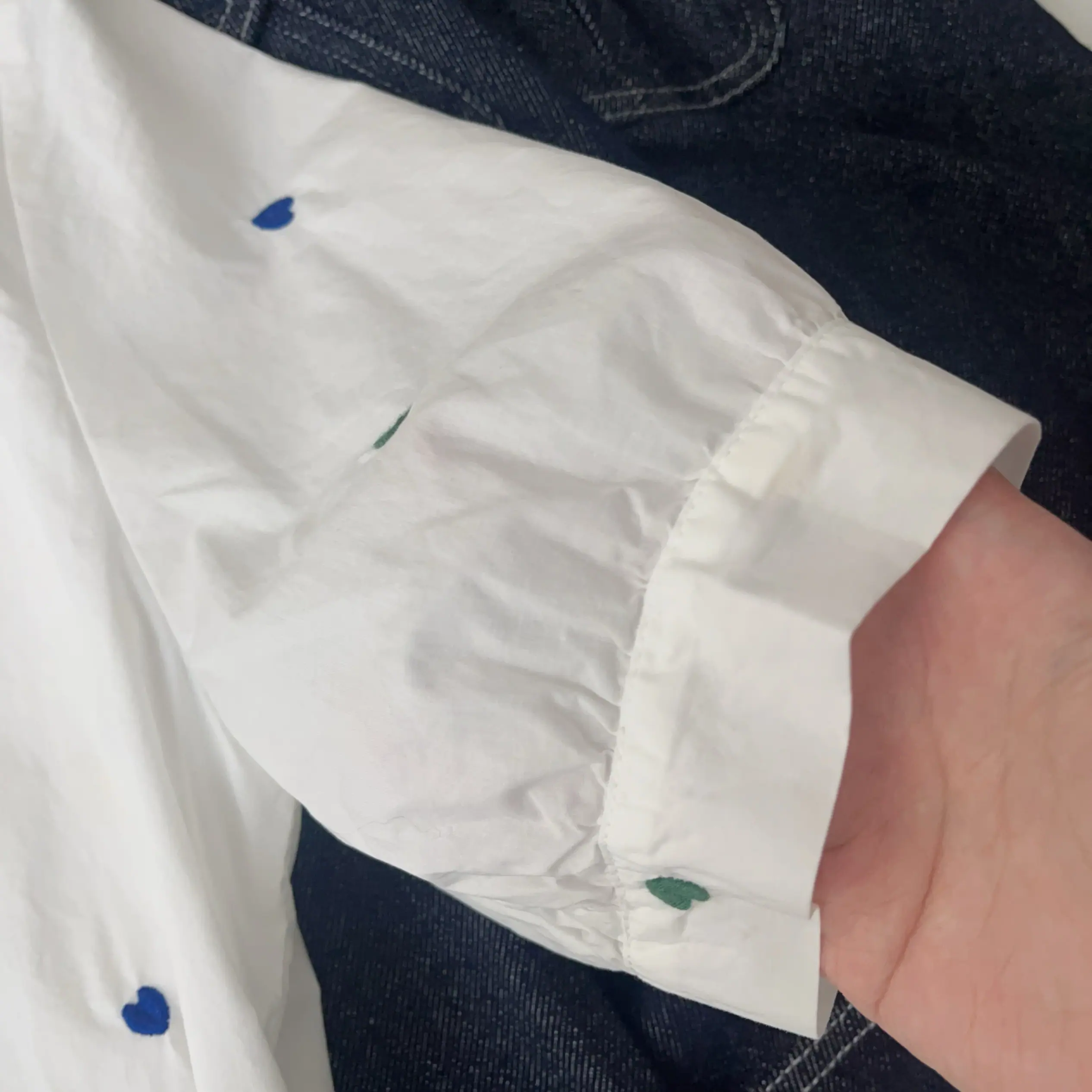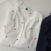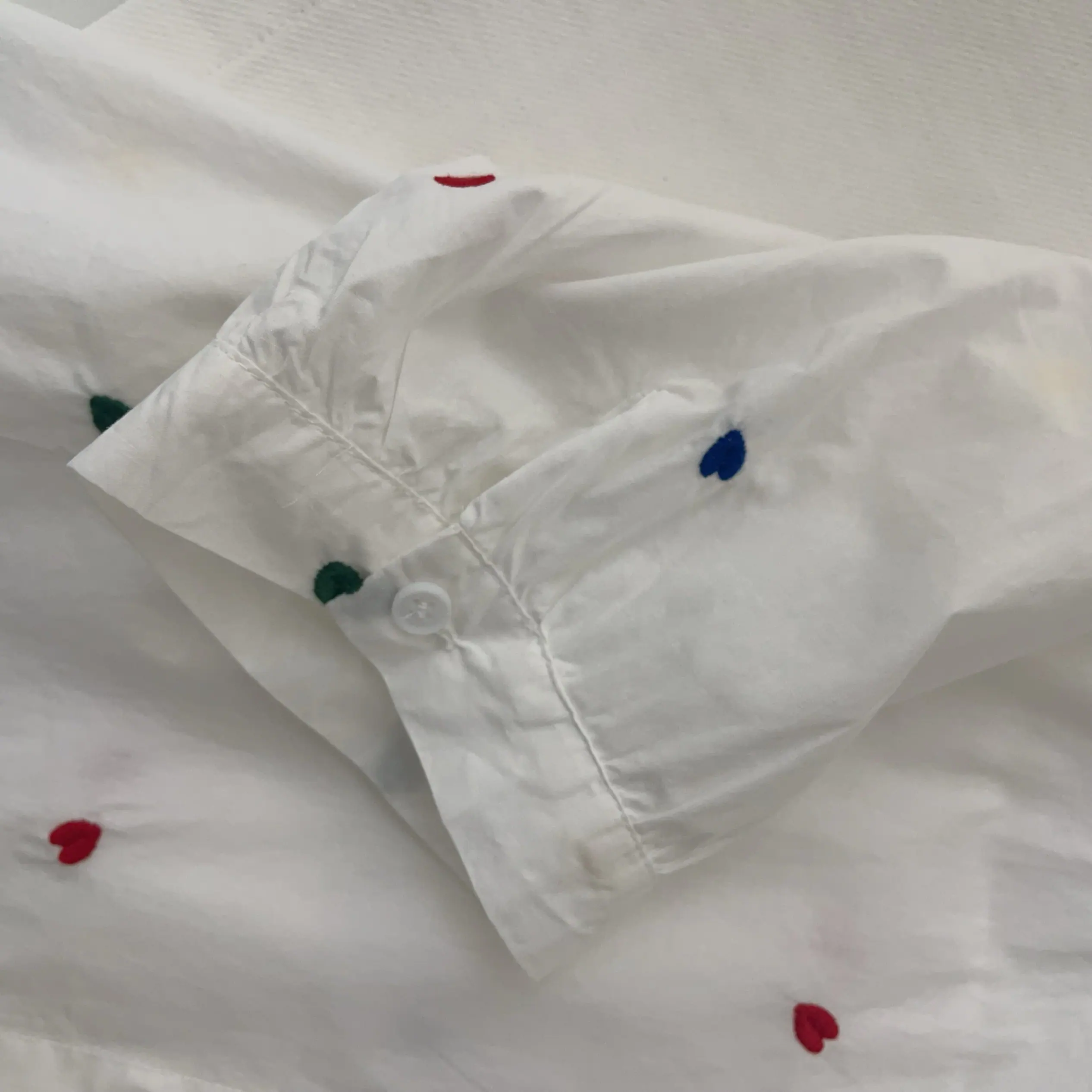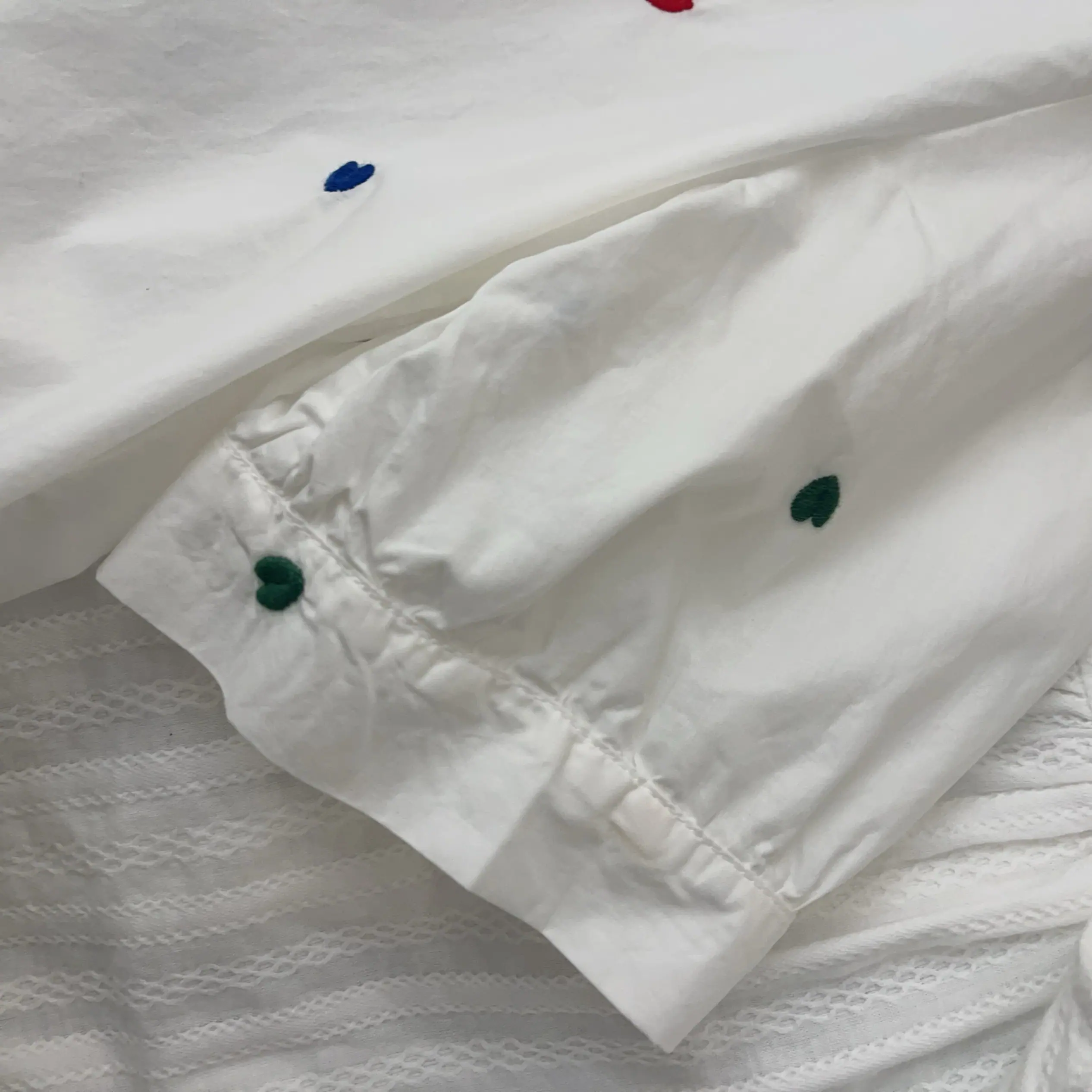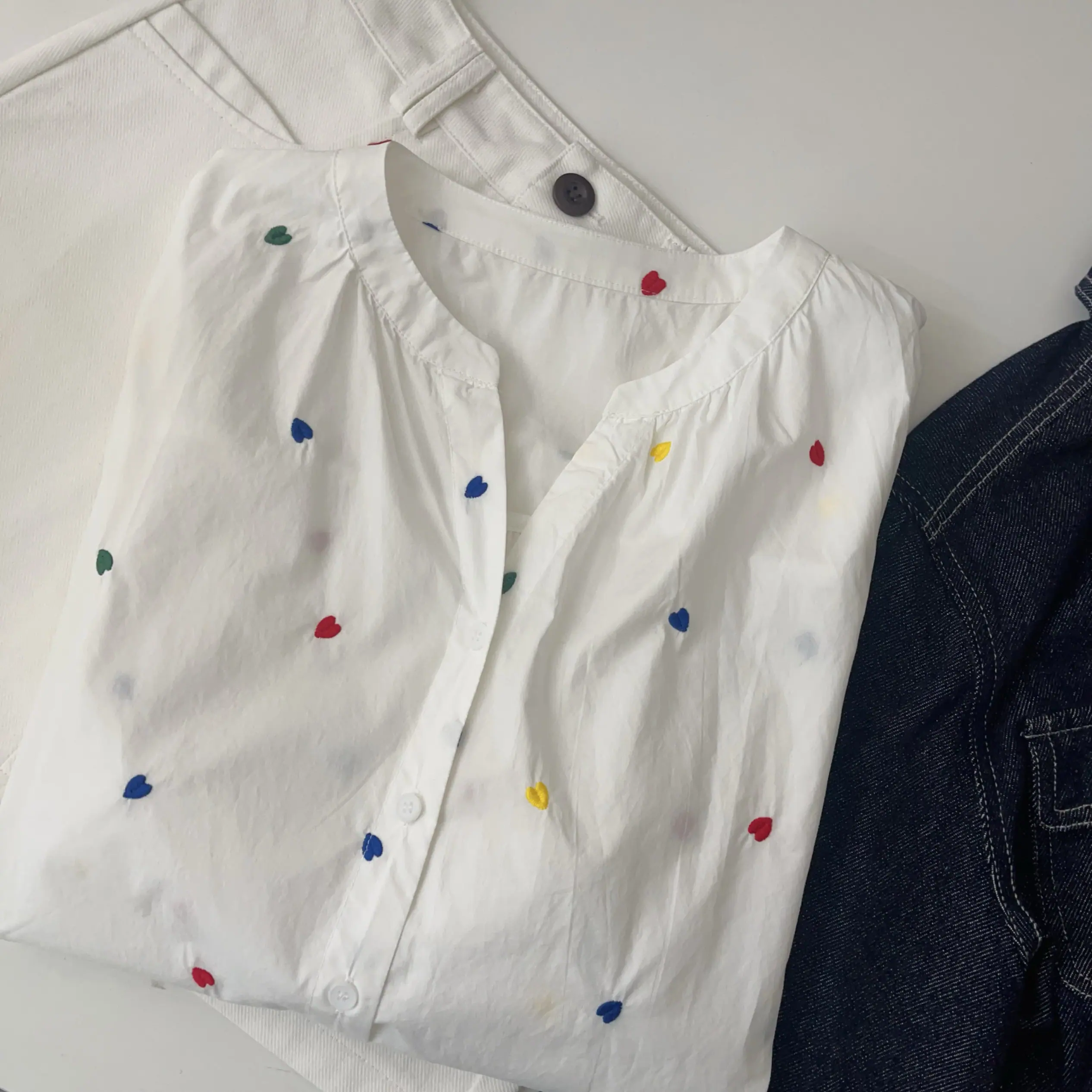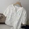 Camisa de Algodón con Bordado de Corazón, Cuello en V Abotonada 2025 Verano Nuevo Estilo Dulce Camisa de Manga Tres Cuartos Trendy Transfronteriza