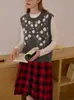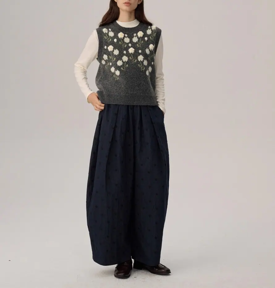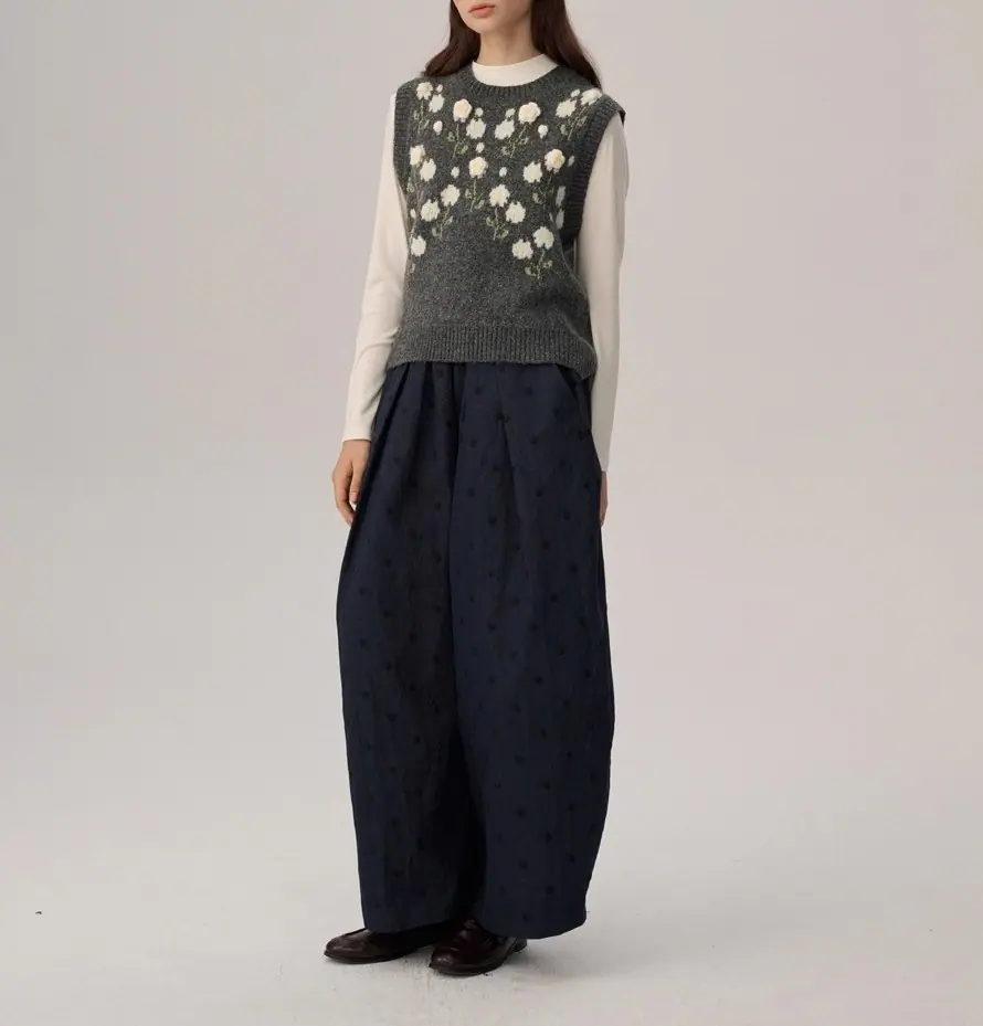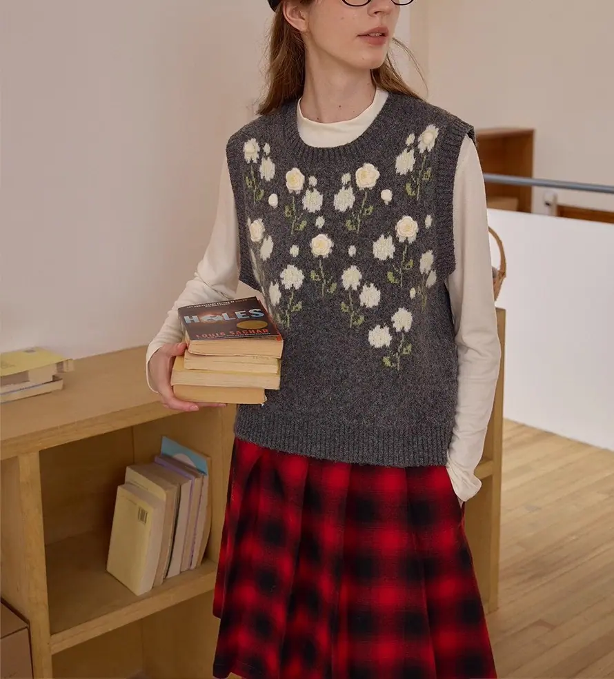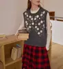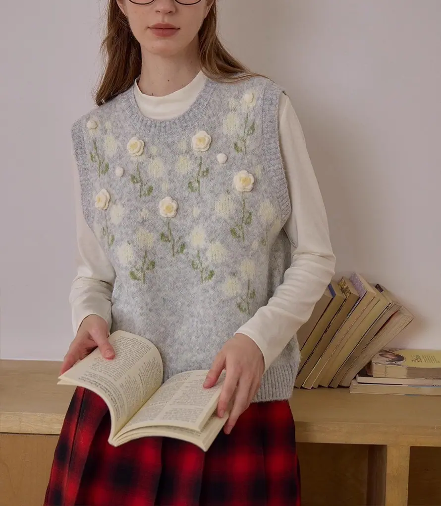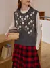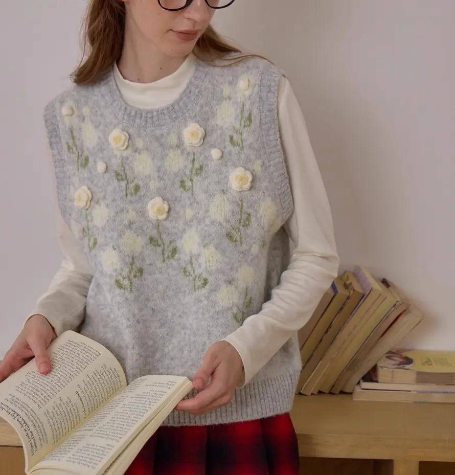 Suéter Gris de Cuello Redondo con Flor Pequeña, Bordado de Flores Tridimensionales, Tejido de Punto para Mujer, Chaleco de Punto en Capas