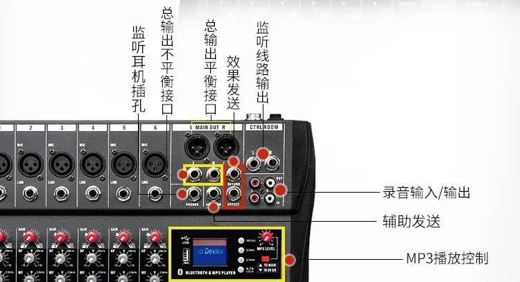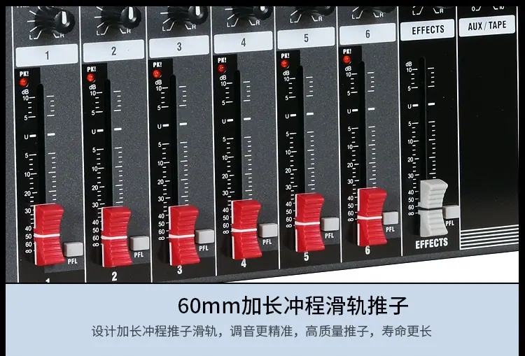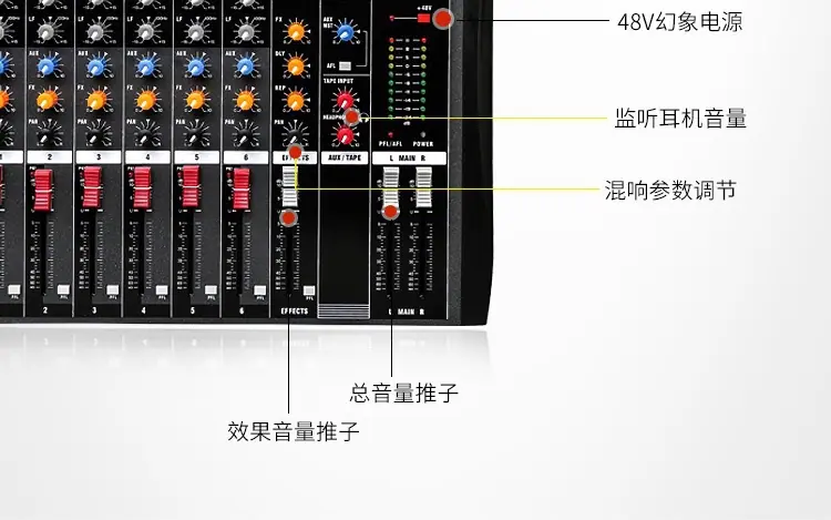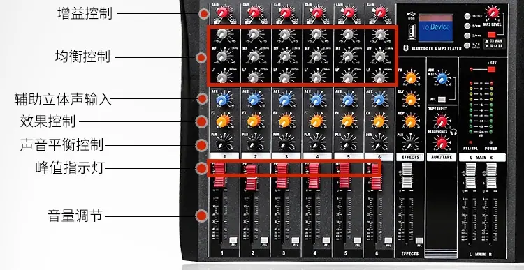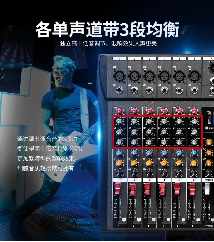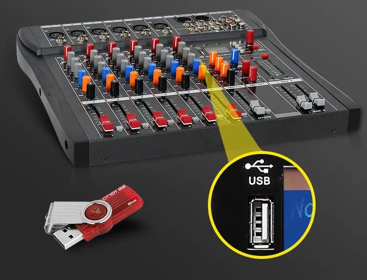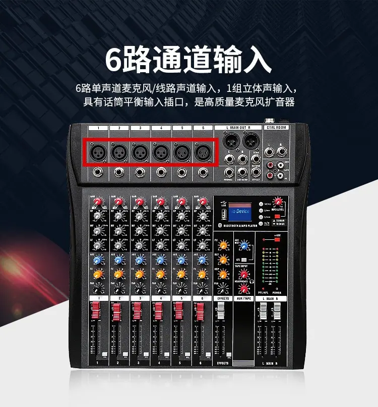 Etapa mezcladora de 6 canales gran rendimiento karaoke con efecto de reverberación USB Bluetooth puede monitorear sintonizador profesional de 6 canales