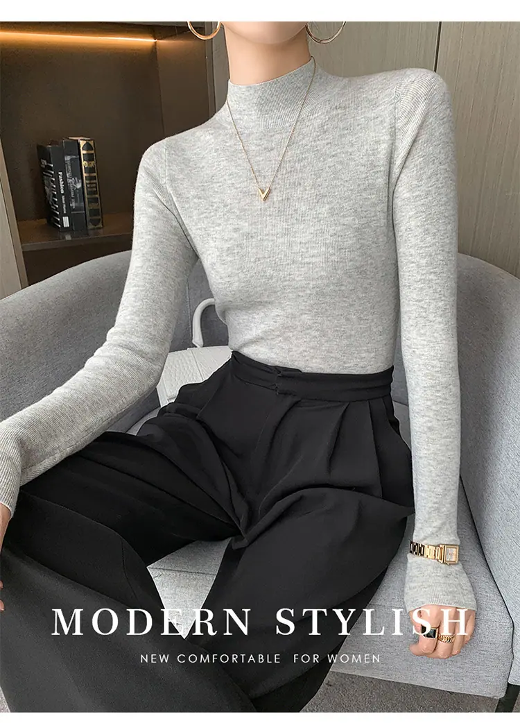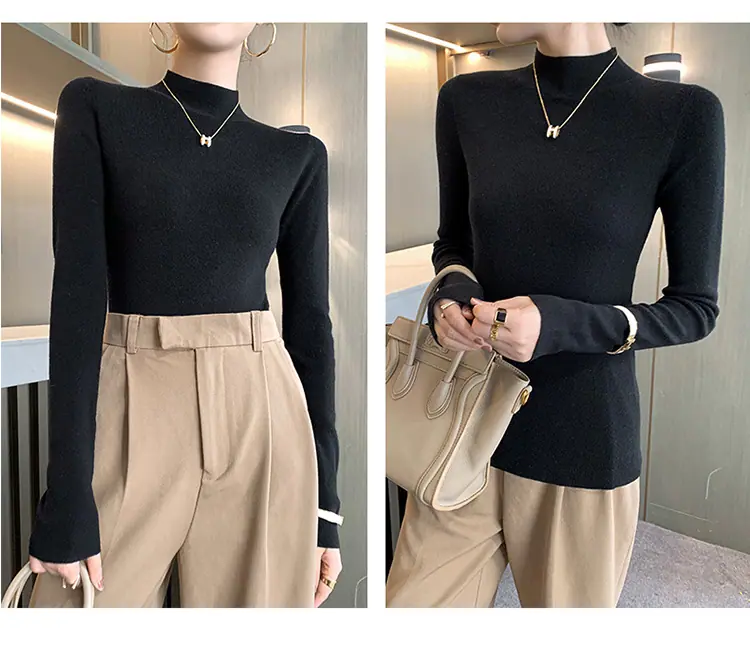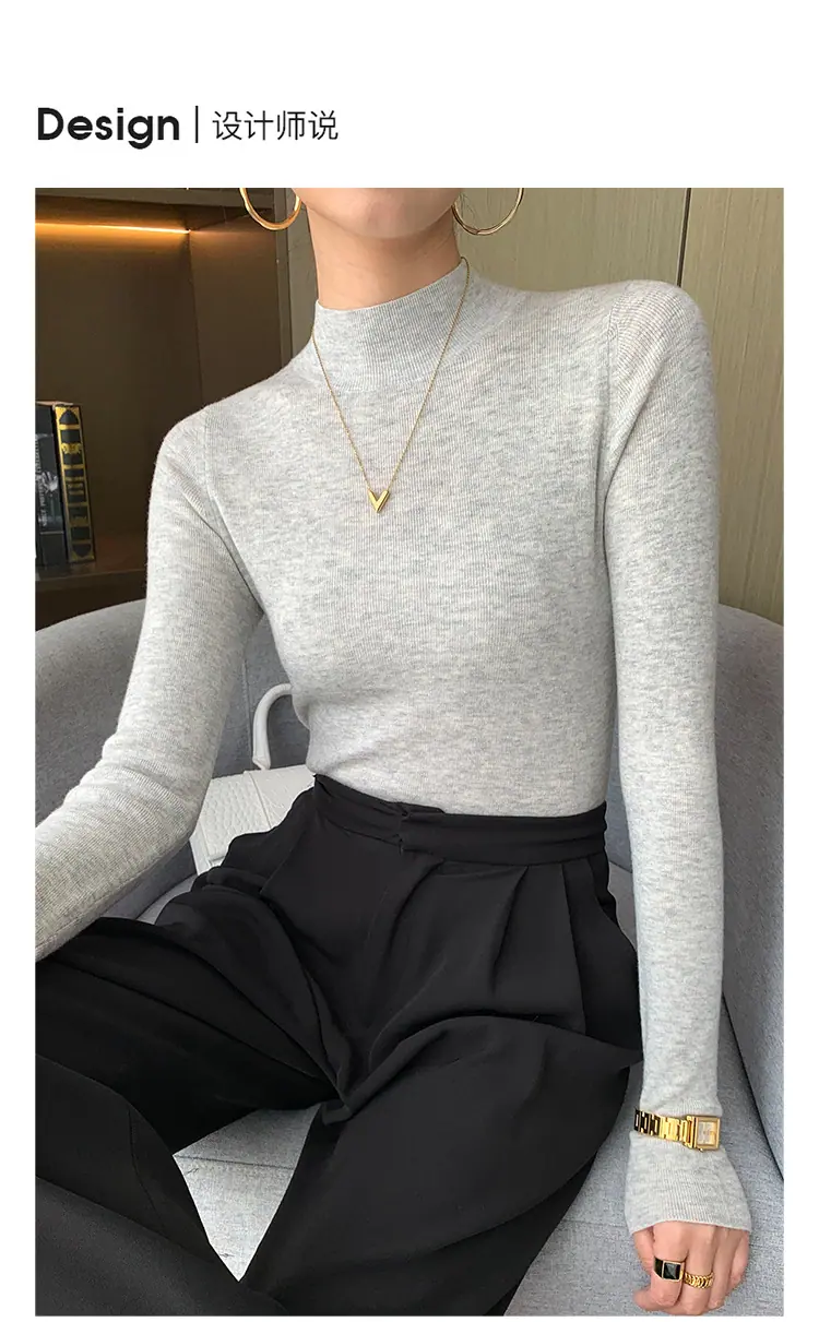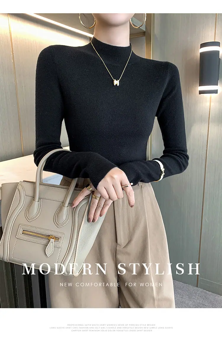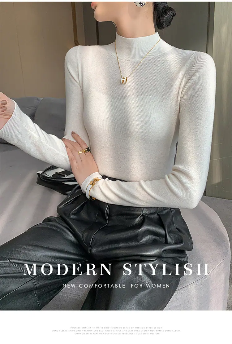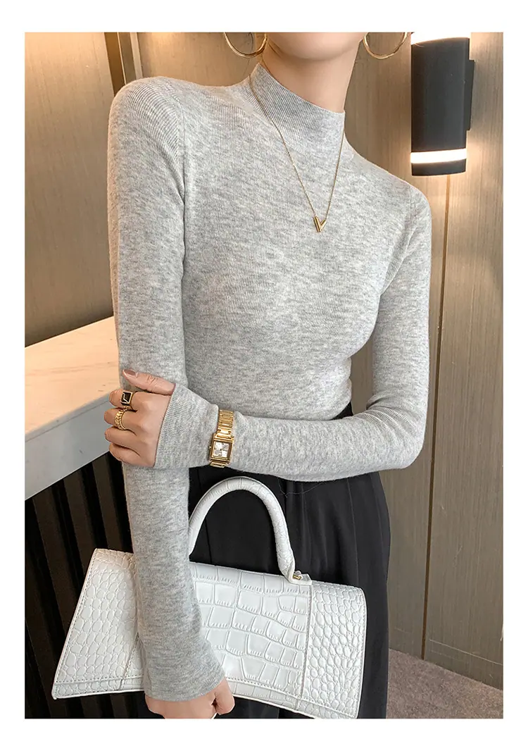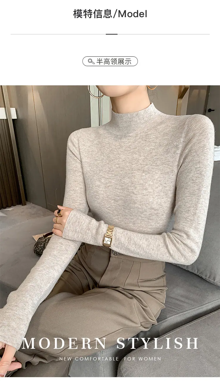 Suéter de mujer de punto de lana peinada de color sólido liso de cuello alto medio, primavera 2023, manga larga, ajustado, adelgazante