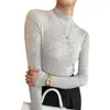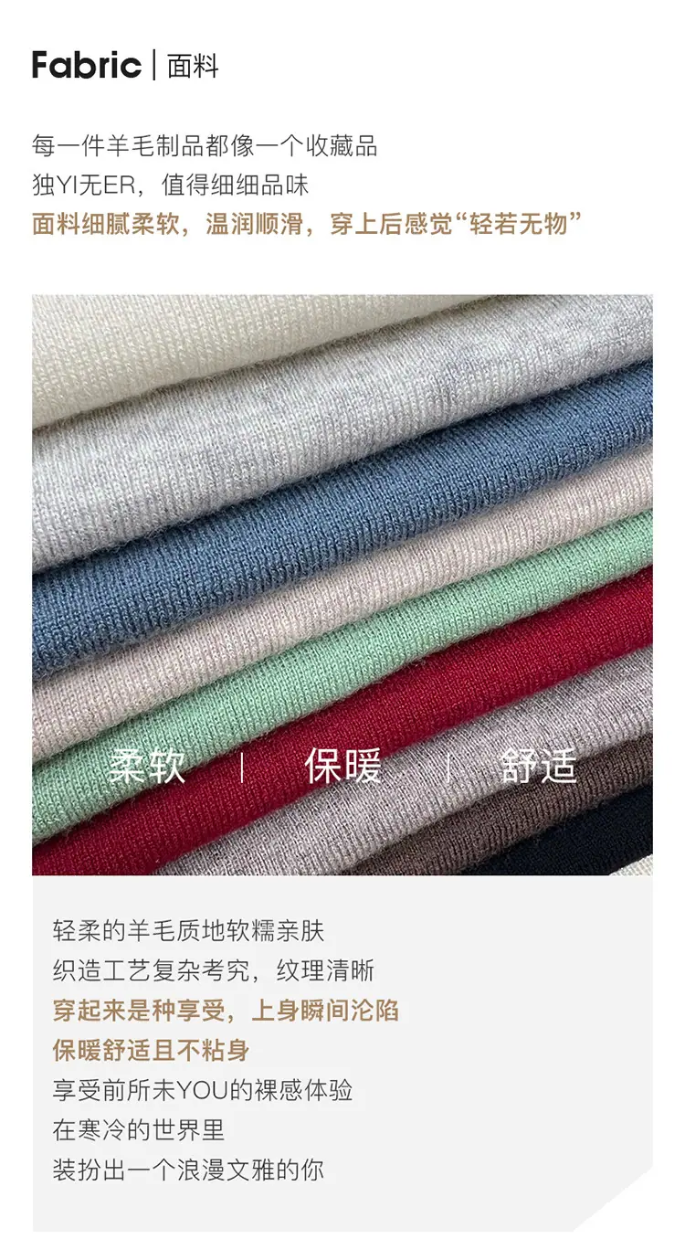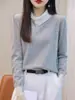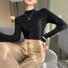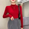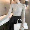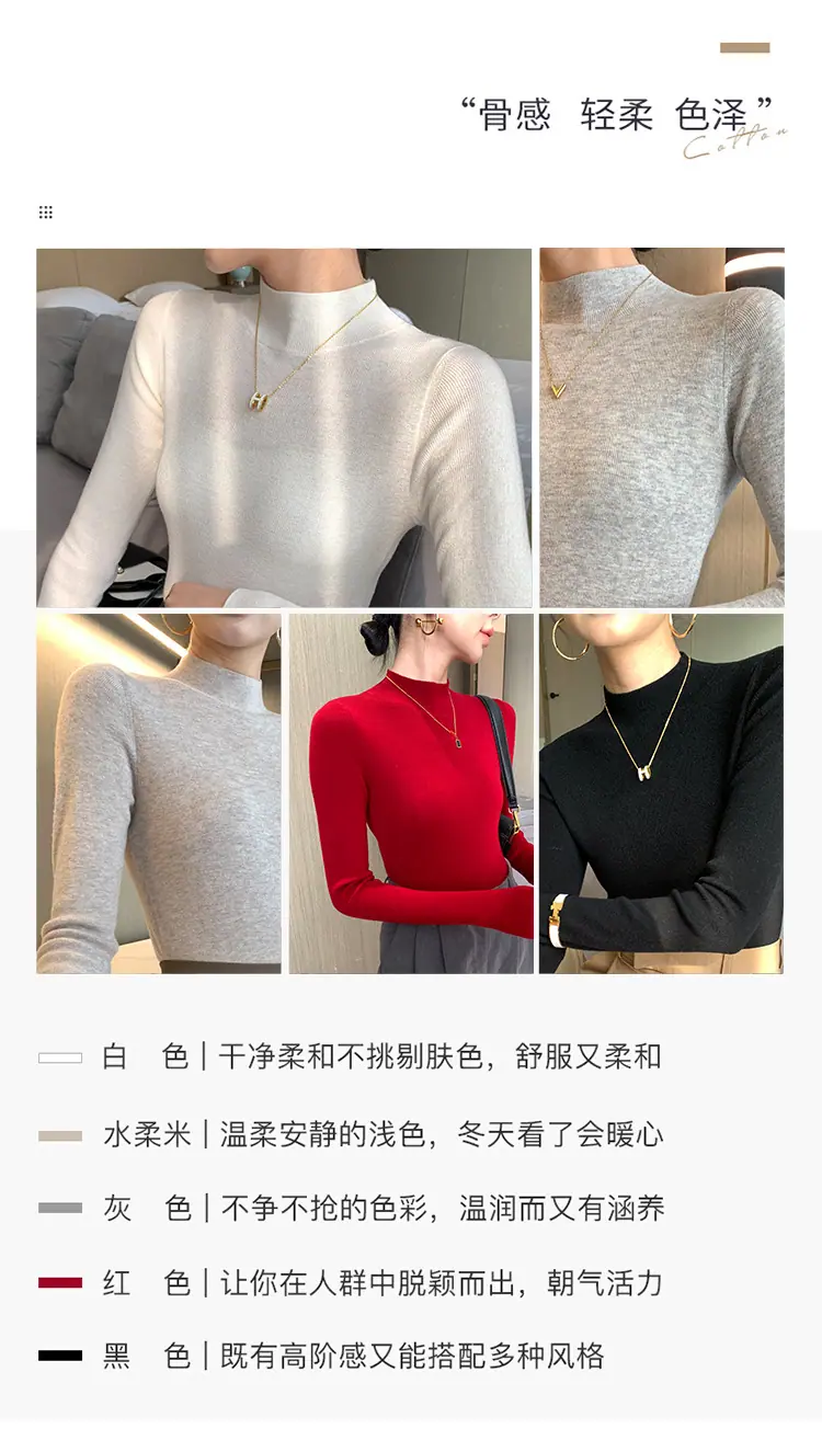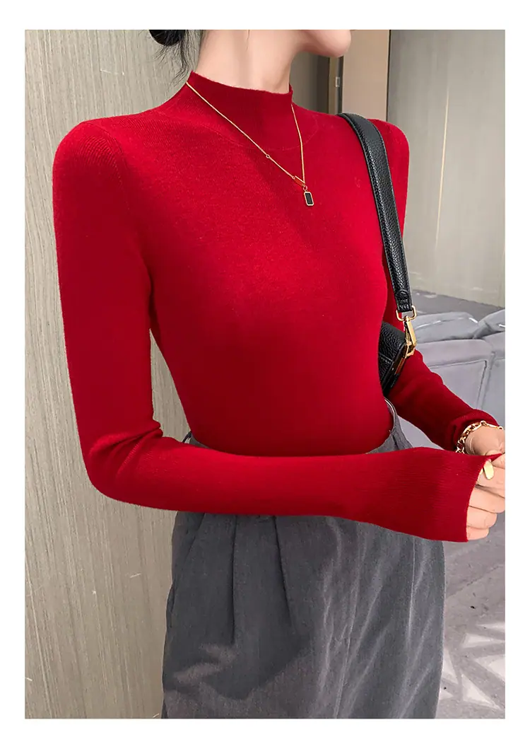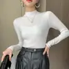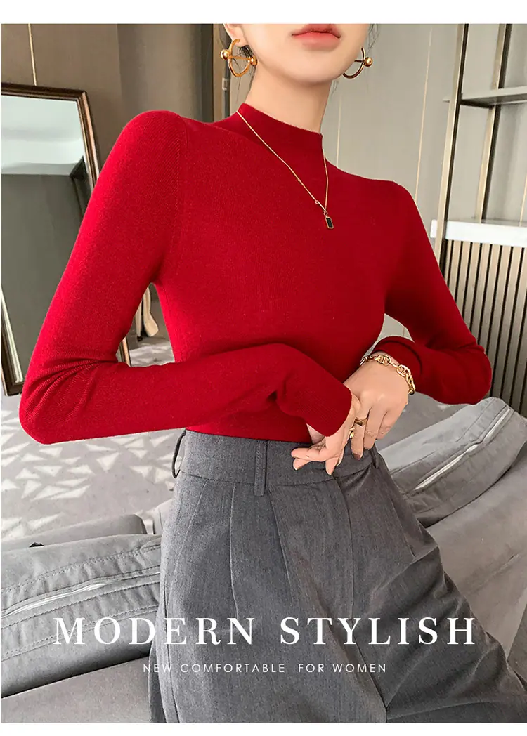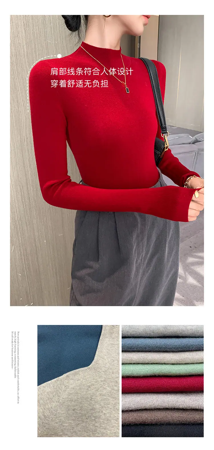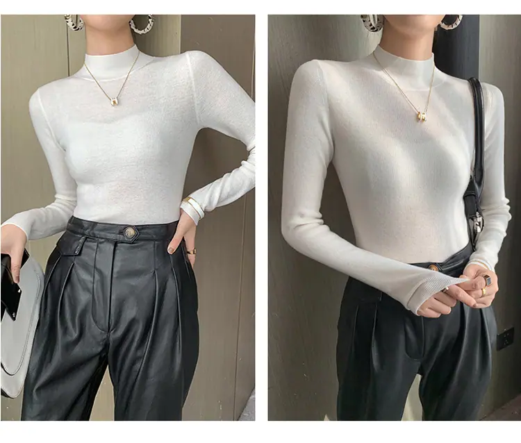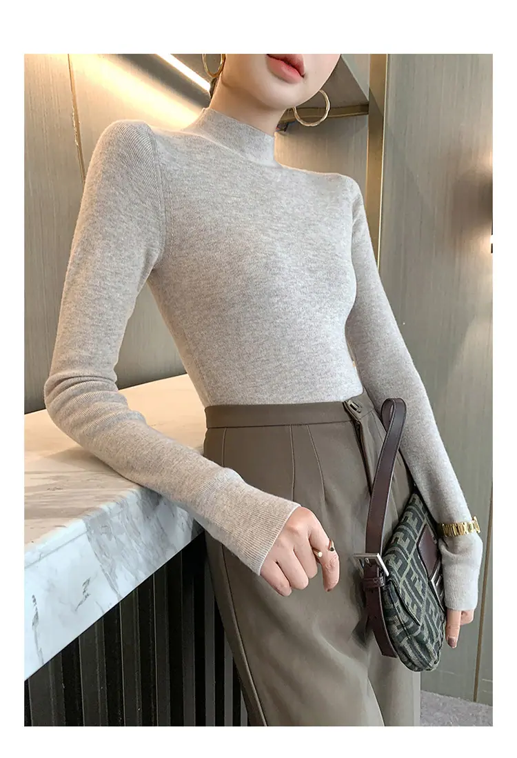 Suéter de mujer de punto de lana peinada de color sólido liso de cuello alto medio, primavera 2023, manga larga, ajustado, adelgazante